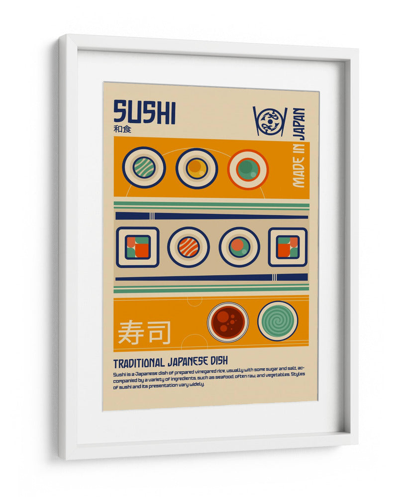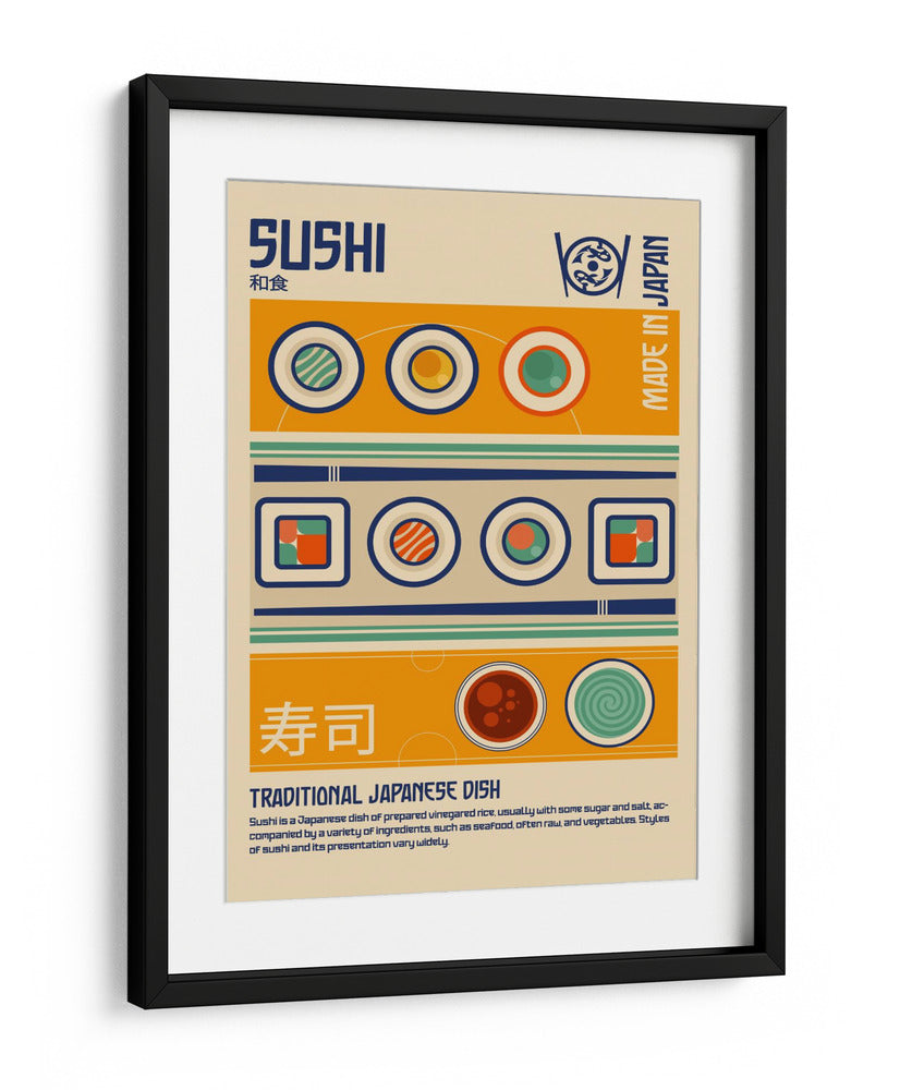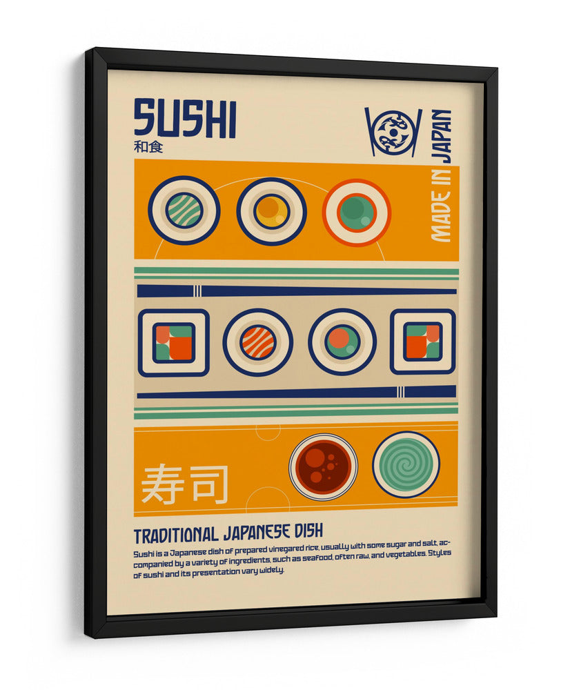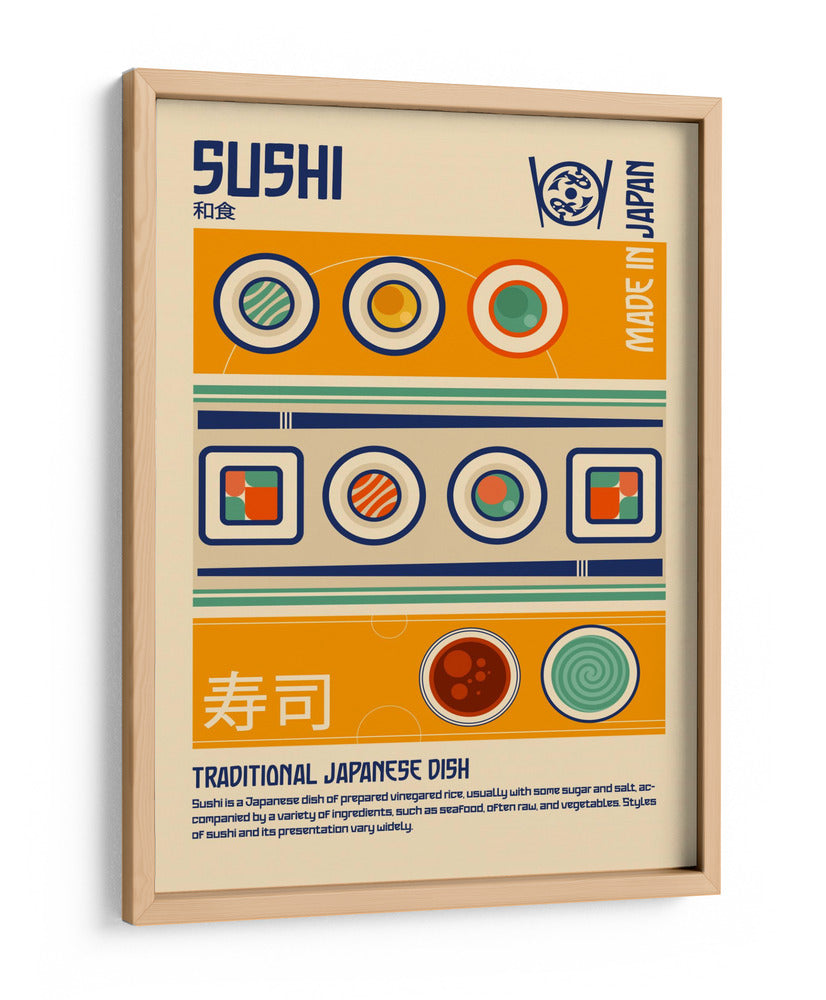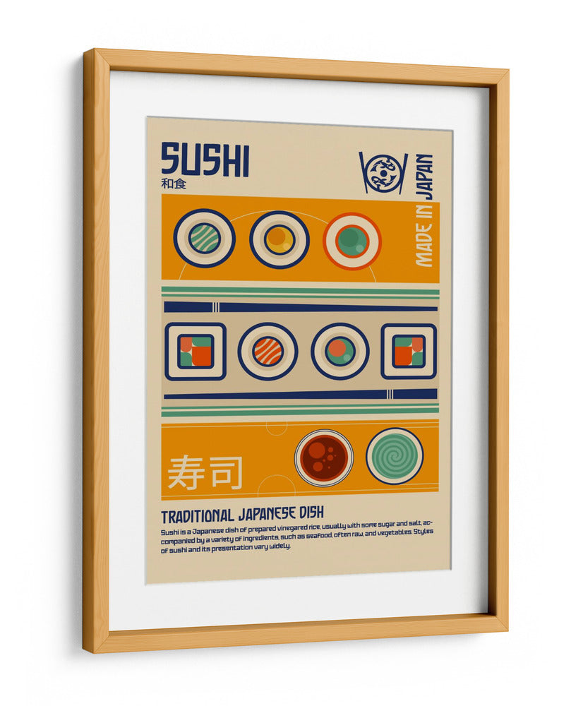 Transforma tu espacio con este vibrante cuadro decorativo de comida japonesa, centrado en la icónica presentación del sushi. La obra captura la esencia de esta delicia culinaria a través de un diseño gráfico audaz y una paleta de colores cálidos y terrosos, dominada por naranjas intensos, azules profundos y toques de verde y rojo. Estilizado con un enfoque retro y minimalista, este arte de pared evoca una sensación de nostalgia y aprecio por la cultura gastronómica japonesa. Las diferentes representaciones del sushi, desde nigiris estilizados hasta makis cuidadosamente presentados, junto con elementos gráficos que aluden a su origen "Made in Japan", crean una composición visualmente atractiva y llena de carácter. Ideal para cocinas, comedores o restaurantes que buscan añadir un toque de sofisticación y un guiño a la gastronomía asiática. Este cuadro es perfecto para quienes valoran el diseño limpio, los colores llamativos y un tema que inspira conversación y buen gusto. Añade un toque de sabor visual a tu decoración.