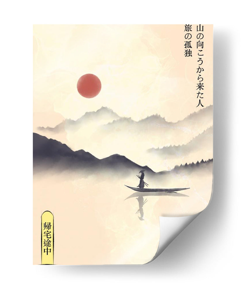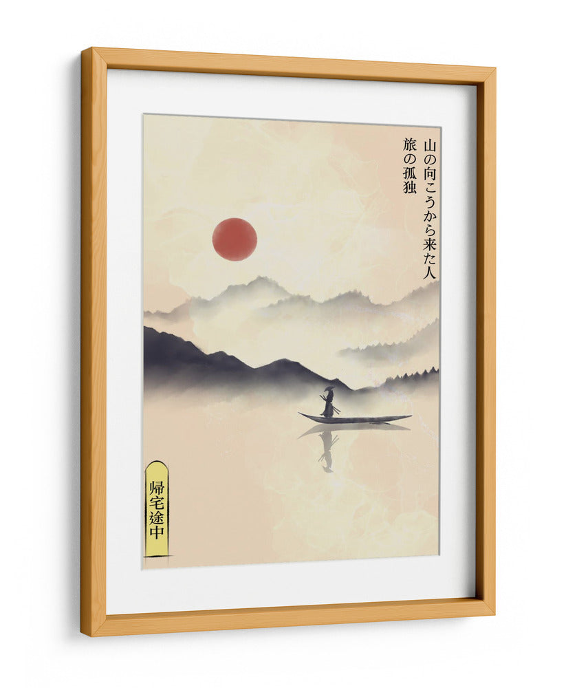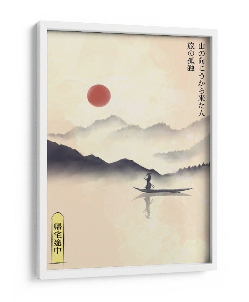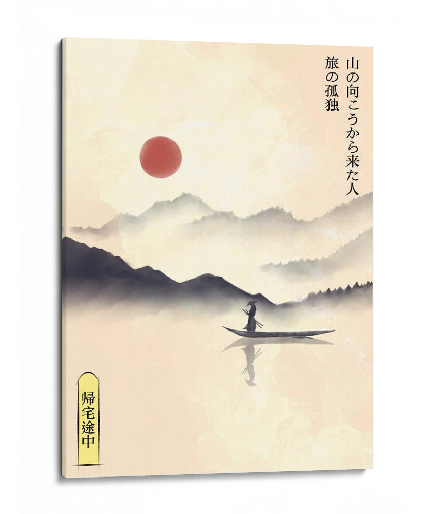 Sumérgete en la serenidad de "Hitori Viaje", una obra de arte digital que captura la esencia de la contemplación y la introspección. Esta pieza evoca un paisaje místico con montañas brumosas y un sol rojo vibrante, creando una atmósfera de paz y misterio. La figura solitaria en una barca, navegando sobre aguas tranquilas, invita a la reflexión sobre el viaje personal y la soledad productiva. Los tonos cálidos y suaves, combinados con las siluetas oscuras y nítidas de las montañas, crean un contraste visual cautivador. El estilo, inspirado en la estética oriental, utiliza pinceladas delicadas y una composición minimalista para resaltar la belleza de la simplicidad y la conexión con la naturaleza. Este cuadro decorativo es ideal para espacios que buscan transmitir calma y profundidad, como dormitorios, estudios o salas de meditación. "Hitori Viaje" no es solo una decoración, sino una invitación a la introspección, perfecta para añadir un toque de serenidad y significado a tu hogar u oficina, convirtiéndose en un punto focal que inspira paz interior.