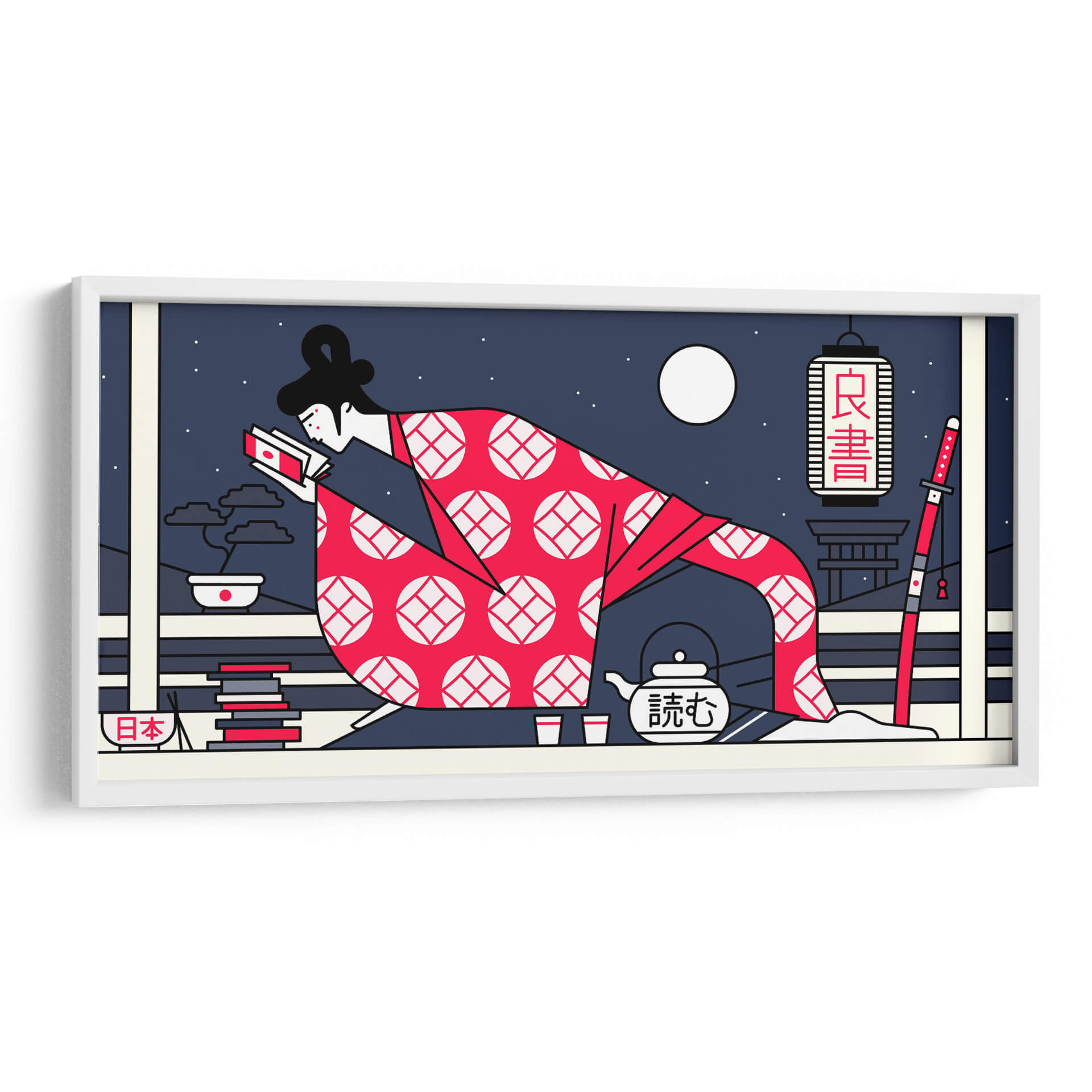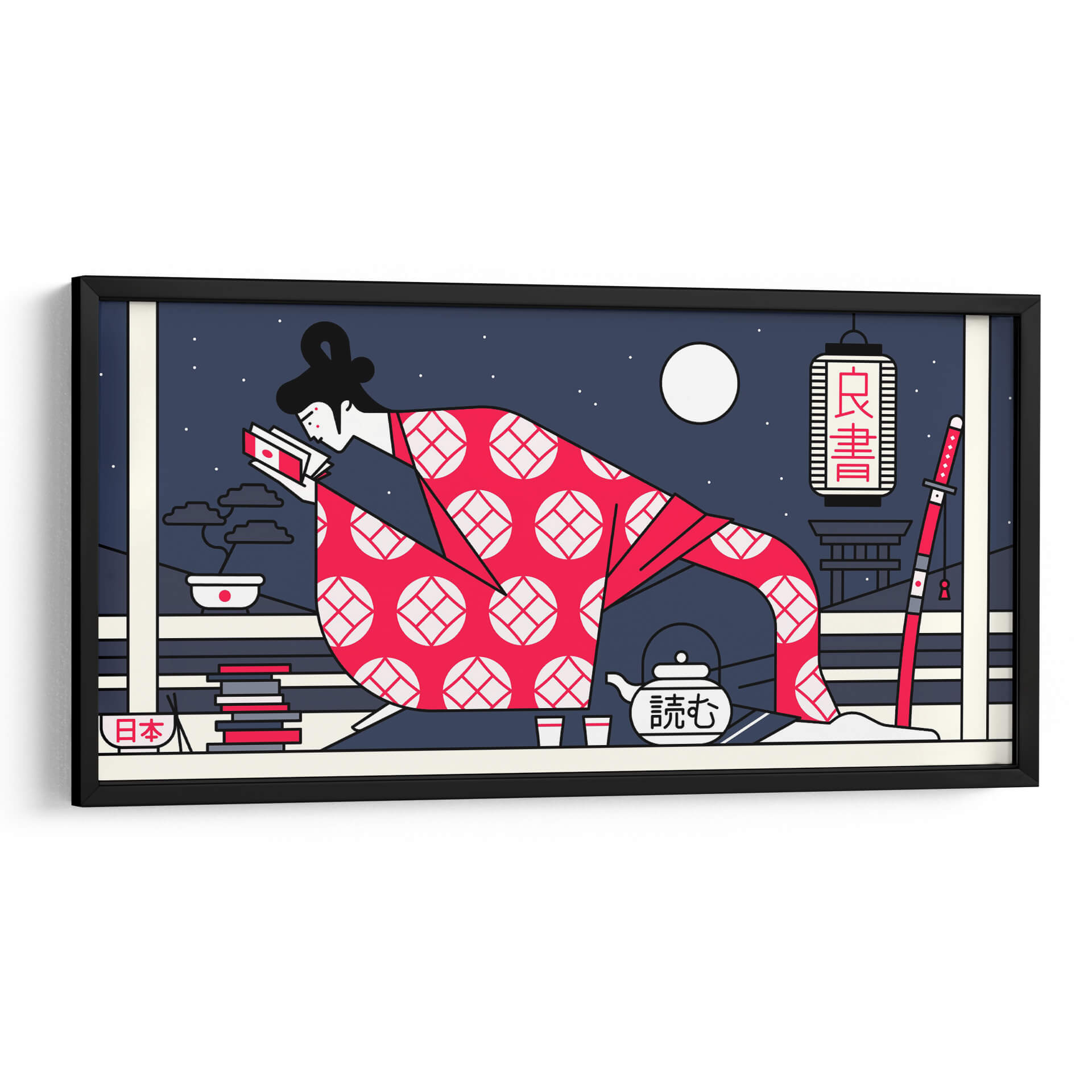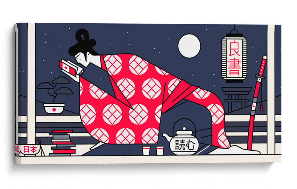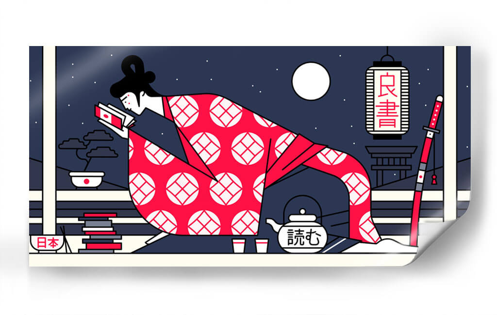 Sumérgete en la serenidad de la cultura japonesa con este cautivador cuadro decorativo 'Lectura japonesa'. La obra presenta a una figura vestida con un kimono vibrante de color rojo y blanco, absorta en la lectura de un libro, bajo un cielo estrellado y la suave luz de la luna. La composición evoca una atmósfera de paz y concentración, ideal para añadir un toque de tranquilidad y sofisticación a cualquier espacio. Los elementos tradicionales, como la linterna japonesa y la tetera, junto con la cuidada paleta de colores dominada por el azul profundo y el rojo llamativo, crean una pieza visualmente impactante. Este cuadro decorativo es perfecto para salones, dormitorios u oficinas, aportando una conexión con el arte y la cultura oriental. Su estilo gráfico y moderno, aunque inspirado en motivos tradicionales, lo convierte en un punto focal único que invita a la contemplación y al disfrute estético, transformando tu hogar en un santuario de calma y estilo. Una elección excelente para quienes buscan arte de pared que cuente una historia y transmita emociones.