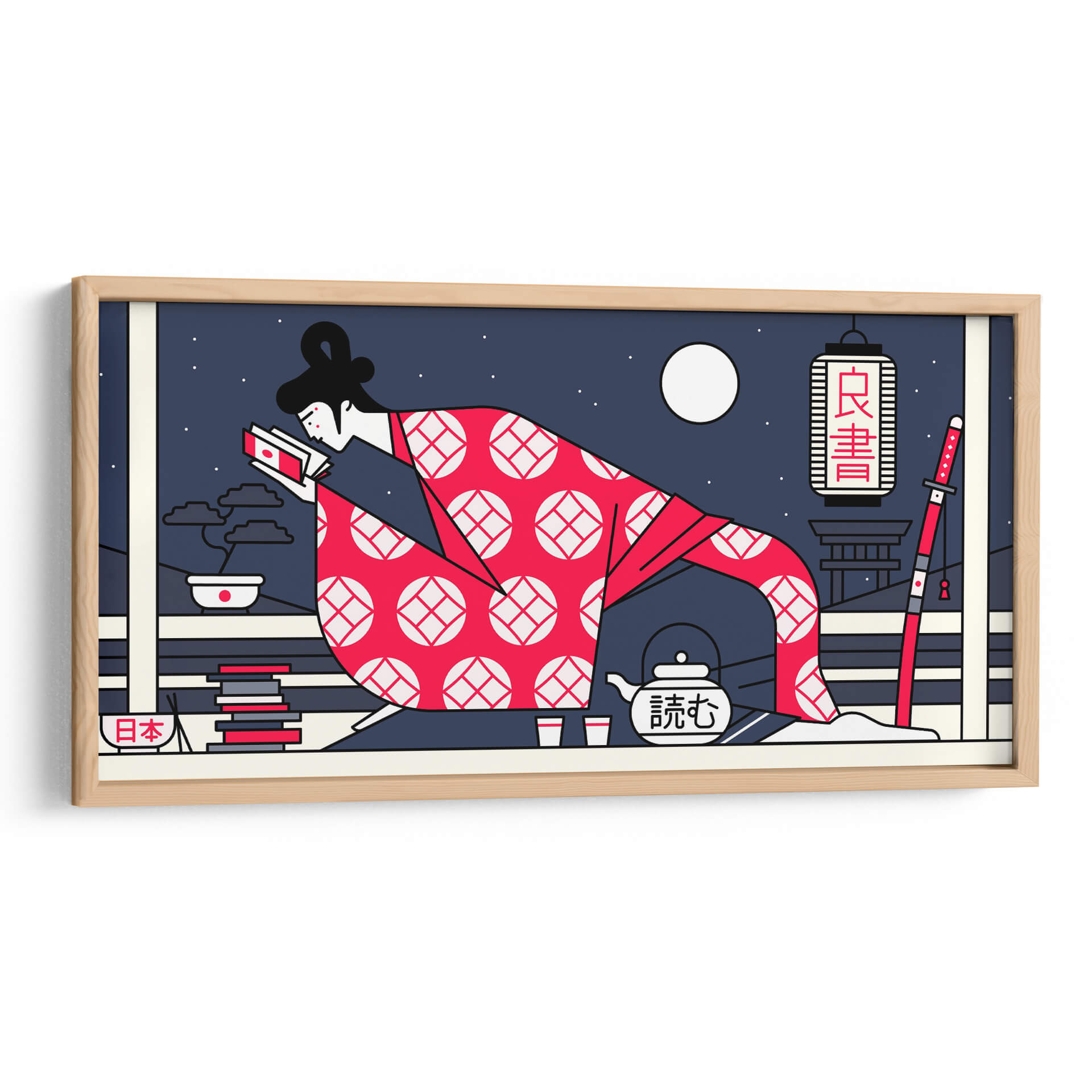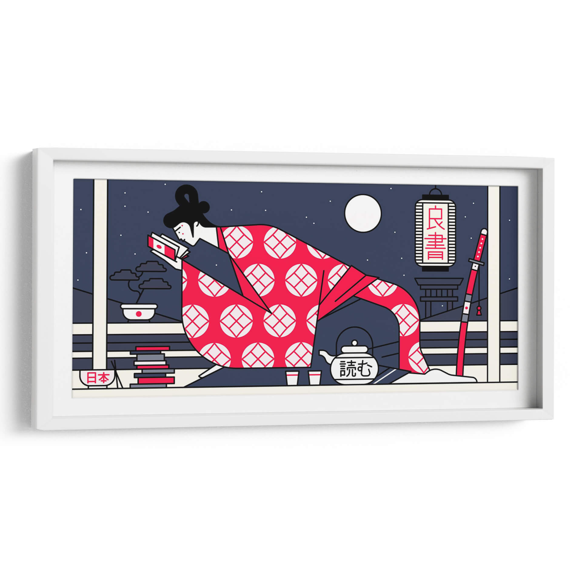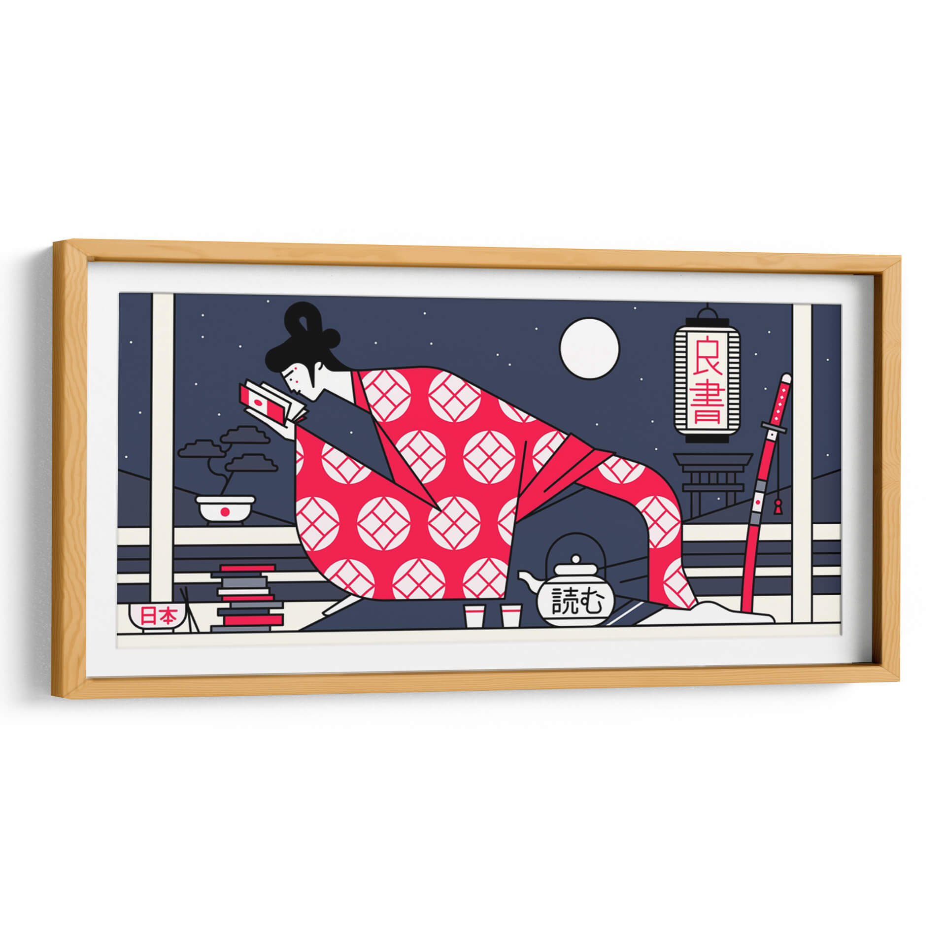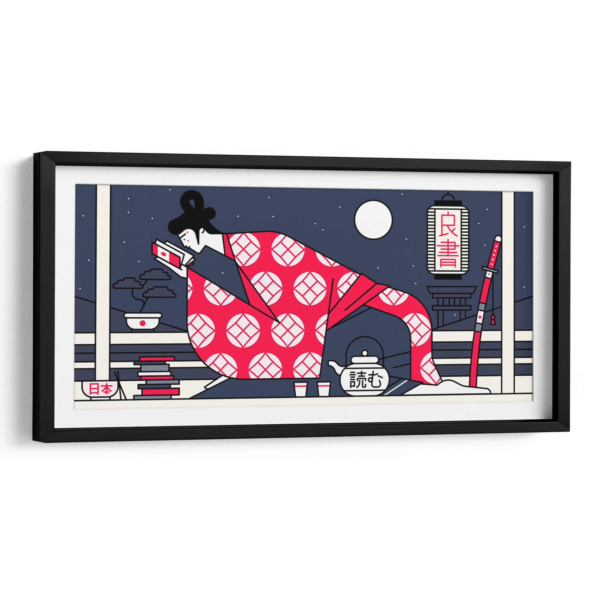 Sumérgete en la serenidad de la cultura japonesa con este cautivador cuadro decorativo 'Lectura japonesa'. La obra presenta a una figura vestida con un kimono vibrante de color rojo y blanco, absorta en la lectura de un libro, bajo un cielo estrellado y la suave luz de la luna. La composición evoca una atmósfera de paz y concentración, ideal para añadir un toque de tranquilidad y sofisticación a cualquier espacio. Los elementos tradicionales, como la linterna japonesa y la tetera, junto con la cuidada paleta de colores dominada por el azul profundo y el rojo llamativo, crean una pieza visualmente impactante. Este cuadro decorativo es perfecto para salones, dormitorios u oficinas, aportando una conexión con el arte y la cultura oriental. Su estilo gráfico y moderno, aunque inspirado en motivos tradicionales, lo convierte en un punto focal único que invita a la contemplación y al disfrute estético, transformando tu hogar en un santuario de calma y estilo. Una elección excelente para quienes buscan arte de pared que cuente una historia y transmita emociones.