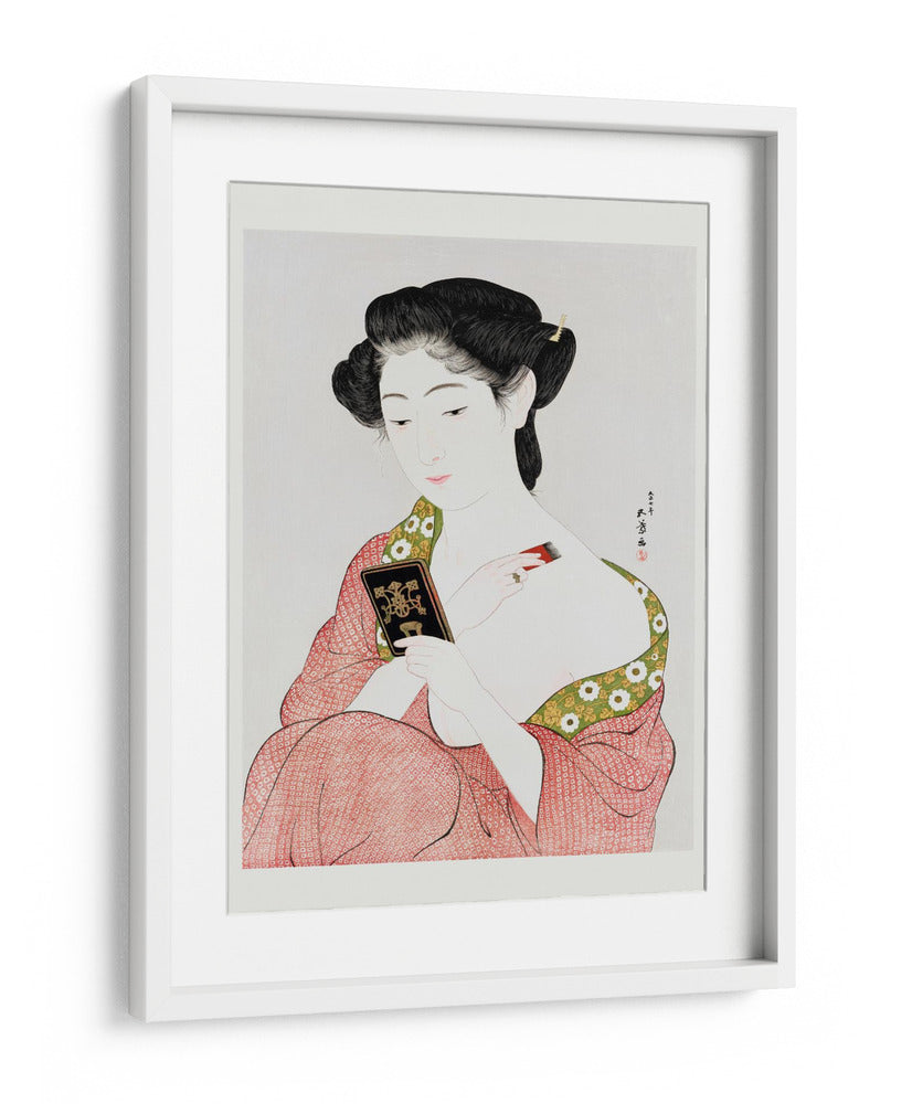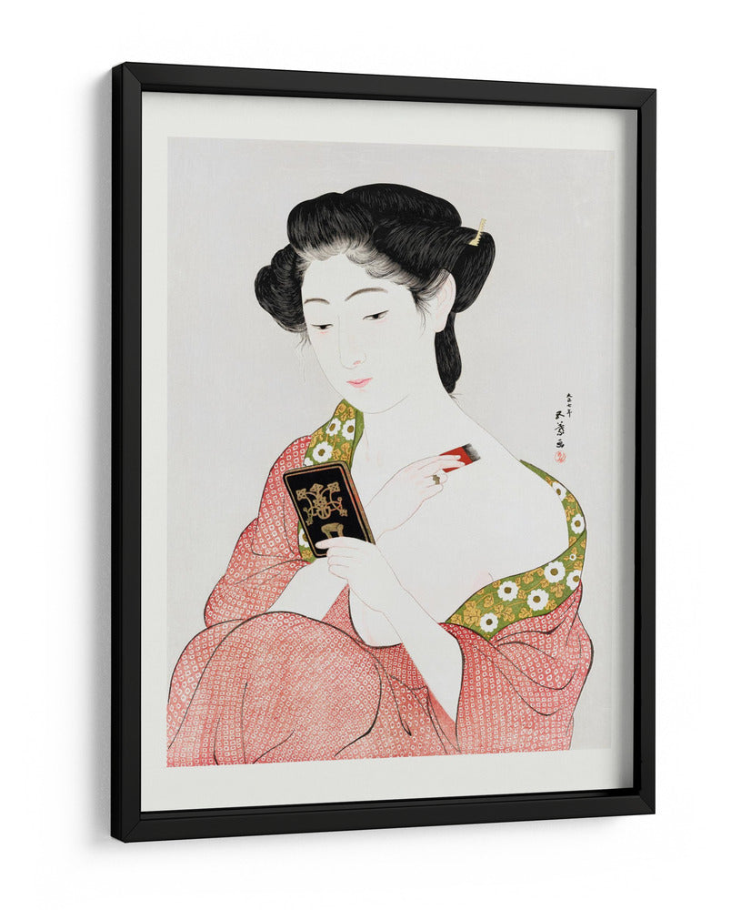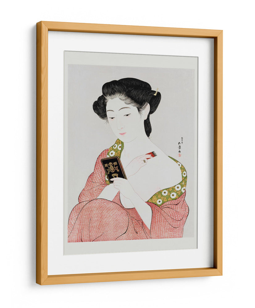 Sumérgete en la delicadeza y el encanto de la obra 'Mujer japonesa aplicándose polvo' de Hashiguchi Goyo. Esta exquisita pieza captura un momento íntimo y sereno, donde una mujer se arregla con gracia, sosteniendo un espejo ornamentado y un pequeño aplicador. Los colores predominantes, como el rosa suave del kimono con su intrincado patrón, el verde vibrante con motivos florales y el tono de piel pálido y delicado, crean una atmósfera de tranquilidad y elegancia clásica. El estilo, inspirado en el arte Ukiyo-e japonés pero con un toque moderno, resalta la belleza sutil de la figura y la atención al detalle en los accesorios. Este cuadro decorativo es perfecto para añadir un toque de sofisticación y calma a tu dormitorio, tocador o cualquier rincón que busque un aire de refinamiento y contemplación. Ideal para amantes del arte japonés, la estética vintage y las piezas que evocan paz y belleza atemporal. Transforma tu espacio con esta representación artística de la feminidad y el ritual diario, creando un ambiente de serenidad y buen gusto que cautivará a todos.