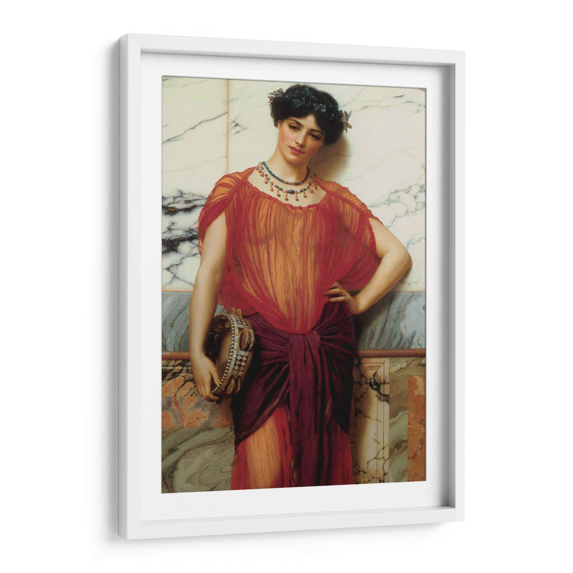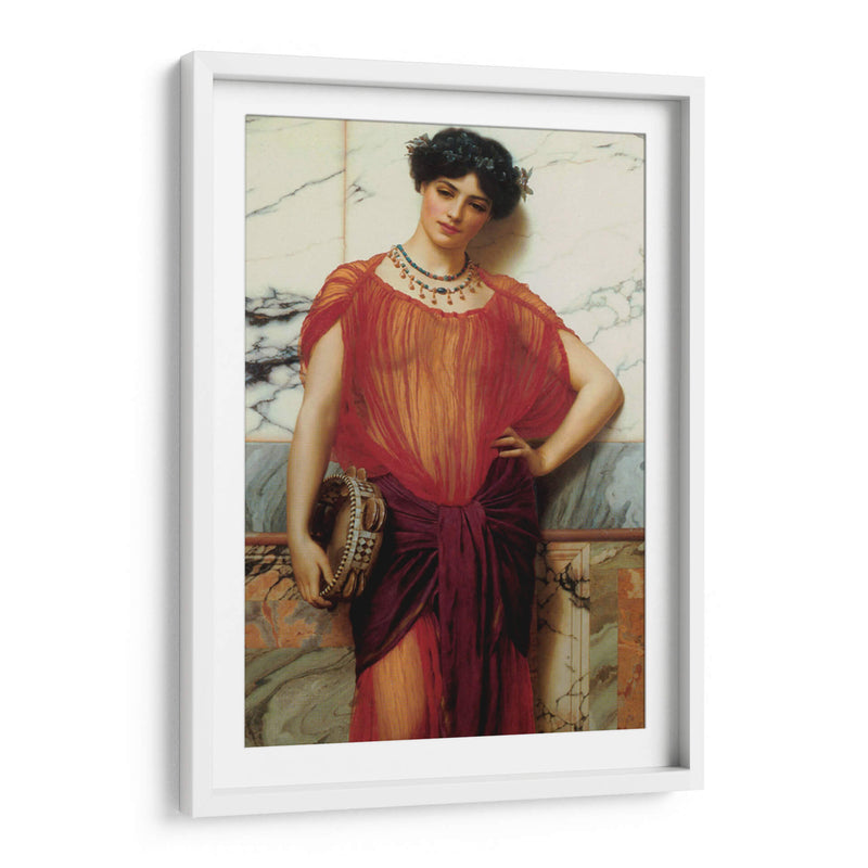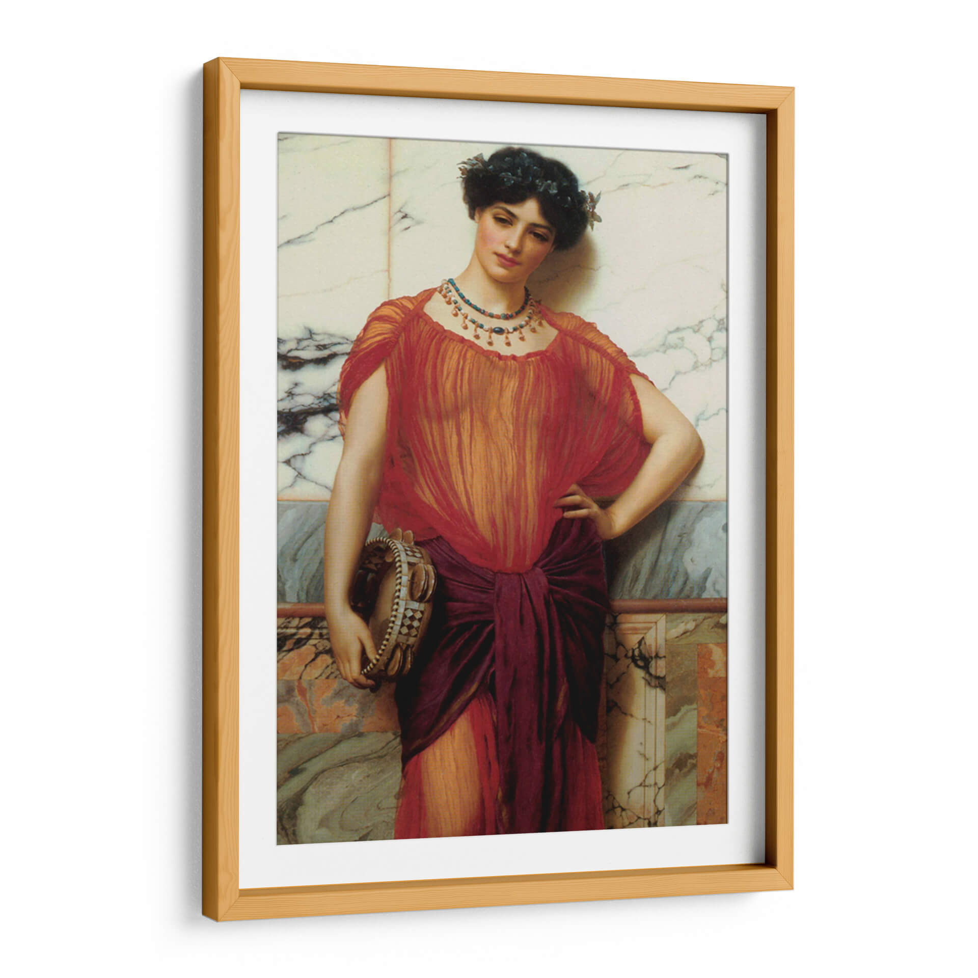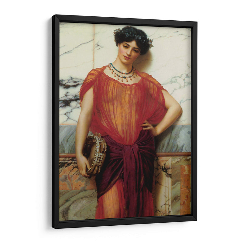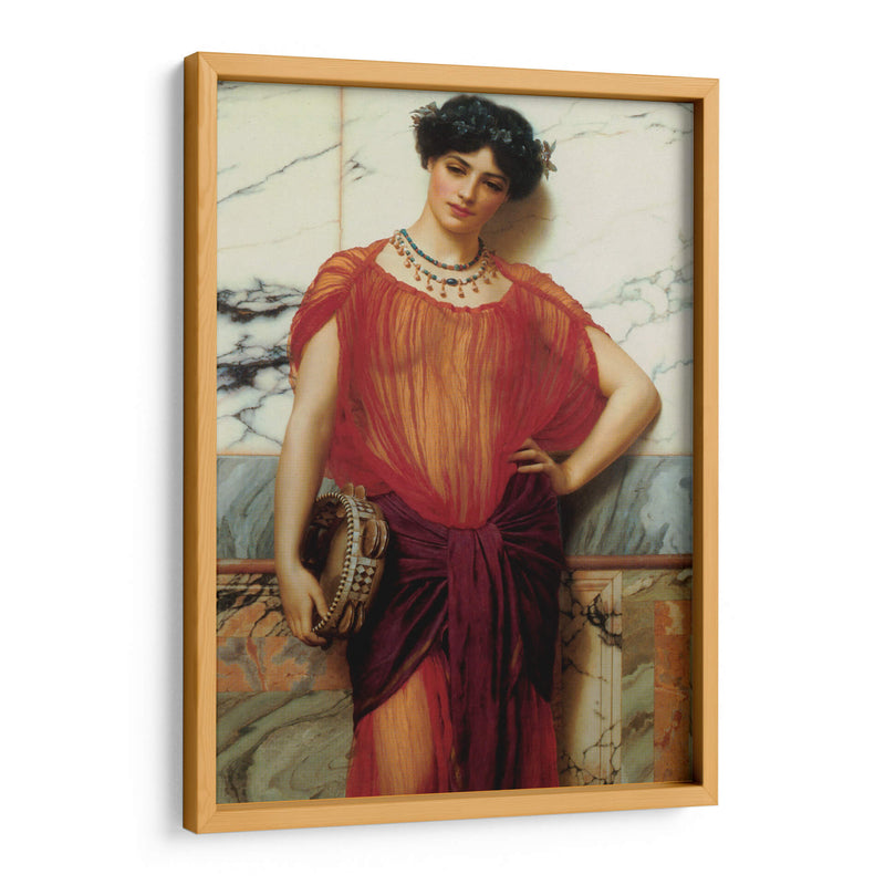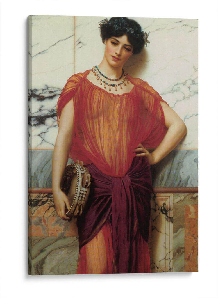 Sumérgete en la elegancia atemporal de "Drusilla" de John William Godward, una obra maestra que captura la esencia de la belleza clásica con un toque de misterio. Esta pintura presenta a una figura femenina enigmática, ataviada con una vaporosa túnica de color naranja rojizo que juega con la luz, revelando sutilmente su forma. Una falda de profundo color vino, anudada con gracia, complementa la riqueza de la indumentaria. La mujer sostiene un pandero, insinuando una posible conexión con la música o la danza. La paleta de colores, dominada por tonos cálidos y terrosos, crea una atmósfera íntima y sofisticada. El fondo, con sus vetas de mármol, evoca la arquitectura de la antigua Roma, transportando al espectador a una época de esplendor. El estilo neoclásico, con su detallada representación anatómica y su delicadeza en las texturas, confiere a la obra una calidad realista y etérea a la vez. "Drusilla" es una pieza ideal para añadir un toque de refinamiento y cultura a cualquier espacio, ya sea una sala de estar, un estudio o un dormitorio, invitando a la contemplación y la admiración.