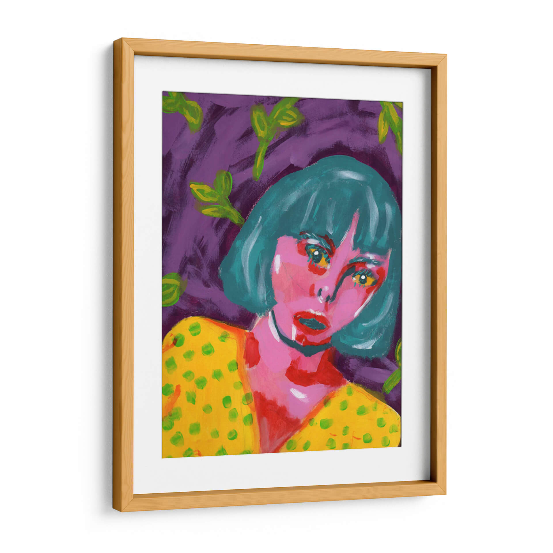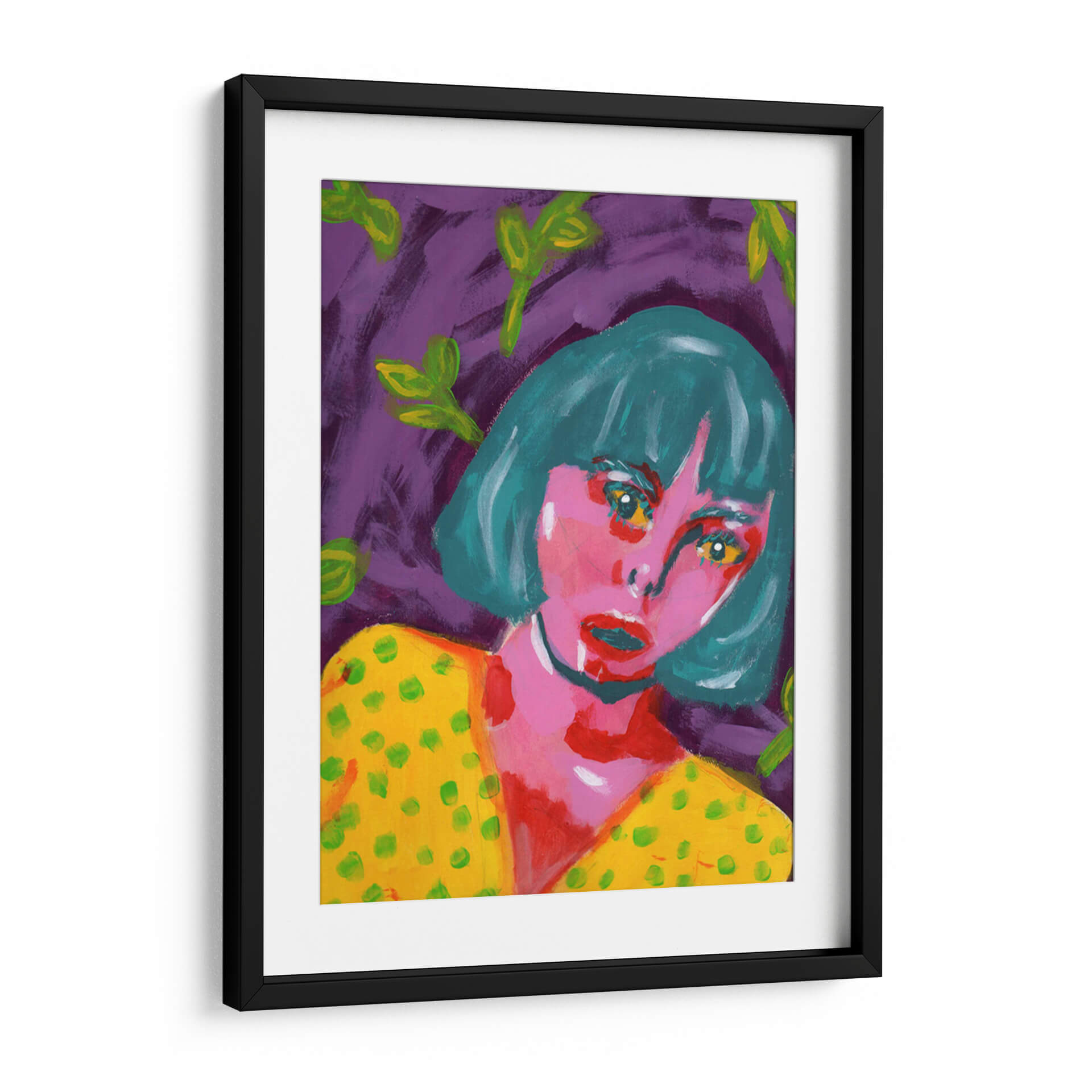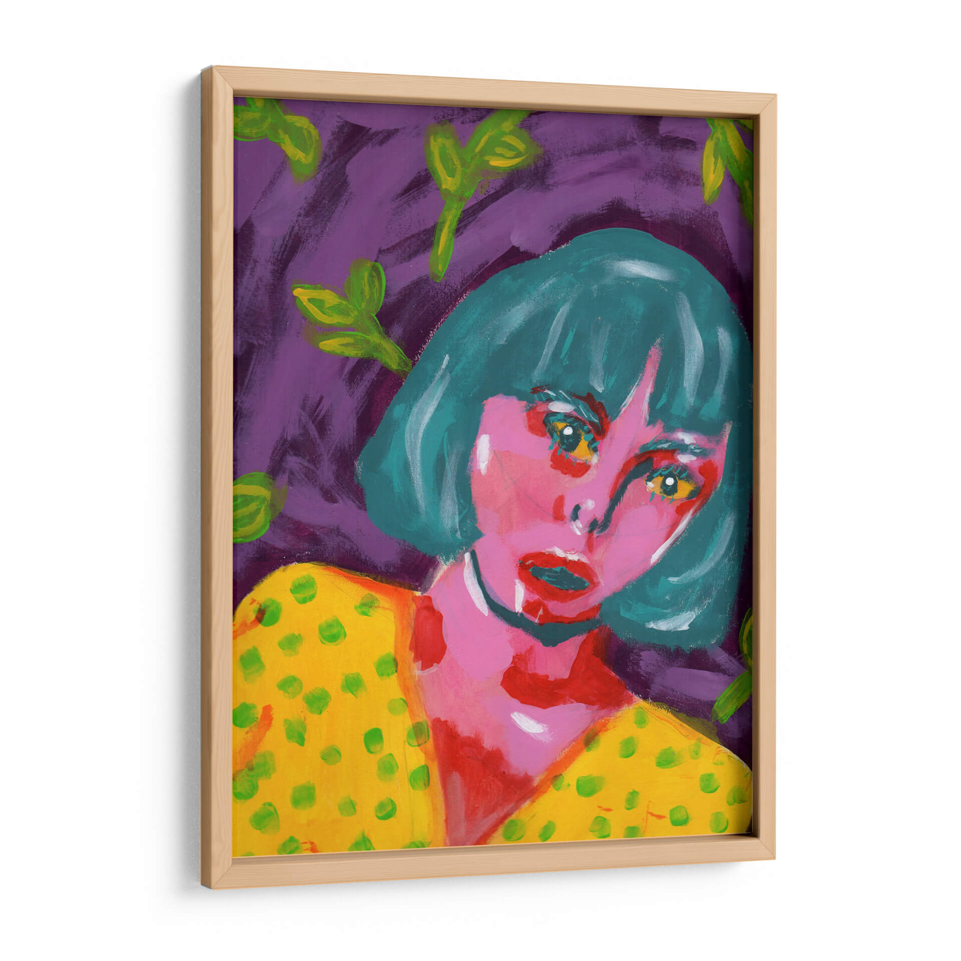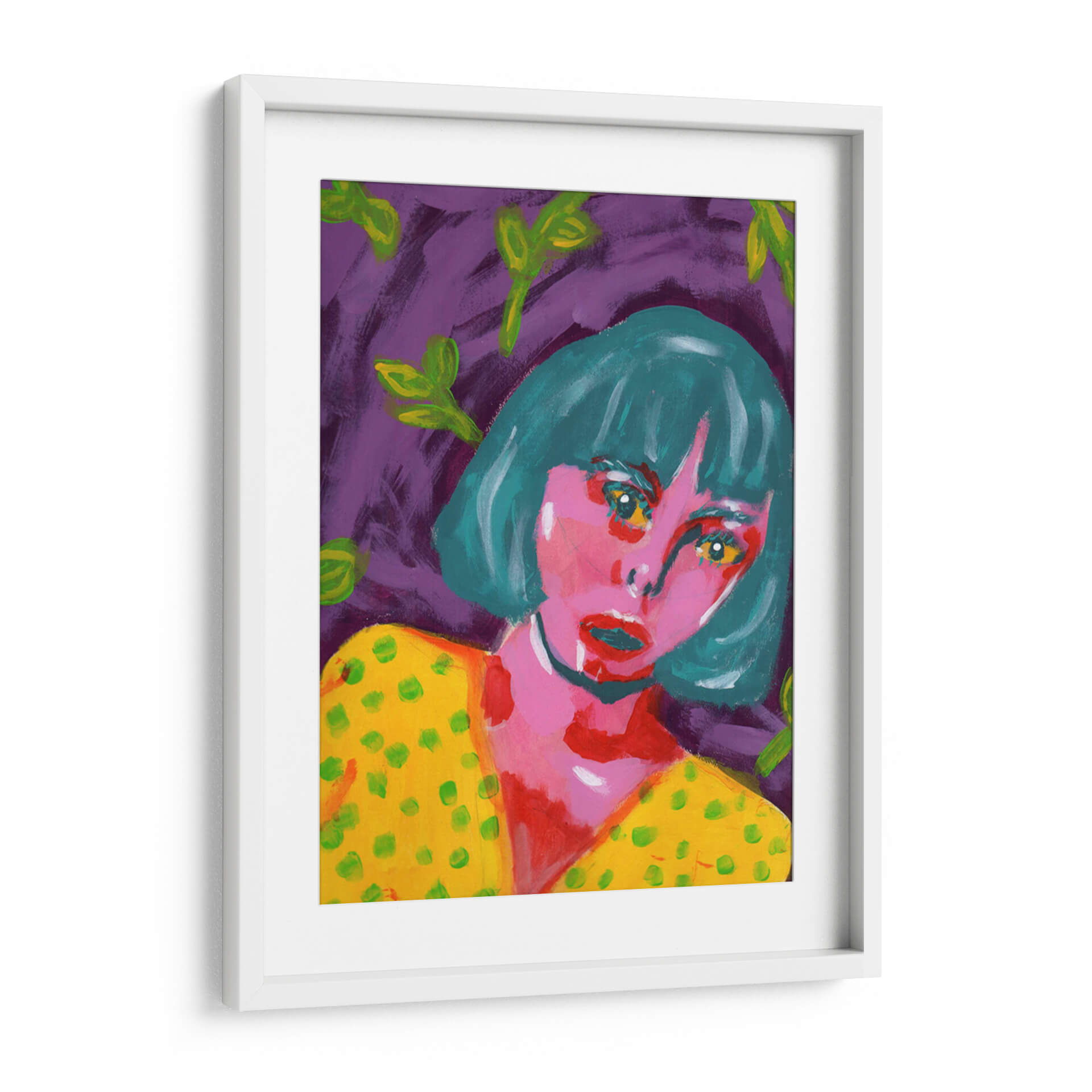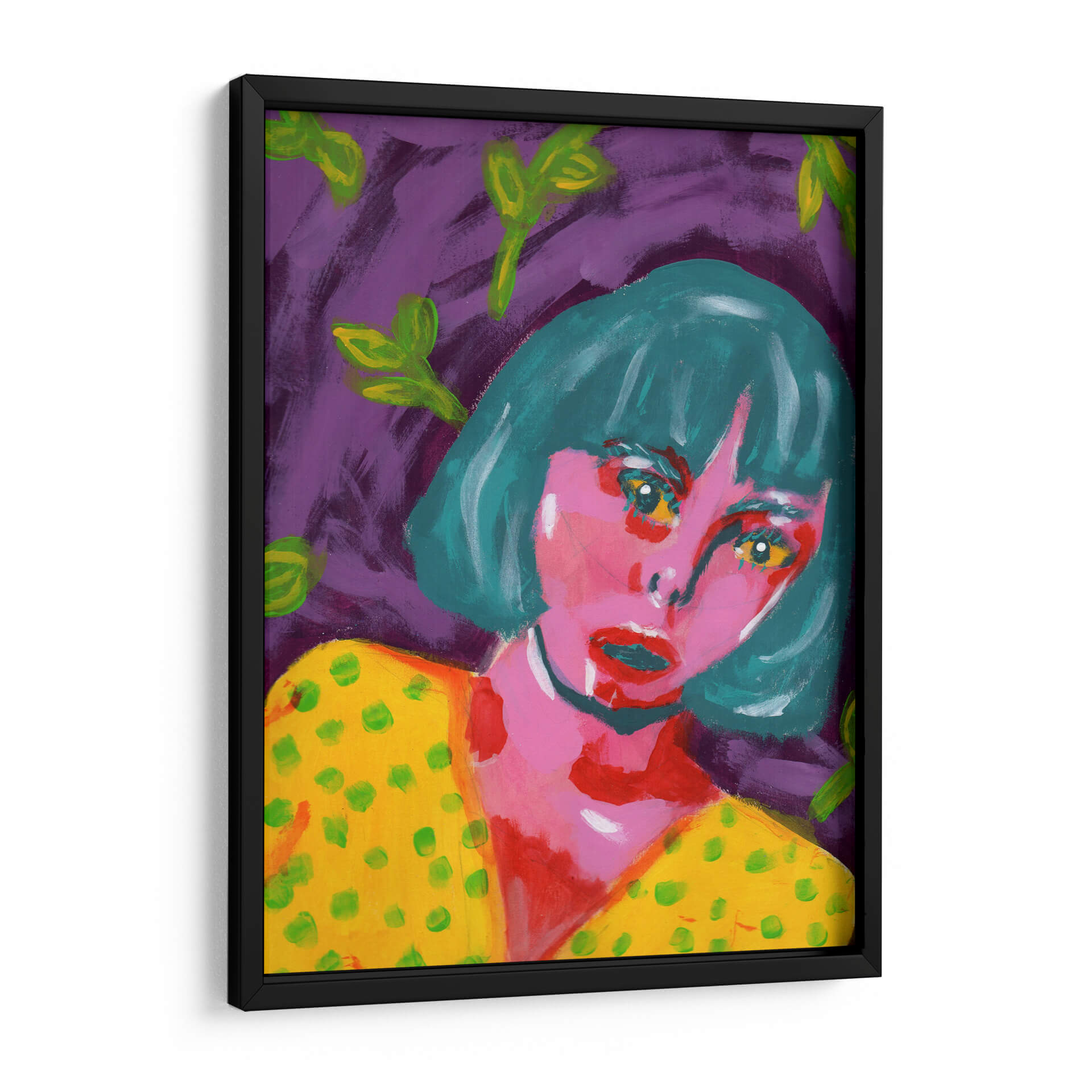 Sumérgete en la intensidad emocional de "Sorprendida", una obra cautivadora de Jimena Escobedo. Este cuadro decorativo presenta un retrato expresivo de una mujer con una mirada penetrante, enmarcada por un vibrante fondo púrpura y salpicada de hojas verdes etéreas. La paleta de colores audaces, con predominio de rosas intensos, amarillos brillantes y turquesas profundos, crea una atmósfera de intriga y vitalidad. El estilo pictórico, con pinceladas sueltas y una aparente simplicidad, evoca el arte contemporáneo y abstracto, invitando a la interpretación personal. La obra transmite una mezcla de vulnerabilidad y fuerza, capturando un momento de asombro o revelación. "Sorprendida" es ideal para añadir un toque de color y misterio a cualquier espacio moderno, ya sea una sala de estar, un dormitorio o un estudio creativo. Transforma tus paredes con este lienzo que no solo decora, sino que también dialoga con tus emociones, convirtiéndose en un punto focal único y memorable en tu hogar u oficina, una pieza que refleja audacia y estilo contemporáneo.