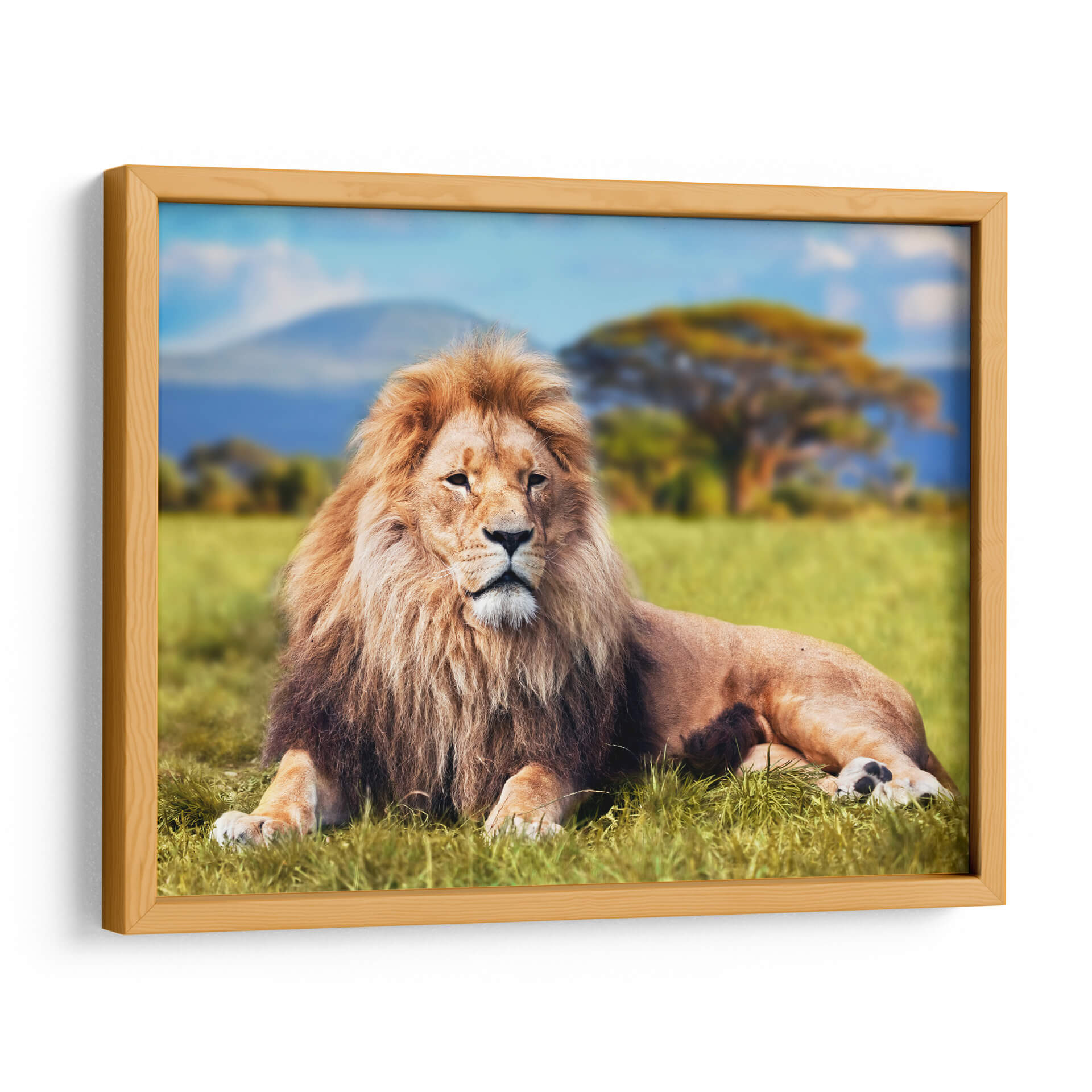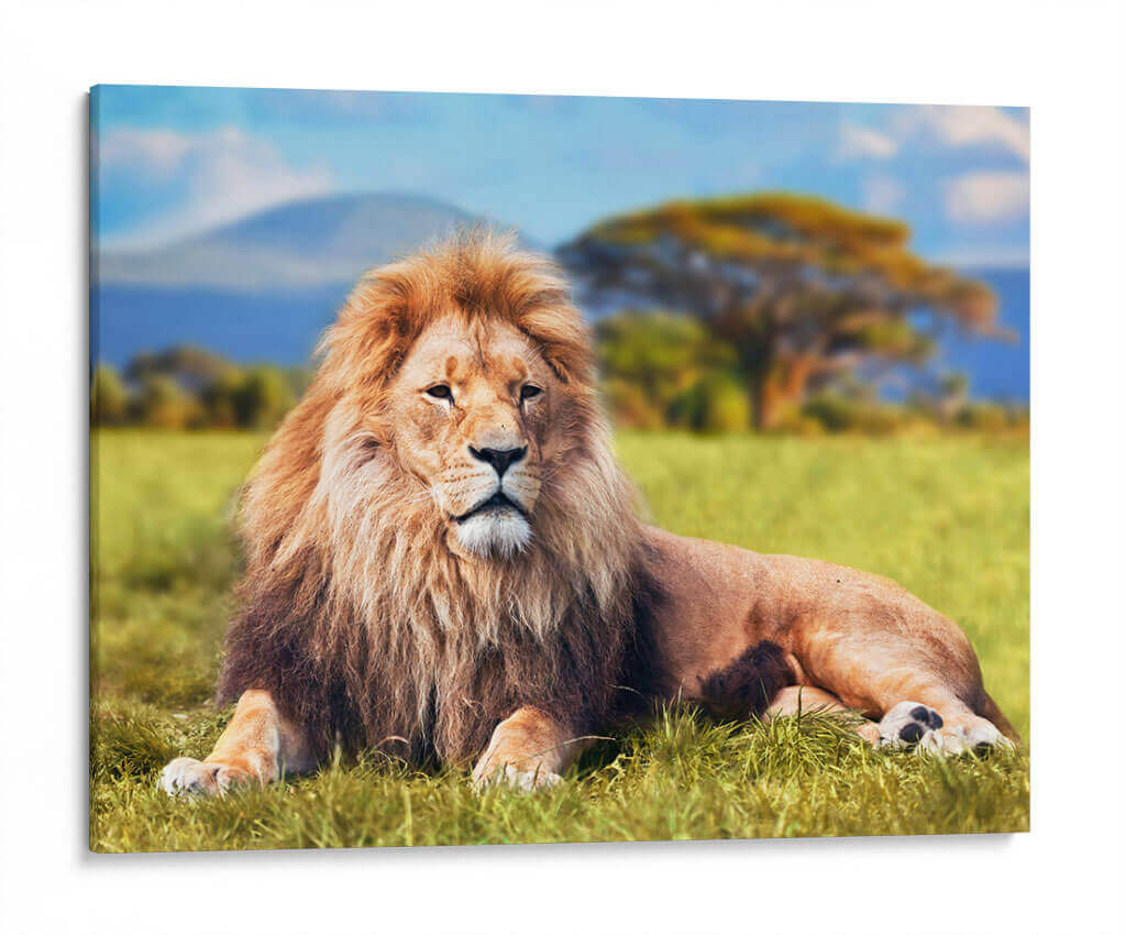 Captura la majestuosidad de la naturaleza con esta impresionante obra de arte "El rey reposando". Un majestuoso león, símbolo de poder y serenidad, descansa sobre la hierba dorada de la sabana africana, con un paisaje idílico de árboles y montañas en el horizonte bajo un cielo azul vibrante. La paleta de colores cálidos y terrosos, dominada por tonos dorados, verdes y azules, crea una atmósfera de paz y tranquilidad, a la vez que evoca la fuerza indomable del animal. Este lienzo, con su composición equilibrada y su estilo realista con un toque de suavidad, es la pieza decorativa perfecta para añadir un punto focal de carácter y elegancia a tu sala de estar, dormitorio u oficina. Transforma tu espacio en un santuario de calma y admiración, invitando a la contemplación de la belleza salvaje y el poder sereno del rey de la selva.