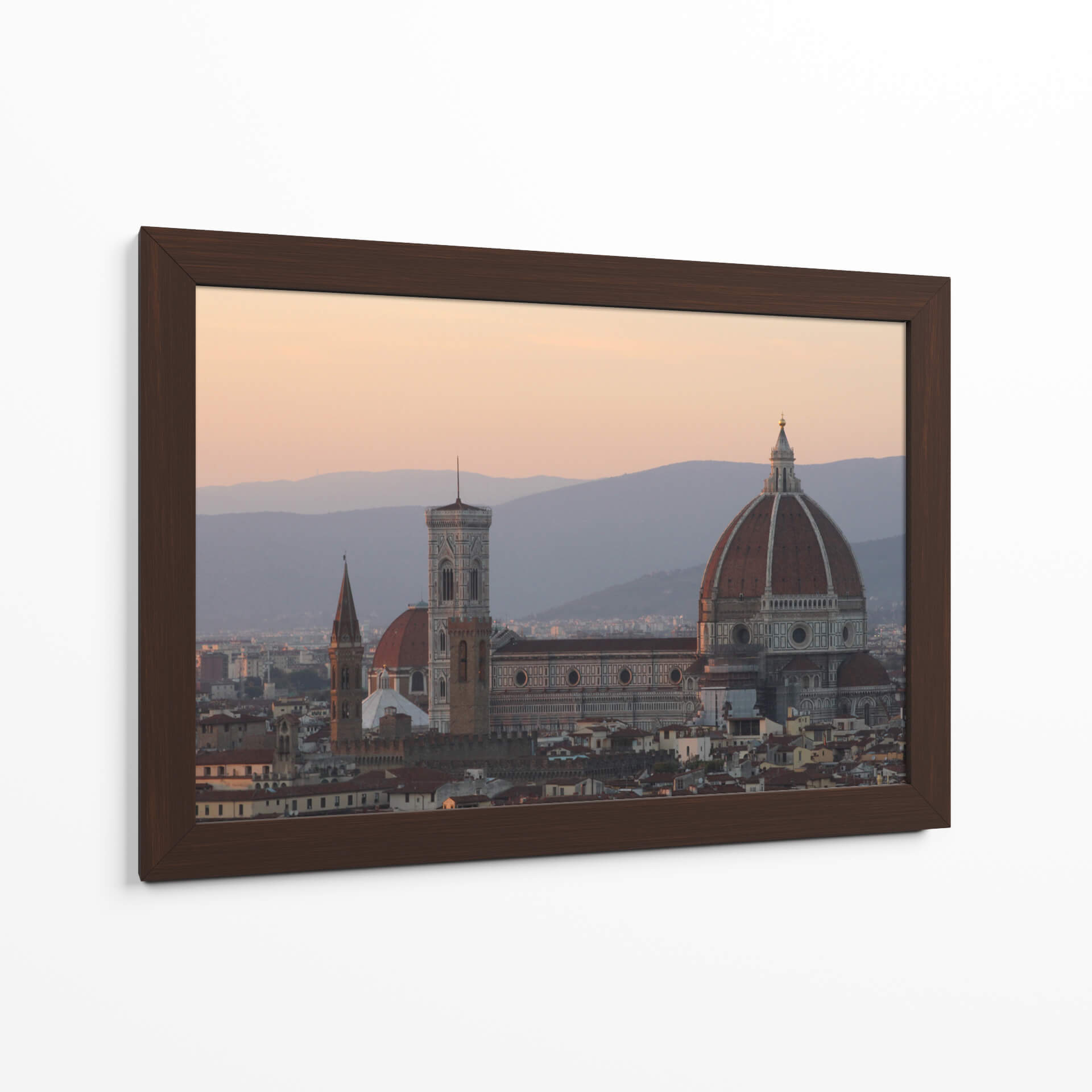 Captura la magia de la Toscana con "Atardecer en Florencia, Italia", una obra de arte que transporta la esencia de la ciudad del Renacimiento a tu hogar. Este cuadro decorativo presenta una vista panorámica del icónico Duomo de Florencia, con su majestuosa cúpula y el Campanile de Giotto elevándose contra un cielo teñido de los suaves tonos del atardecer. La paleta de colores, dominada por cálidos naranjas, rosados y azules pálidos, evoca una atmósfera de serenidad y romance, perfecta para añadir un toque de sofisticación a cualquier espacio. La composición detallada, que incluye los tejados de la ciudad y las colinas toscanas en el horizonte, invita a la contemplación y al ensueño. Ideal para salones, comedores o estudios, este cuadro es una ventana a la belleza arquitectónica y la luz dorada de Italia. Transforma tu ambiente con la elegancia atemporal de Florencia y deja que cada atardecer sea un recordatorio de la belleza artística.