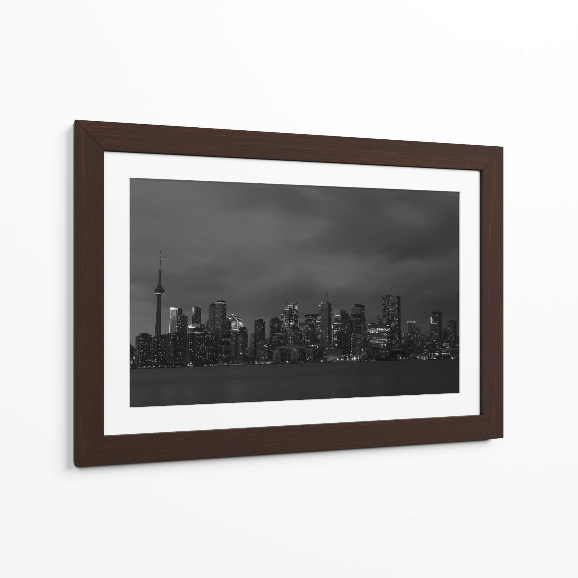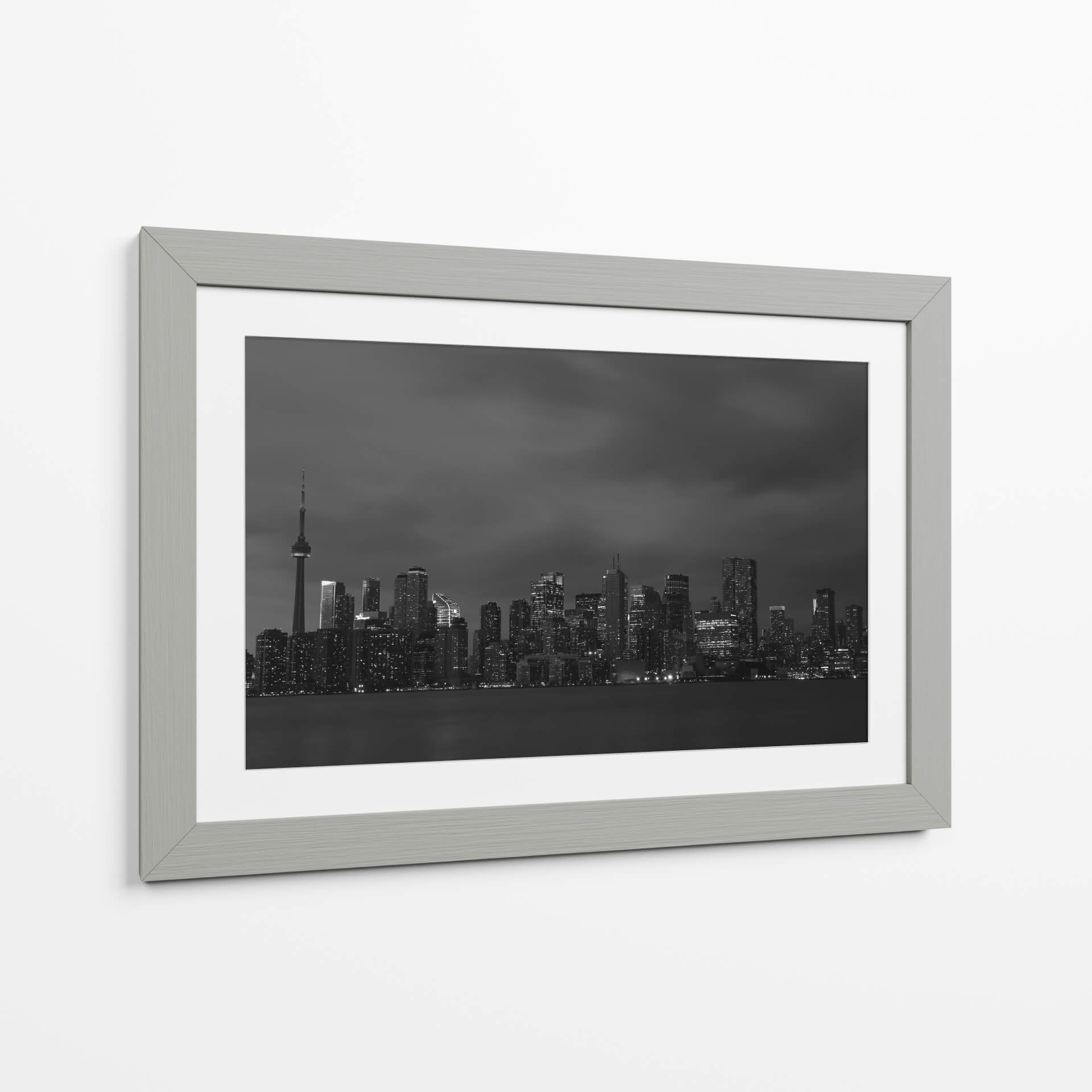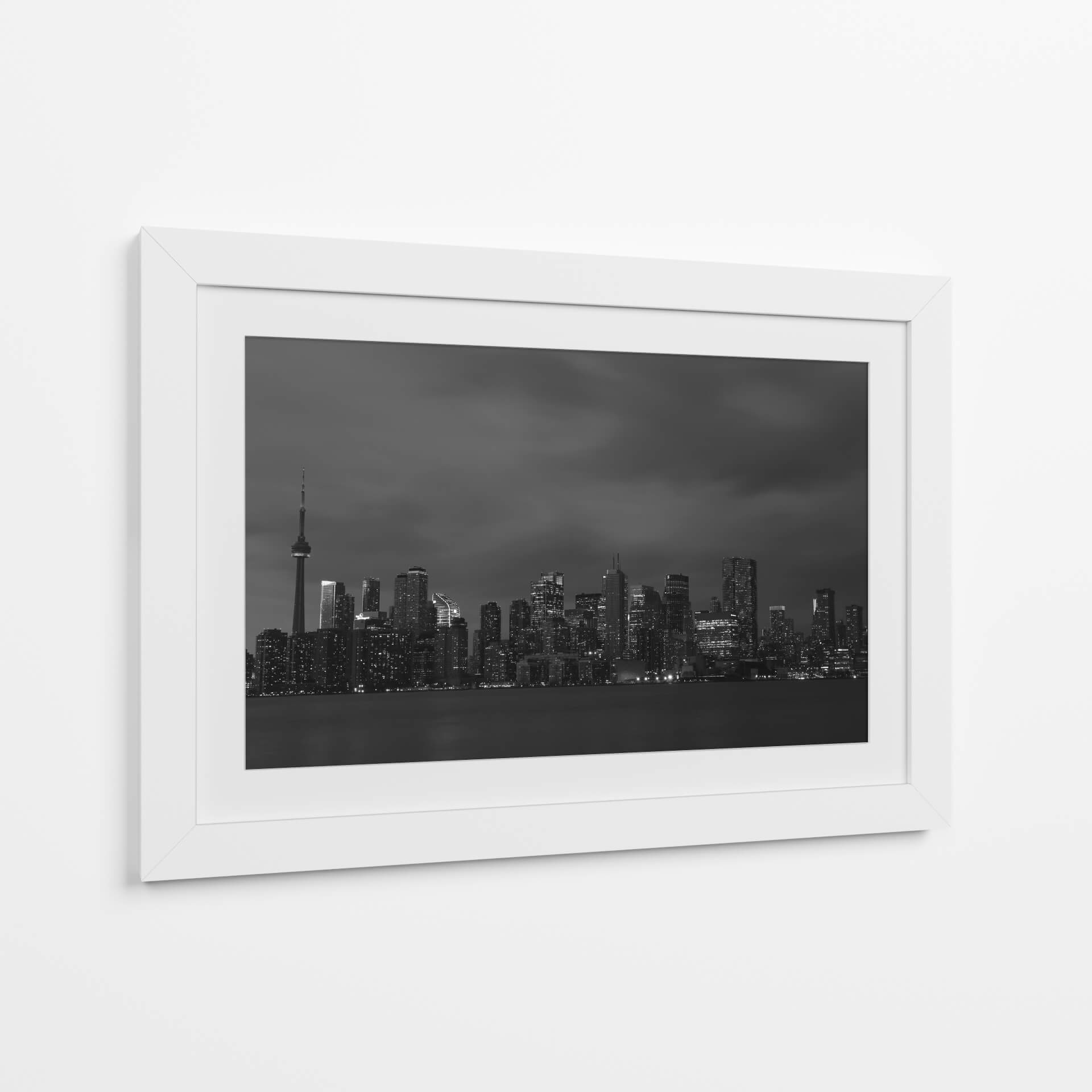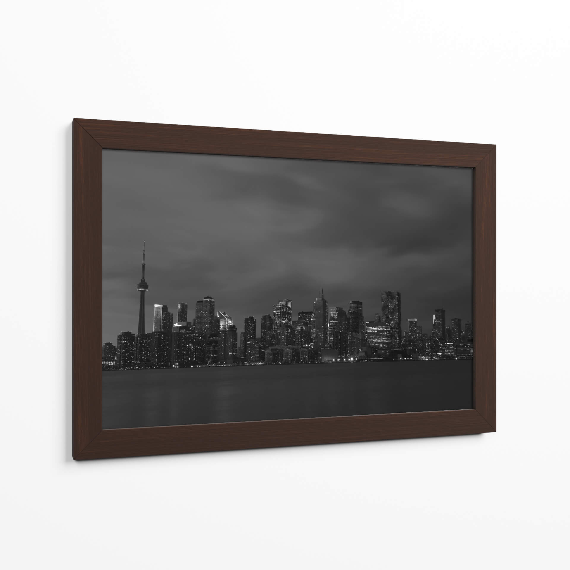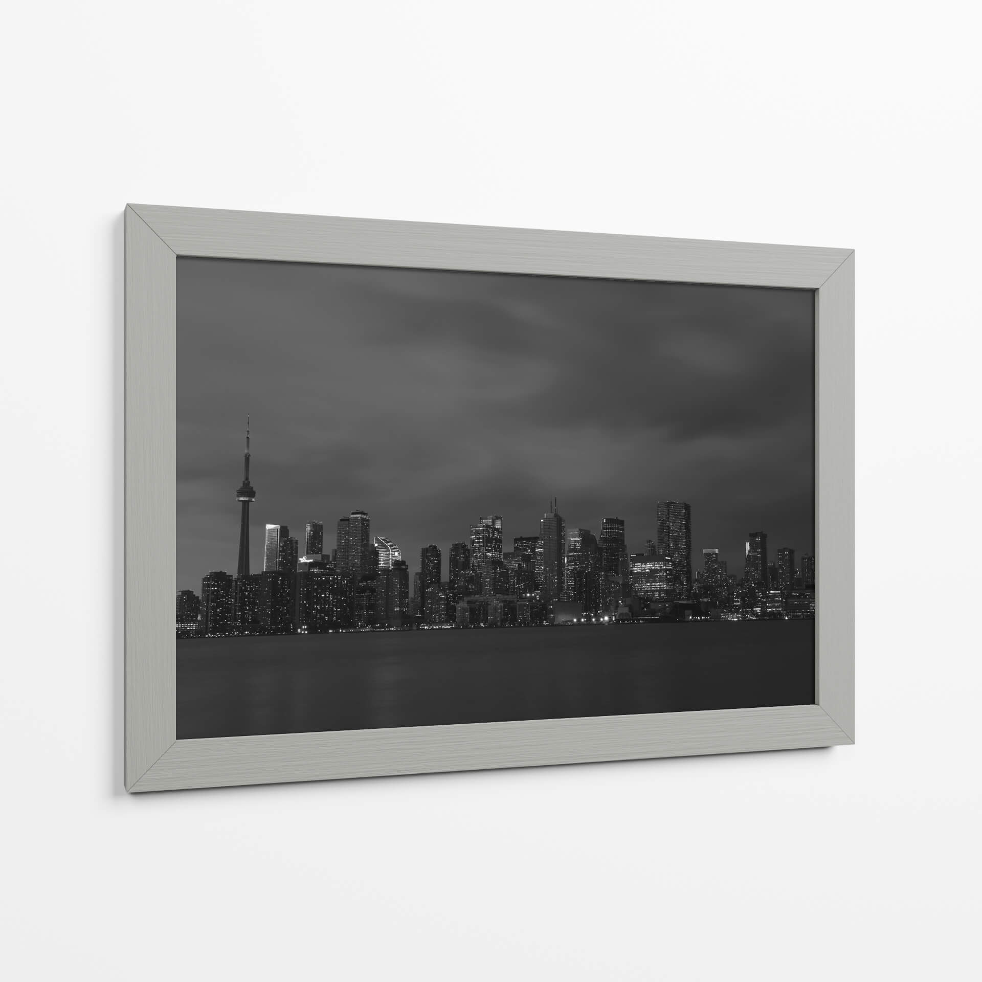 Sumérgete en la majestuosidad urbana con este evocador cuadro decorativo de la ciudad de Toronto al atardecer. La obra, capturada en una paleta monocromática de blancos y negros, resalta la silueta icónica de los rascacielos y la imponente Torre CN contra un cielo nublado y dramático. Las luces de la ciudad parpadean como estrellas atrapadas en la arquitectura moderna, creando una atmósfera de sofisticación y misterio. La composición, que abarca el horizonte de la ciudad reflejado en las tranquilas aguas, ofrece una perspectiva única y cautivadora. Este cuadro es ideal para añadir un toque de elegancia contemporánea a cualquier espacio, ya sea una sala de estar moderna, una oficina ejecutiva o un recibidor. Su estilo fotográfico y realista, con un tratamiento artístico que realza las texturas y el contraste, lo convierte en una pieza de conversación y un reflejo del dinamismo urbano. La ausencia de color permite que la forma y la luz sean las protagonistas, invitando a la contemplación y al disfrute de la belleza arquitectónica. Un detalle perfecto para amantes de las metrópolis y el arte con carácter.