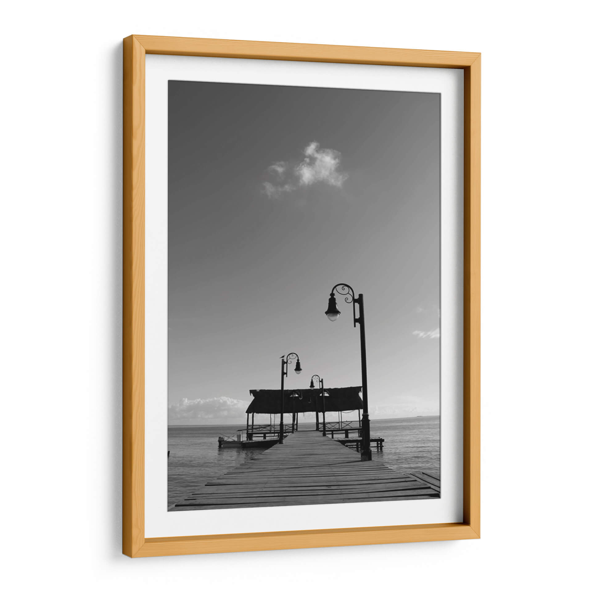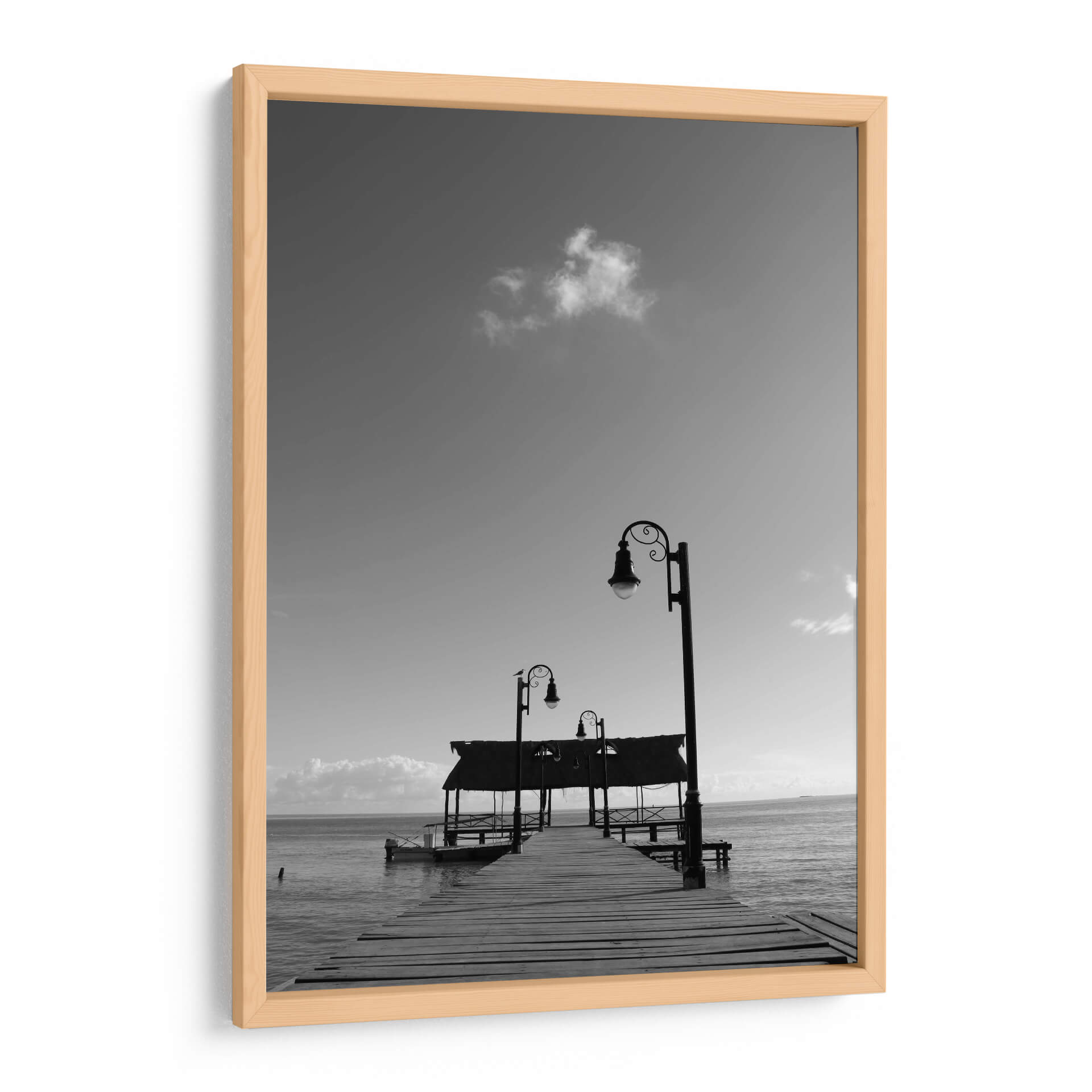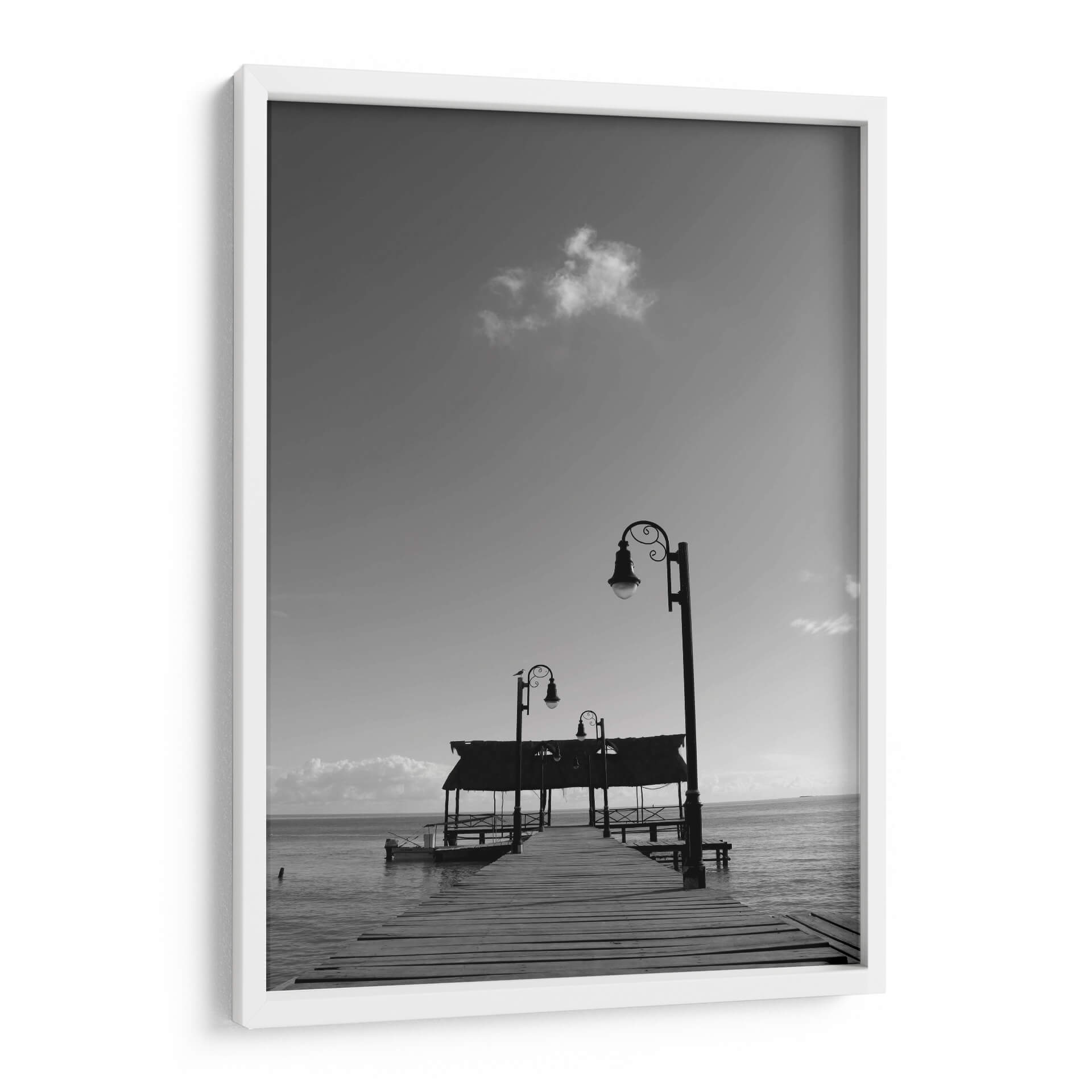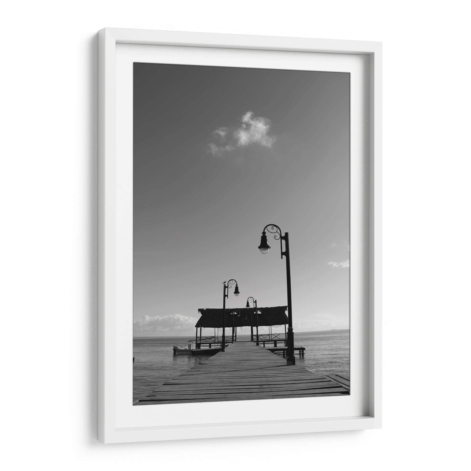 Sumérgete en la serena belleza de "Muelle en Isla de Campeche", una obra de arte digital que captura la esencia de un atardecer tranquilo junto al mar. Este cuadro decorativo, creado por Luis Rodrigo Magaña Andrade, te transporta a un oasis de paz con su evocadora composición en blanco y negro. Observa el muelle de madera que se adentra majestuosamente en el océano, flanqueado por elegantes farolas que prometen guiar el camino hacia la calma. Las sutiles nubes en el cielo y el suave oleaje del mar crean una atmósfera de introspección y tranquilidad. La paleta monocromática realza los contrastes y las texturas, aportando una profundidad visual que invita a la contemplación. Ideal para cualquier espacio que necesite un toque de serenidad y sofisticación, este cuadro decorativo es perfecto para salones, dormitorios o estudios, transformando cualquier habitación en un refugio de paz y elegancia. Su estilo atemporal y su temática marina lo convierten en una pieza versátil que encaja en diversas decoraciones, desde las más modernas hasta las clásicas.