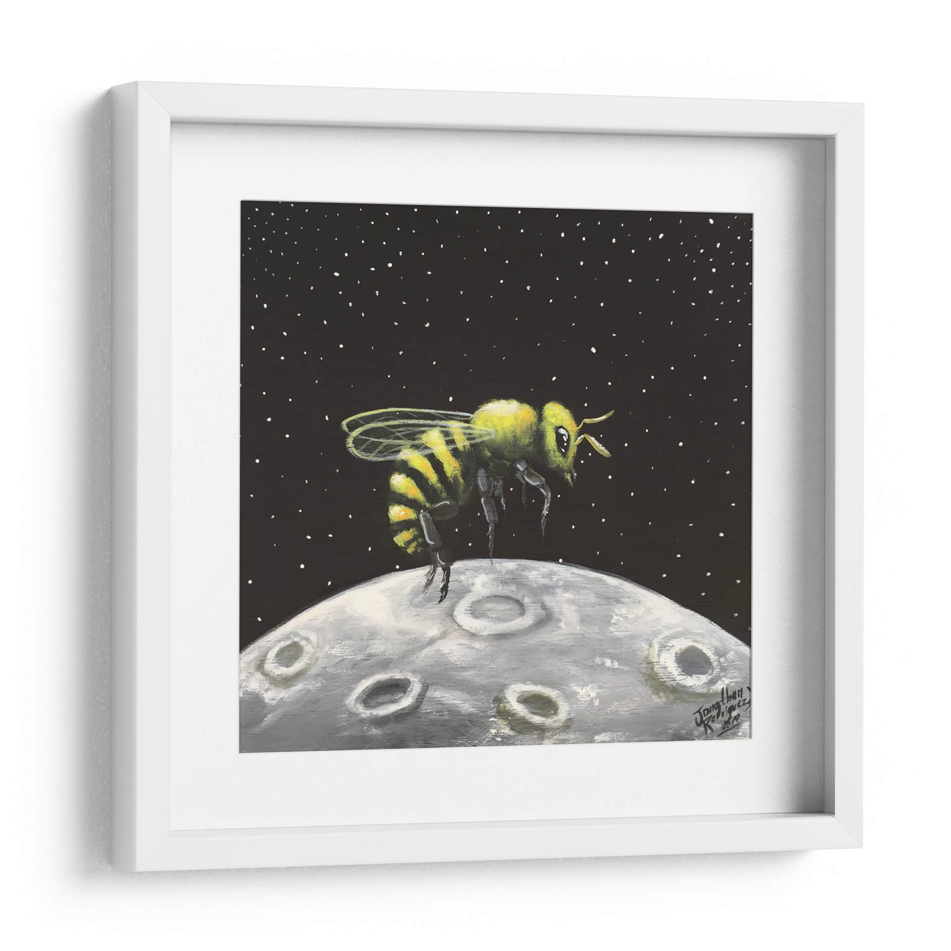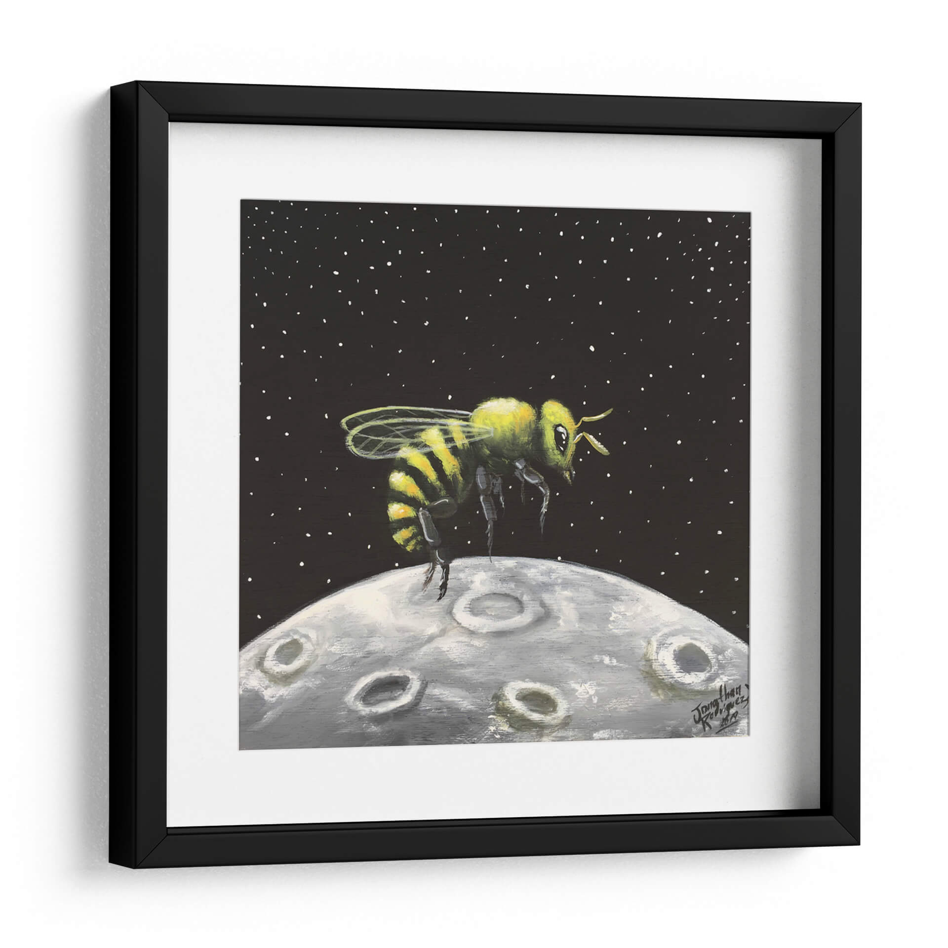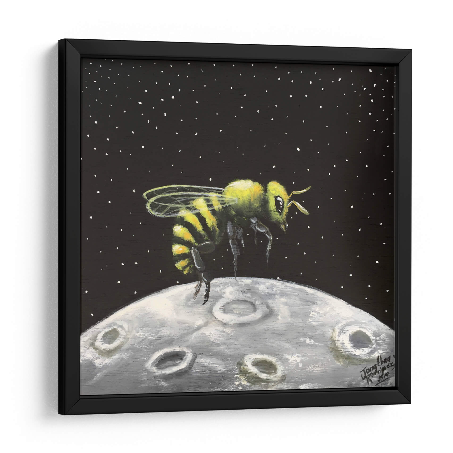 Sumérgete en la maravilla cósmica con "Luna de Miel", una obra de arte cautivadora de Jona Rodriguez Art. Este cuadro decorativo presenta una abeja vibrante, detallada con sus icónicas rayas amarillas y negras, suspendida sobre una representación texturizada de la luna. El fondo oscuro, salpicado de diminutas estrellas blancas, evoca la inmensidad del espacio, creando un contraste llamativo con la figura central. La técnica pictórica, con pinceladas visibles y una paleta de colores que combina el amarillo y verde de la abeja con los grises y blancos de la luna, confiere a la pieza una cualidad casi de ensueño. El estilo, que fusiona elementos realistas con un toque surrealista, invita a la reflexión sobre la conexión entre lo terrenal y lo celestial, o sobre la audacia de explorar nuevos mundos. "Luna de Miel" es ideal para añadir un toque de originalidad y fantasía a cualquier habitación, ya sea un salón moderno, una oficina creativa o un dormitorio que busque inspiración. Este cuadro decorativo es una pieza única que despierta la imaginación y sirve como un punto focal intrigante, perfecto para aquellos que aprecian el arte contemporáneo con un giro lúdico y conceptual. Su atmósfera de descubrimiento y la singularidad de su tema lo convierten en una adición memorable a cualquier colección de arte mural.