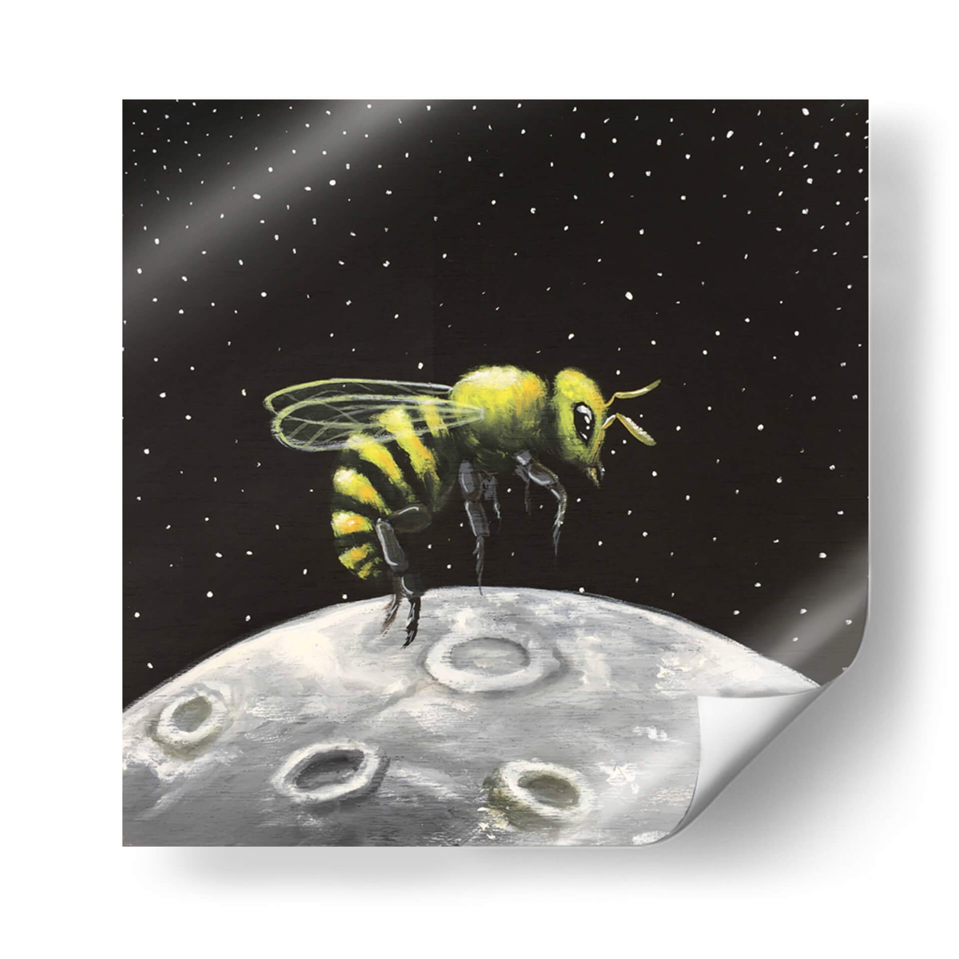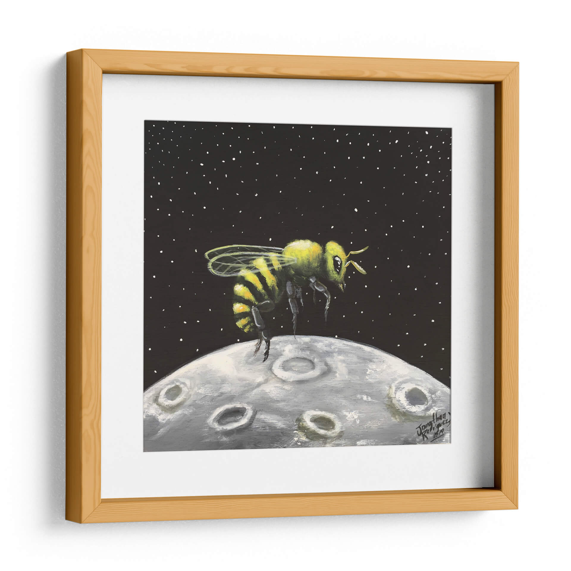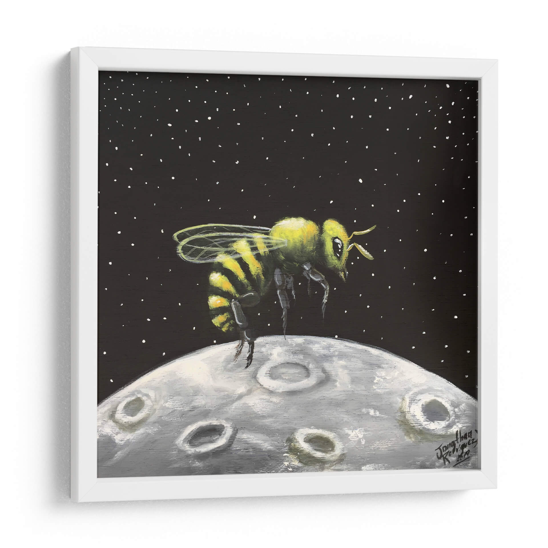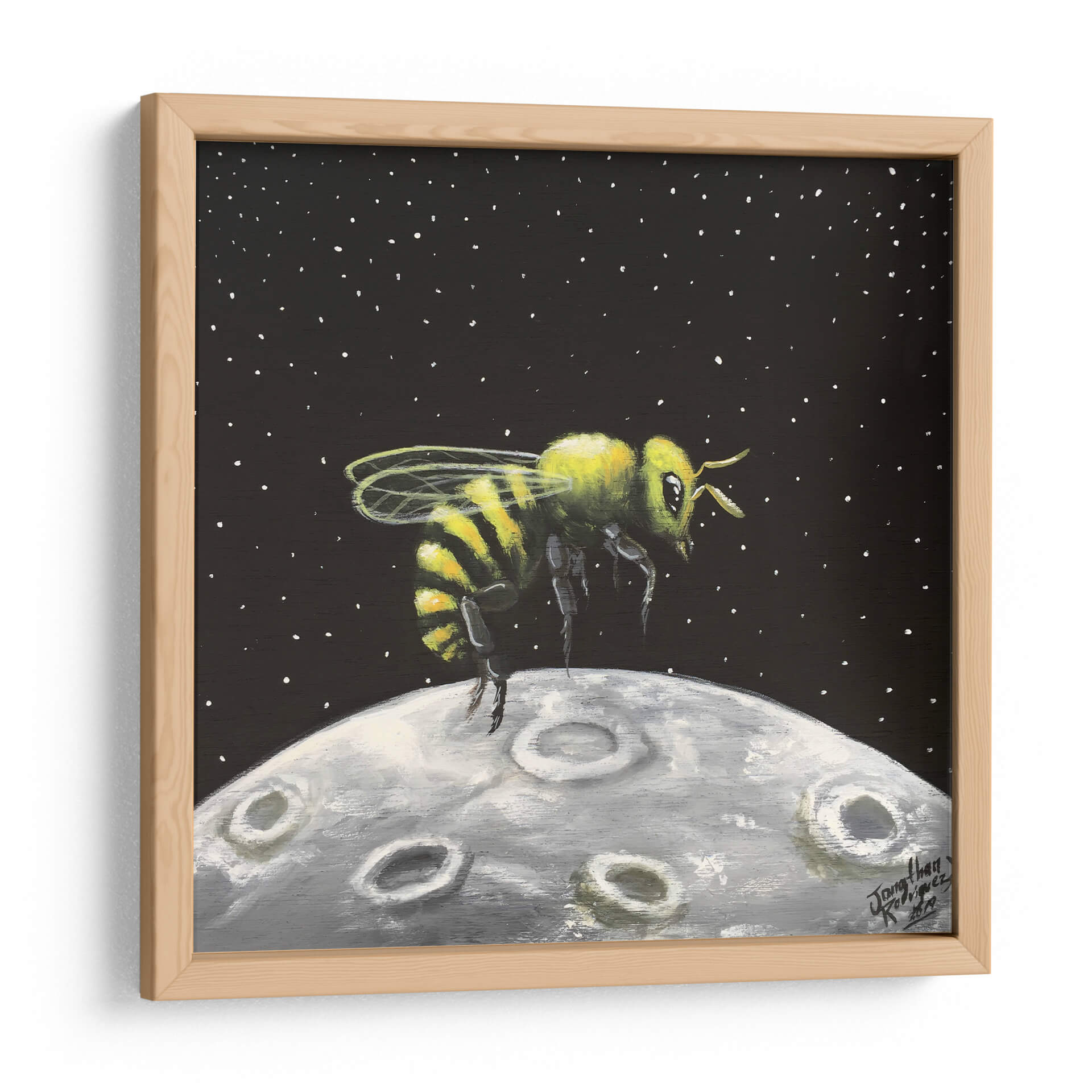 Sumérgete en la maravilla cósmica con "Luna de Miel", una obra de arte cautivadora de Jona Rodriguez Art. Este cuadro decorativo presenta una abeja vibrante, detallada con sus icónicas rayas amarillas y negras, suspendida sobre una representación texturizada de la luna. El fondo oscuro, salpicado de diminutas estrellas blancas, evoca la inmensidad del espacio, creando un contraste llamativo con la figura central. La técnica pictórica, con pinceladas visibles y una paleta de colores que combina el amarillo y verde de la abeja con los grises y blancos de la luna, confiere a la pieza una cualidad casi de ensueño. El estilo, que fusiona elementos realistas con un toque surrealista, invita a la reflexión sobre la conexión entre lo terrenal y lo celestial, o sobre la audacia de explorar nuevos mundos. "Luna de Miel" es ideal para añadir un toque de originalidad y fantasía a cualquier habitación, ya sea un salón moderno, una oficina creativa o un dormitorio que busque inspiración. Este cuadro decorativo es una pieza única que despierta la imaginación y sirve como un punto focal intrigante, perfecto para aquellos que aprecian el arte contemporáneo con un giro lúdico y conceptual. Su atmósfera de descubrimiento y la singularidad de su tema lo convierten en una adición memorable a cualquier colección de arte mural.