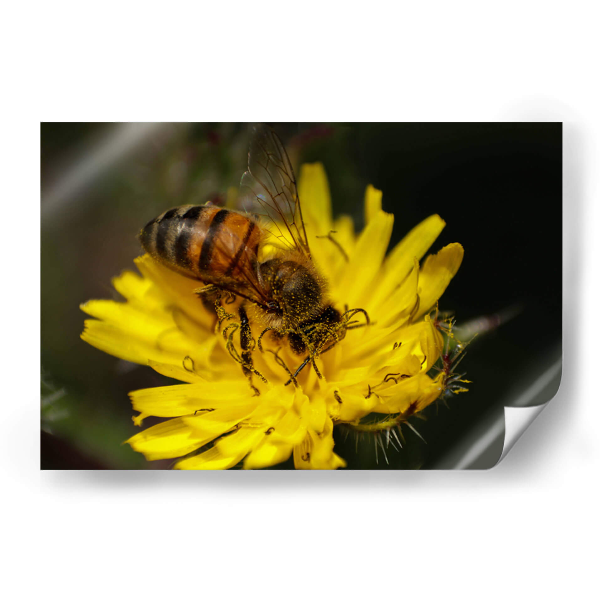 Sumérgete en la vibrante belleza de la naturaleza con este cautivador cuadro decorativo que captura el momento íntimo de una abeja recolectando polen de una flor amarilla radiante. La fotografía macro resalta los intrincados detalles de la abeja, desde sus rayas naranjas y negras hasta el fino polvillo dorado que cubre su cuerpo y sus patas. La flor, un estallido de amarillo brillante, sirve como telón de fondo perfecto, con sus pétalos delicadamente dispuestos y el contraste sutil del fondo oscuro que hace que la escena principal resalte con una claridad impresionante. Esta obra es una celebración de la vida, el trabajo diligente y la delicada danza de la polinización. Su paleta de colores dominada por el amarillo intenso y los tonos tierra de la abeja, junto con el verde oscuro del follaje, aporta calidez y vitalidad a cualquier espacio. Ideal para dar un toque de naturaleza y energía a tu sala de estar, añadir un elemento inspirador a tu oficina o crear un punto focal orgánico en tu comedor. Este cuadro decorativo es perfecto para los amantes de la naturaleza, la fotografía macro y aquellos que buscan añadir un toque de vida y color a su hogar.