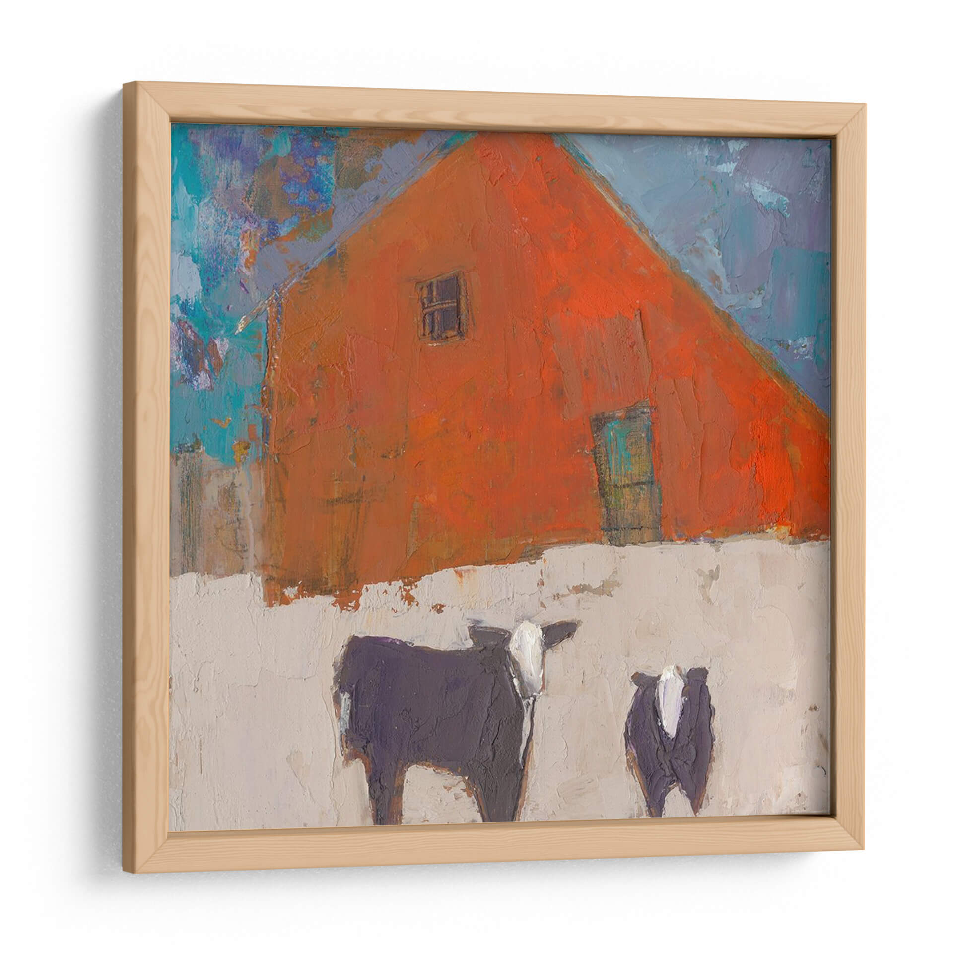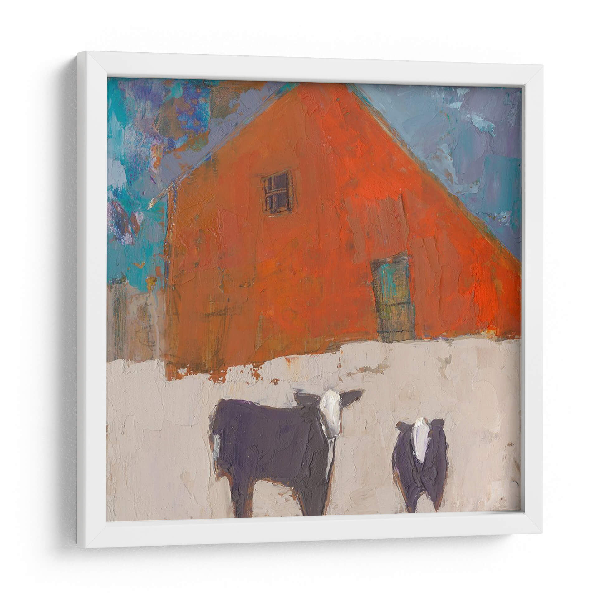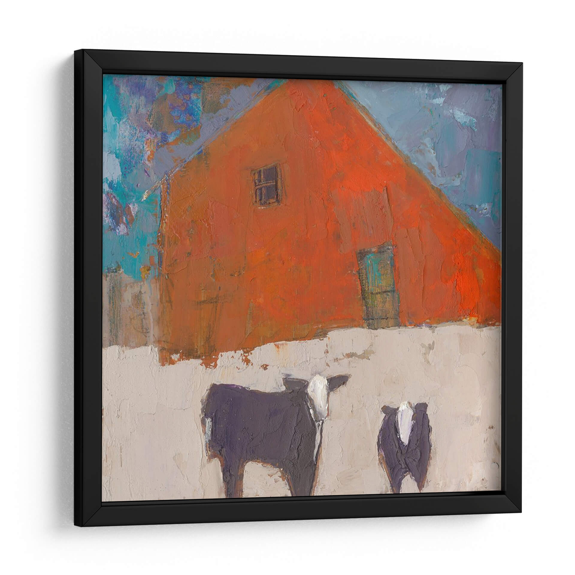 Sumérgete en la atmósfera rústica y vibrante de "Avellana-II", una obra de arte contemporáneo que captura la esencia de la vida rural con un toque moderno y expresionista. Este cuadro decorativo presenta una imponente estructura de granero de color naranja intenso, cuya forma triangular domina la composición, acentuada por un pequeño y enigmático recuadro y una puerta de un sereno tono aguamarina. La textura rica y empastada de la pintura invita a la contemplación, mientras que el contraste entre el naranja ardiente del granero y el cielo azul vibrante, salpicado de pinceladas audaces, crea una dinámica visual cautivadora. En primer plano, dos figuras bovinas, una más grande y detallada que la otra, aportan un elemento de familiaridad y calidez al paisaje. Sus siluetas oscuras, con detalles en blanco, se recortan sobre un fondo de tono tierra claro y texturizado, sugiriendo un ambiente sereno y quizás invernal. "Avellana-II" es una pieza que evoca sentimientos de tranquilidad y conexión con la naturaleza, ideal para añadir un punto focal lleno de carácter a salones modernos, cocinas rústicas o incluso estudios creativos. Su estilo único y su paleta de colores audaz la convierten en una adición memorable a cualquier colección de arte de pared.