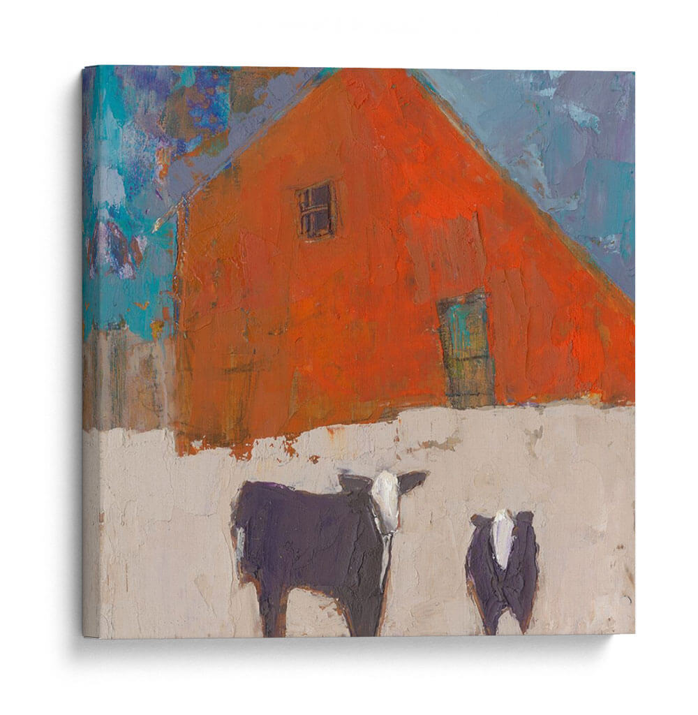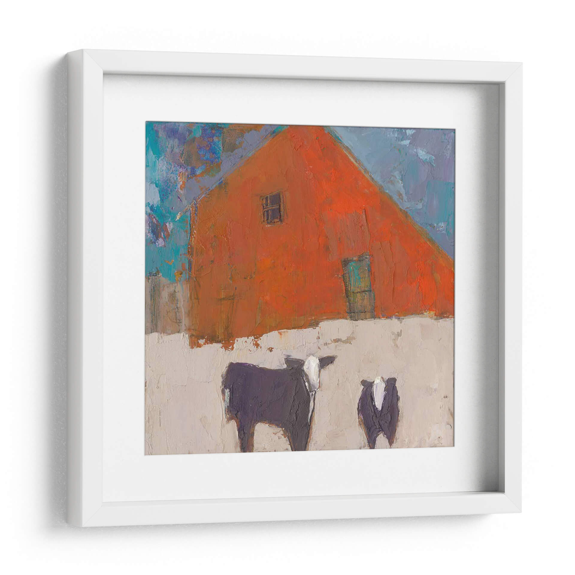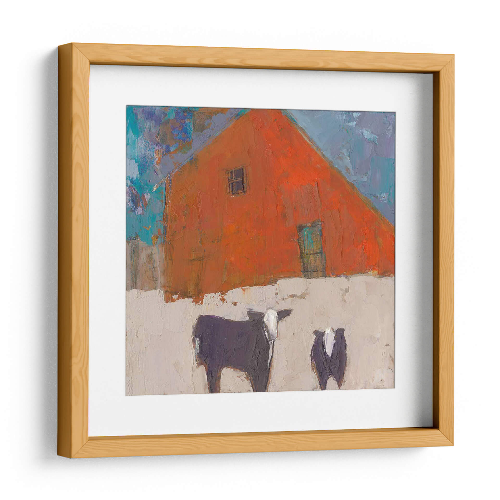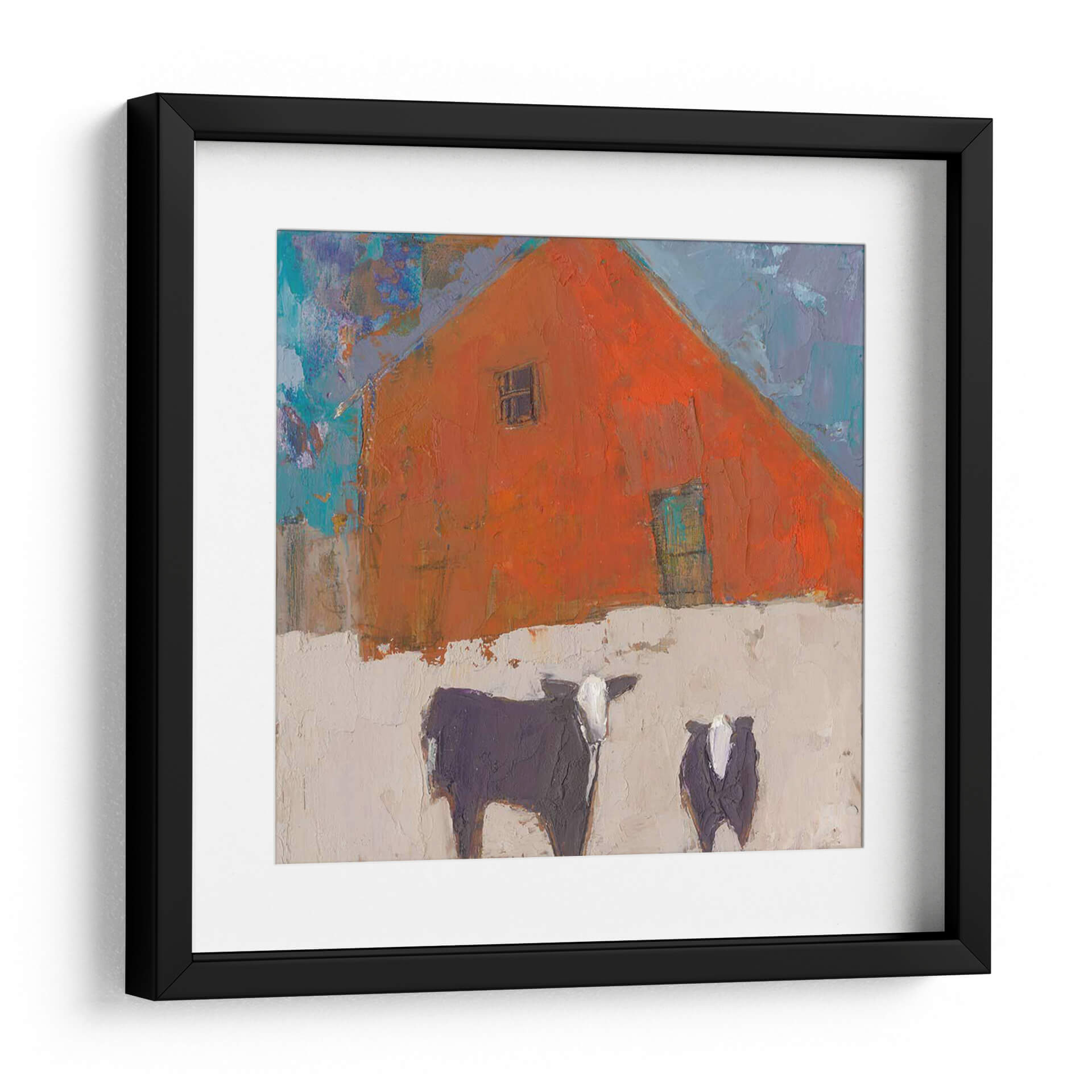 Sumérgete en la atmósfera rústica y vibrante de "Avellana-II", una obra de arte contemporáneo que captura la esencia de la vida rural con un toque moderno y expresionista. Este cuadro decorativo presenta una imponente estructura de granero de color naranja intenso, cuya forma triangular domina la composición, acentuada por un pequeño y enigmático recuadro y una puerta de un sereno tono aguamarina. La textura rica y empastada de la pintura invita a la contemplación, mientras que el contraste entre el naranja ardiente del granero y el cielo azul vibrante, salpicado de pinceladas audaces, crea una dinámica visual cautivadora. En primer plano, dos figuras bovinas, una más grande y detallada que la otra, aportan un elemento de familiaridad y calidez al paisaje. Sus siluetas oscuras, con detalles en blanco, se recortan sobre un fondo de tono tierra claro y texturizado, sugiriendo un ambiente sereno y quizás invernal. "Avellana-II" es una pieza que evoca sentimientos de tranquilidad y conexión con la naturaleza, ideal para añadir un punto focal lleno de carácter a salones modernos, cocinas rústicas o incluso estudios creativos. Su estilo único y su paleta de colores audaz la convierten en una adición memorable a cualquier colección de arte de pared.