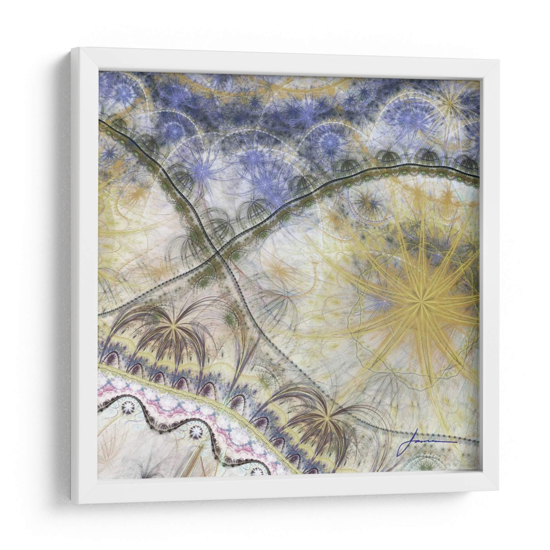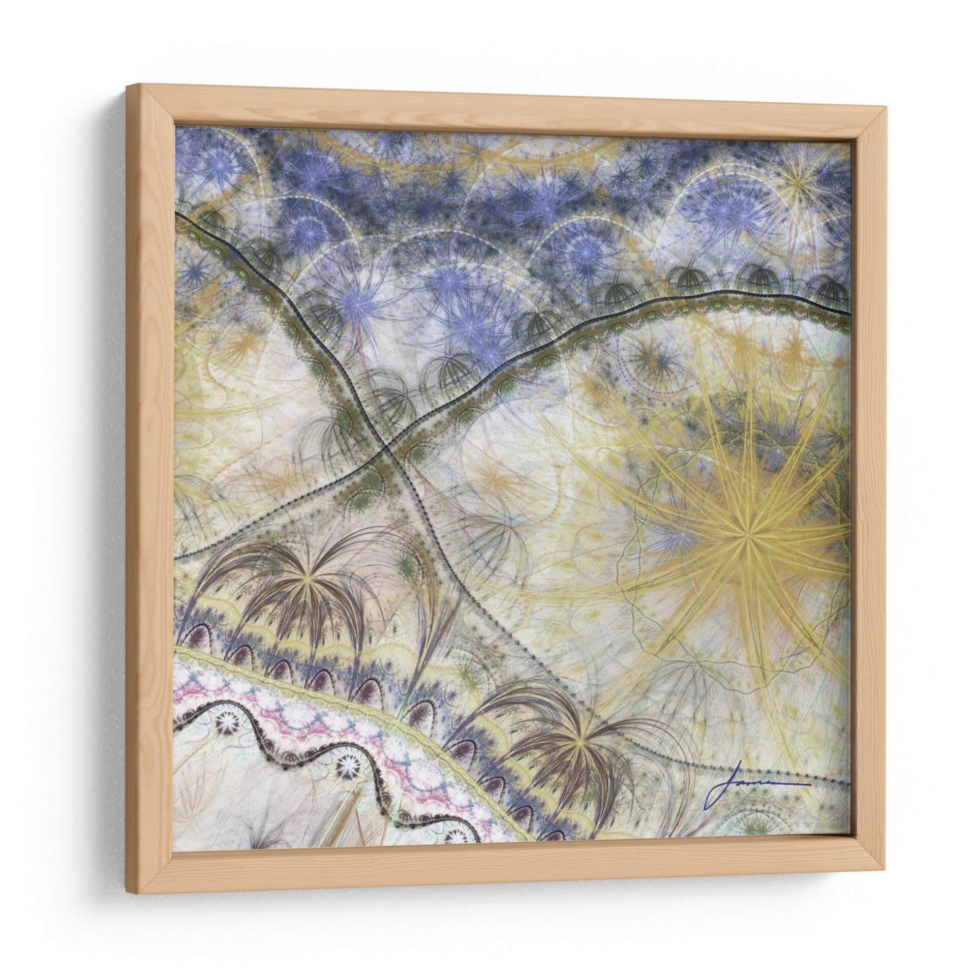 Sumérgete en la intrincada belleza de "Beduina Mapa I", una obra de arte digital que desafía la percepción y te transporta a un universo de formas y colores fascinantes. El artista James Burghardt presenta una composición abstracta donde delicadas estructuras fractales se entrelazan, evocando la sensación de un mapa cósmico o un intrincado tapiz orgánico. Predominan los tonos pastel, con suaves lavandas, amarillos dorados y toques de verde musgo, creando una atmósfera etérea y serena que invita a la contemplación. Las formas circulares y radiales, similares a flores estilizadas o explosiones de luz, añaden un dinamismo sutil a la pieza, mientras que las líneas oscuras y las texturas granuladas aportan profundidad y complejidad visual. Este cuadro decorativo es perfecto para añadir un toque de sofisticación y misterio a cualquier espacio, ya sea una sala de estar moderna, un estudio tranquilo o un dormitorio que busque inspiración. Su estilo abstracto y contemporáneo lo convierte en un punto focal intrigante que stimula la imaginación y la conversación, ideal para quienes aprecian el arte que combina precisión matemática con una estética cautivadora y emocionalmente resonante. "Beduina Mapa I" es una ventana a un mundo de patrones complejos, un lienzo que celebra la armonía oculta en la naturaleza y la abstracción.