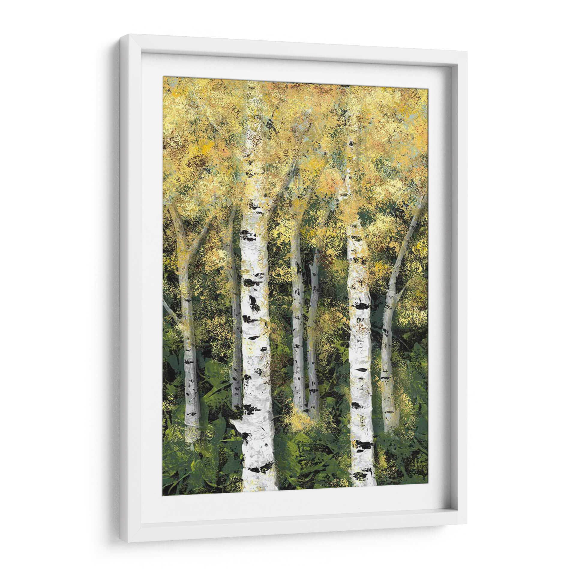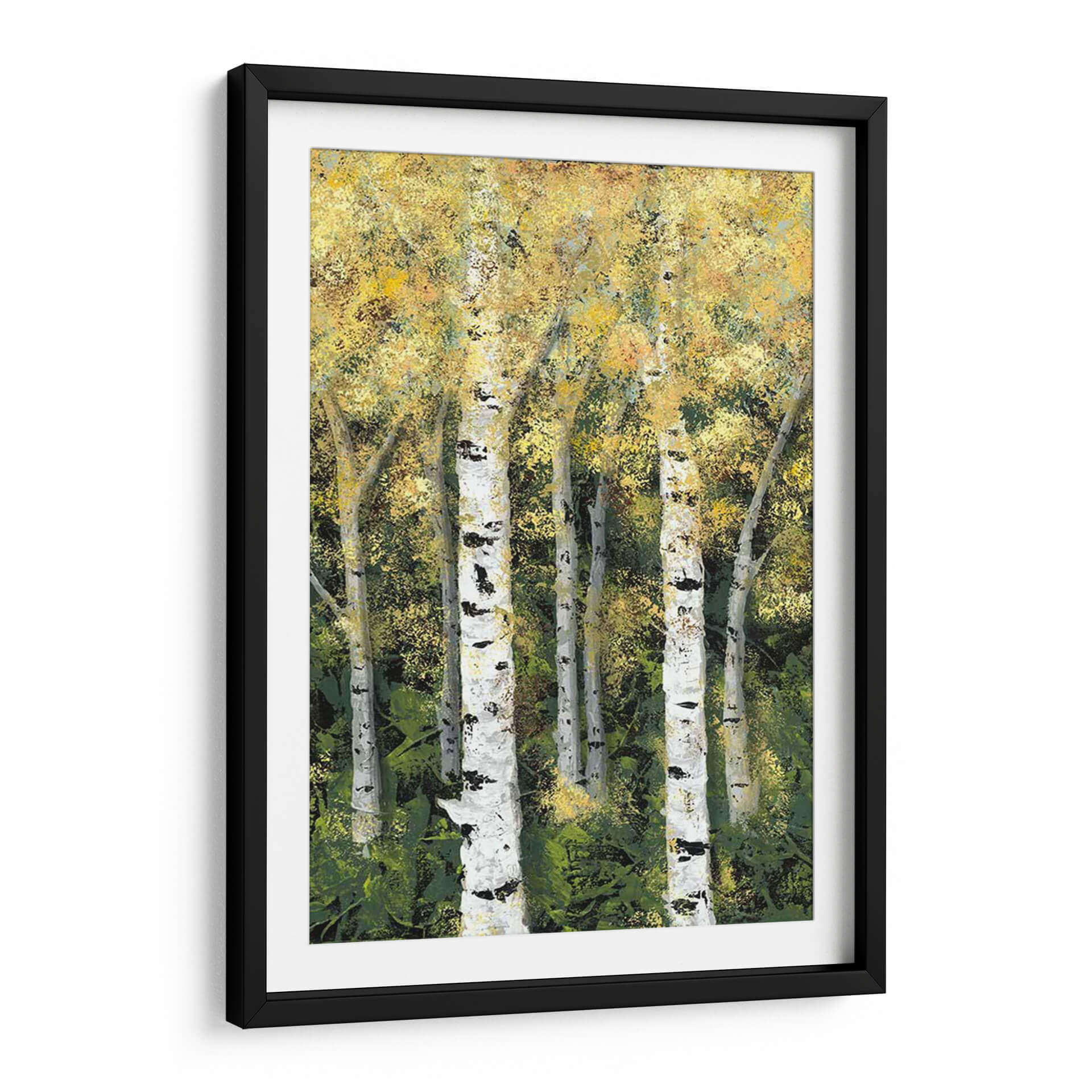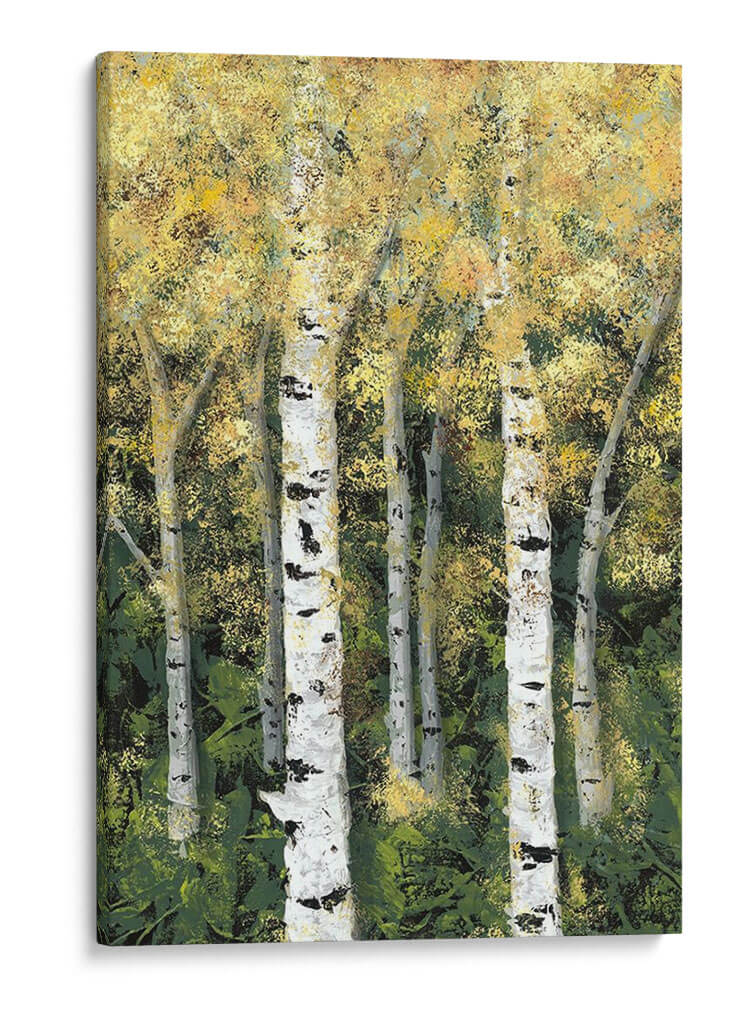 Sumérgete en la serenidad del bosque con 'Birch Treeline II' de Jade Reynolds, una obra maestra que captura la esencia de un bosque de abedules bañado por la luz. Los troncos blancos y negros de los abedules se alzan majestuosamente contra un follaje denso y texturizado, pintado en una paleta de verdes profundos y amarillos vibrantes que evocan la calidez del sol filtrándose entre las hojas. La técnica pictórica, con pinceladas expresivas y un juego de luces y sombras, otorga a la pieza una profundidad y vitalidad únicas, creando una atmósfera de tranquilidad y conexión con la naturaleza. Este cuadro decorativo es la elección perfecta para transformar cualquier espacio, aportando un toque de frescura y calma. Ideal para salones, dormitorios u oficinas, 'Birch Treeline II' invita a la contemplación y añade un elemento natural y sofisticado a tu decoración. Su estilo contemporáneo y la emotividad que transmite lo convierten en una pieza de arte de pared que no solo embellece, sino que también inspira y eleva el espíritu, creando un ambiente acogedor y lleno de vida. Descubre la belleza atemporal de la naturaleza a través de la visión artística de Jade Reynolds.