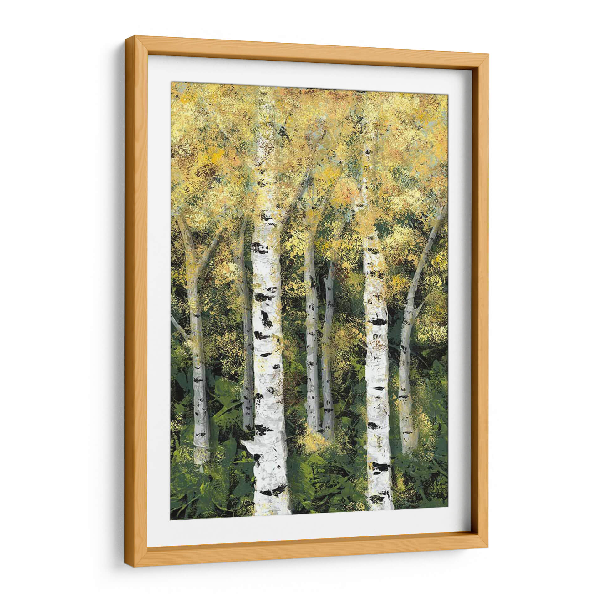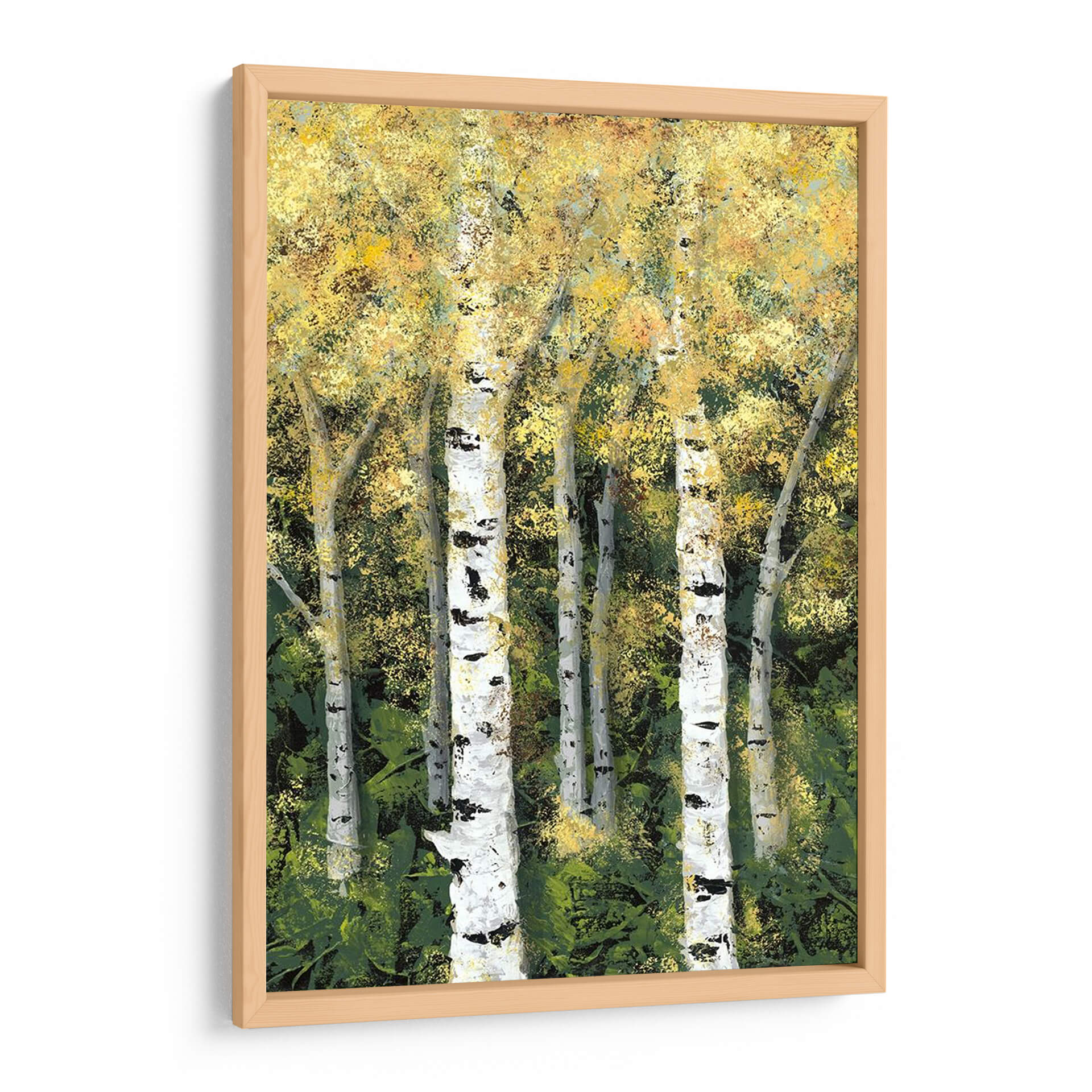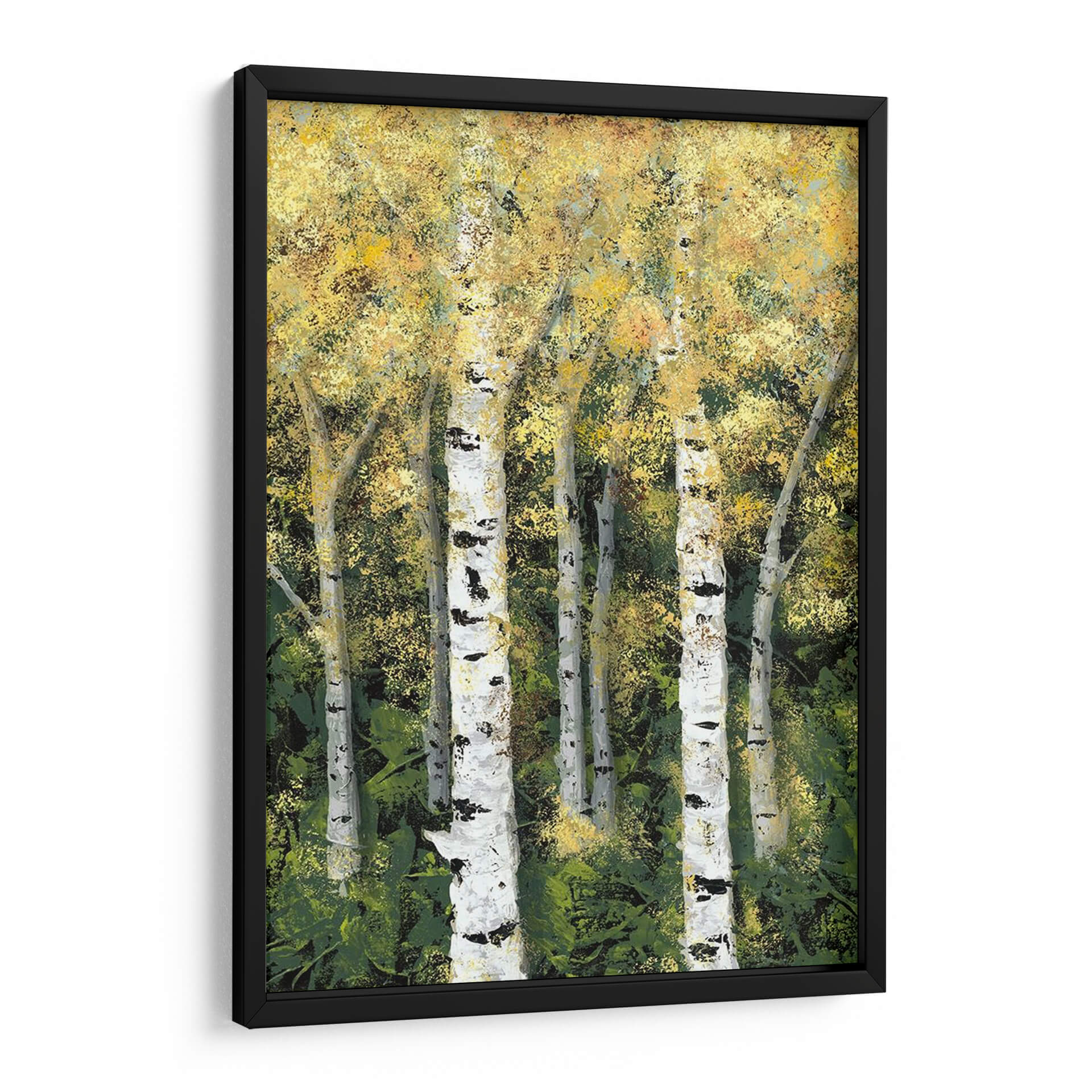 Sumérgete en la serenidad del bosque con 'Birch Treeline II' de Jade Reynolds, una obra maestra que captura la esencia de un bosque de abedules bañado por la luz. Los troncos blancos y negros de los abedules se alzan majestuosamente contra un follaje denso y texturizado, pintado en una paleta de verdes profundos y amarillos vibrantes que evocan la calidez del sol filtrándose entre las hojas. La técnica pictórica, con pinceladas expresivas y un juego de luces y sombras, otorga a la pieza una profundidad y vitalidad únicas, creando una atmósfera de tranquilidad y conexión con la naturaleza. Este cuadro decorativo es la elección perfecta para transformar cualquier espacio, aportando un toque de frescura y calma. Ideal para salones, dormitorios u oficinas, 'Birch Treeline II' invita a la contemplación y añade un elemento natural y sofisticado a tu decoración. Su estilo contemporáneo y la emotividad que transmite lo convierten en una pieza de arte de pared que no solo embellece, sino que también inspira y eleva el espíritu, creando un ambiente acogedor y lleno de vida. Descubre la belleza atemporal de la naturaleza a través de la visión artística de Jade Reynolds.