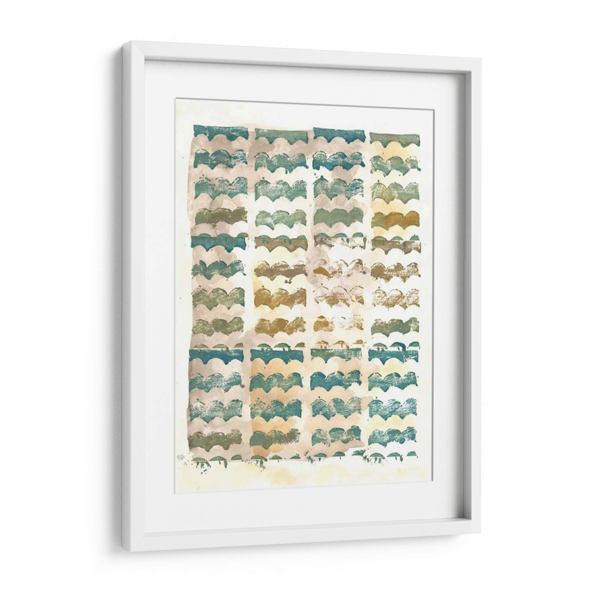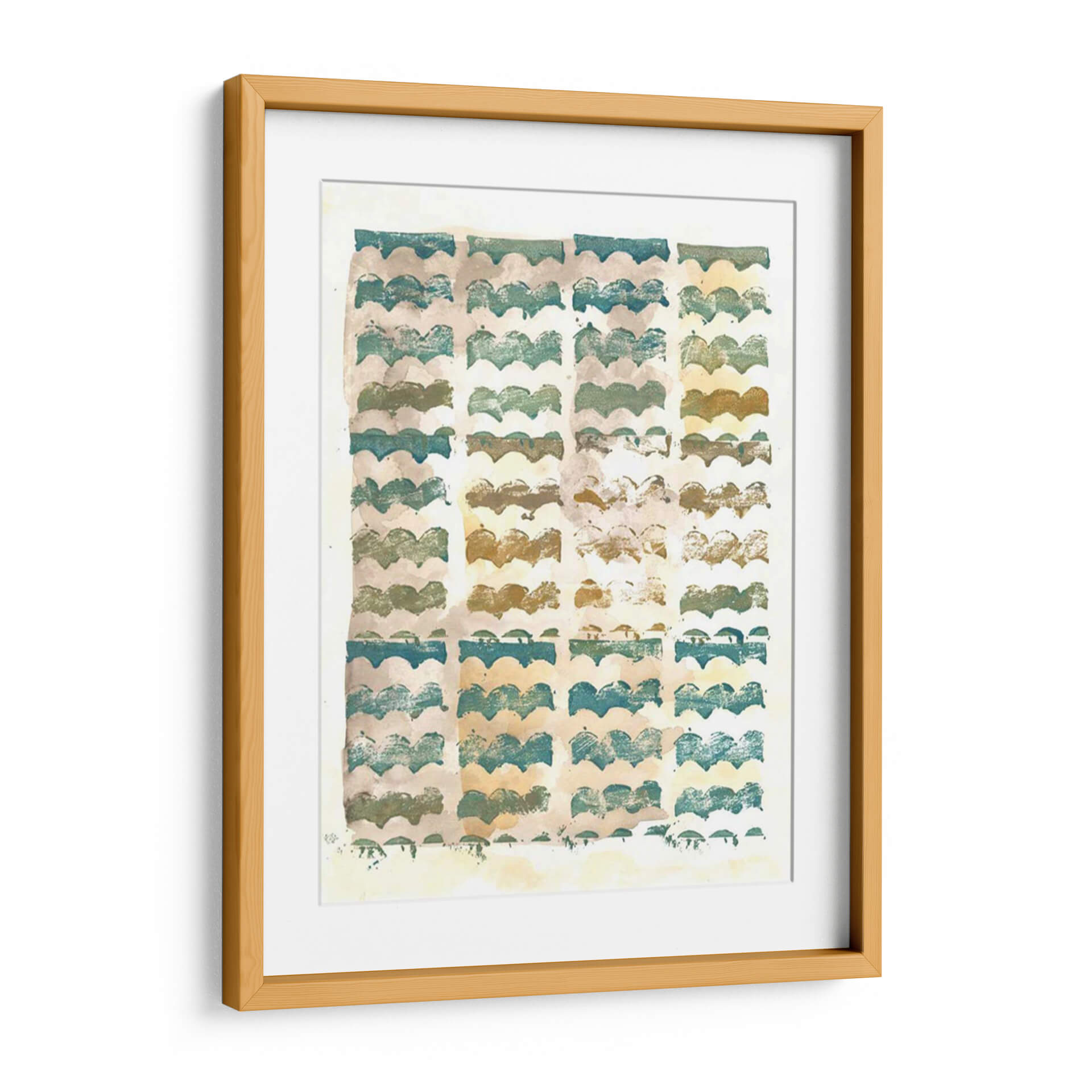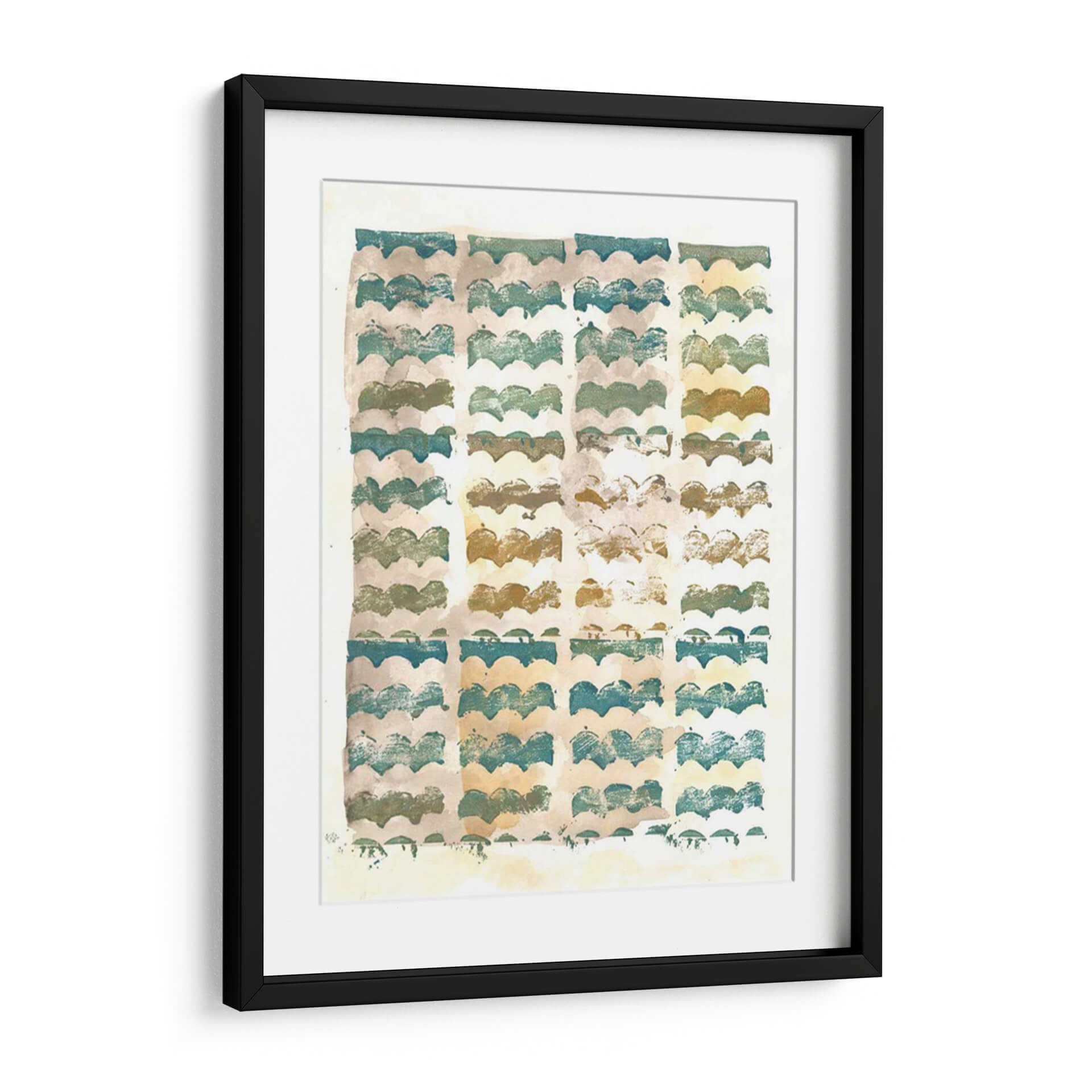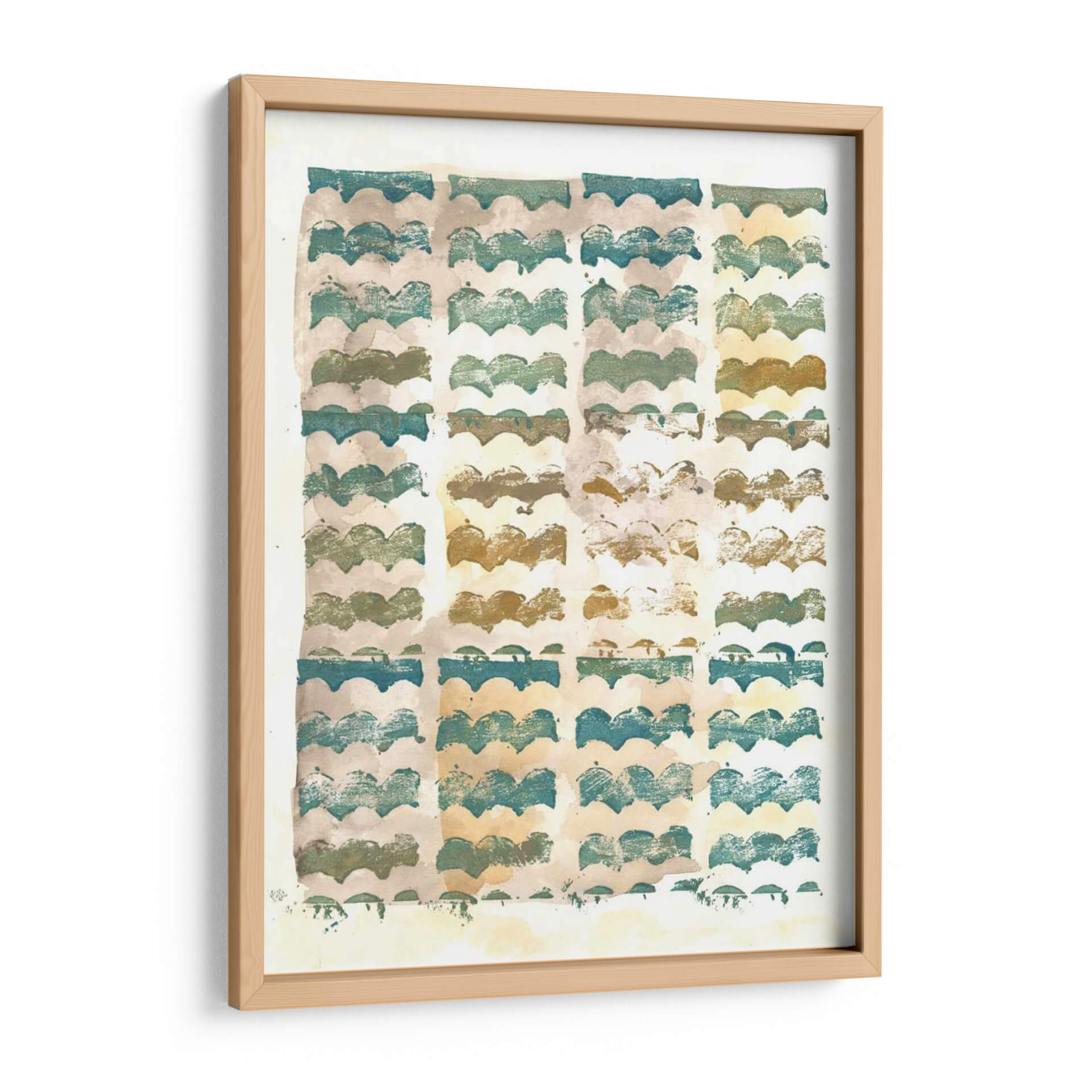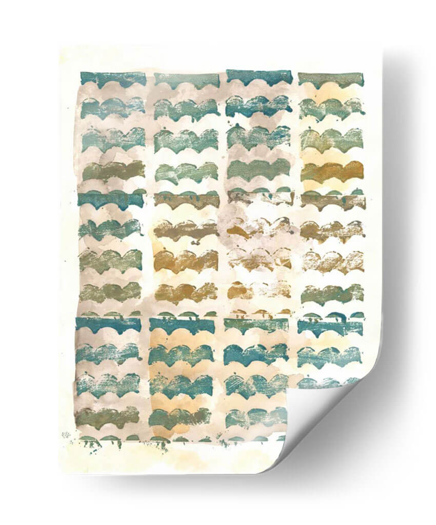 Sumérgete en la serena belleza de "Cadence II" de Chariklia Zarris, una obra de arte abstracto que evoca la tranquilidad del océano y la armonía de la naturaleza. Este cuadro decorativo presenta una cautivadora repetición de formas onduladas en tonos tierra, verde azulado y ocre, creando un patrón rítmico que invita a la contemplación. La paleta de colores terrosos y acuáticos aporta una sensación de calma y conexión con el entorno natural, ideal para infundir serenidad en cualquier espacio. La composición, organizada en columnas verticales con sutiles variaciones en cada fila, ofrece un equilibrio visual fascinante, mientras que la textura sugerida por las pinceladas añade profundidad y carácter a la pieza. "Cadence II" es perfecto para quienes buscan un toque de sofisticación orgánica en su hogar u oficina, funcionando como un punto focal discreto pero impactante. Este arte de pared contemporáneo es una elección excelente para salones, dormitorios o estudios, aportando una atmósfera de paz y elegancia atemporal a tu decoración.