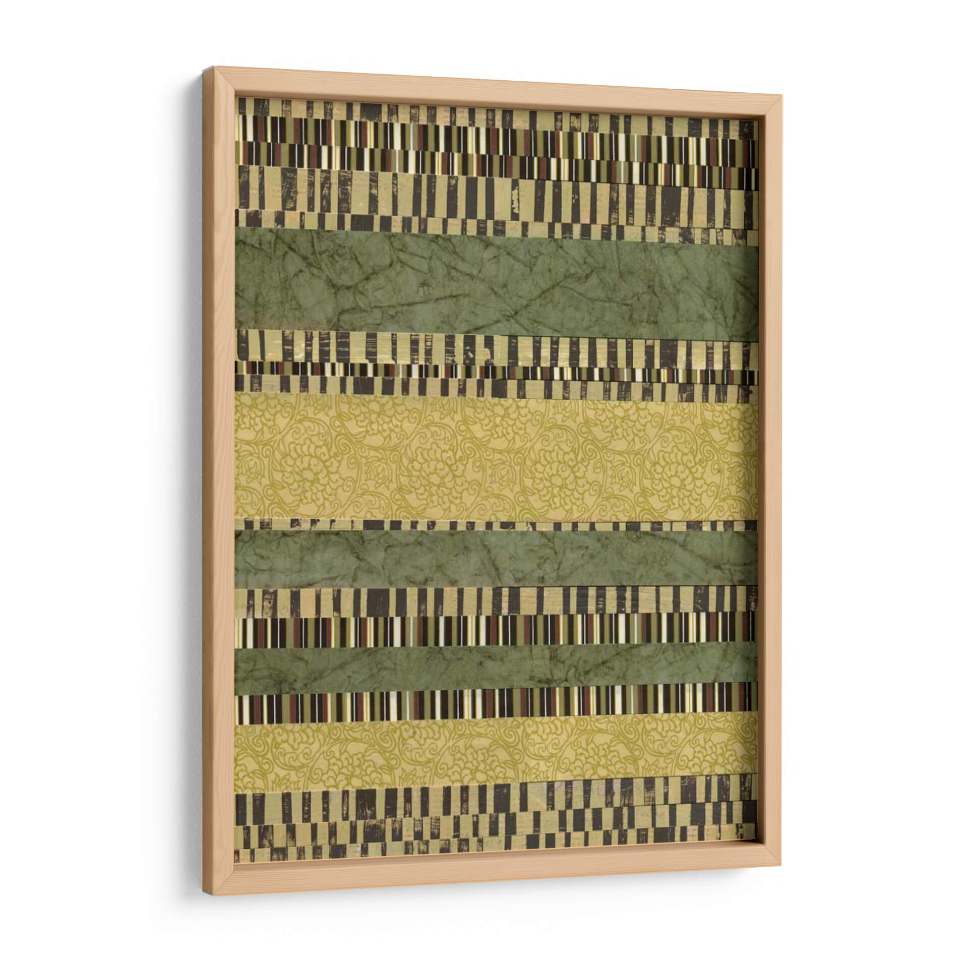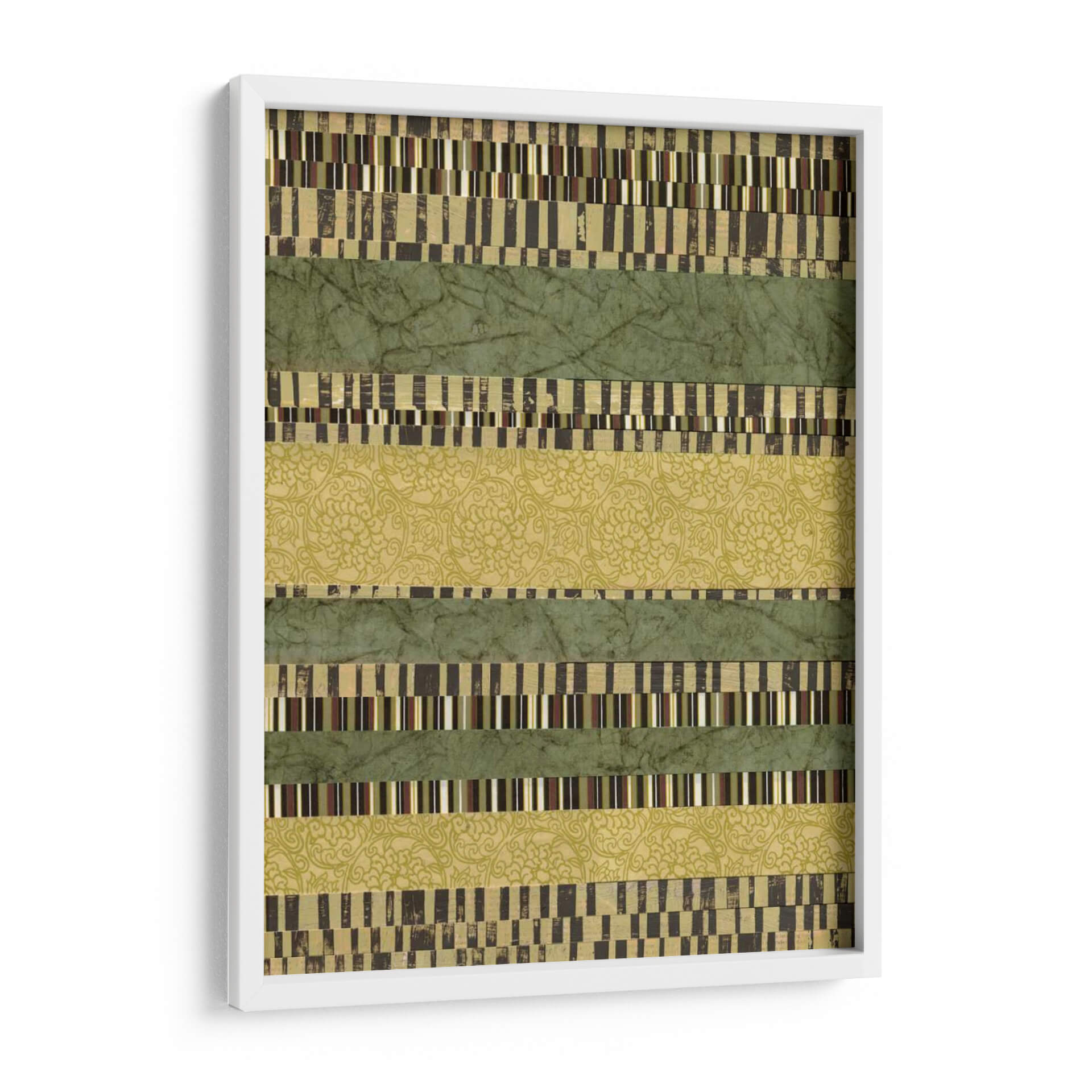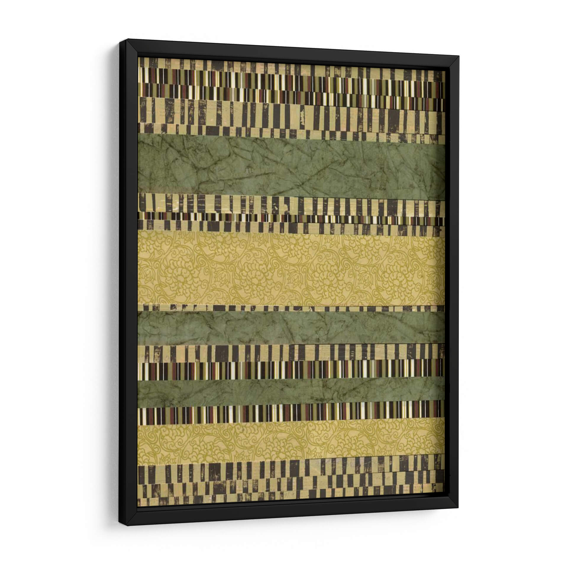 Sumérgete en la serenidad y el orden visual con "Capas Lineales II", una obra de arte contemporáneo de Jennifer Goldberger que redefine la abstracción geométrica. Esta pieza cautiva con su estructura de bandas horizontales, donde se entrelazan texturas y patrones que invitan a la contemplación. Las franjas verdes, en tonos musgo y esmeralda, evocan la calma de la naturaleza, mientras que las capas intercaladas de patrones intrincados y bloques de color rectangulares añaden profundidad y un toque de sofisticación. La paleta de colores, dominada por verdes terrosos y acentos dorados y marrones, crea una atmósfera de equilibrio y armonía, perfecta para cualquier espacio que busque transmitir tranquilidad y elegancia. "Capas Lineales II" es más que un simple cuadro decorativo; es una invitación a explorar la belleza de la repetición, la variación y la composición lineal. Ideal para salones modernos, oficinas o dormitorios, este cuadro decorativo aporta un toque de diseño contemporáneo y una sensación de paz. Añade esta pieza única a tu colección y transforma tu hogar en un santuario de estilo y serenidad.