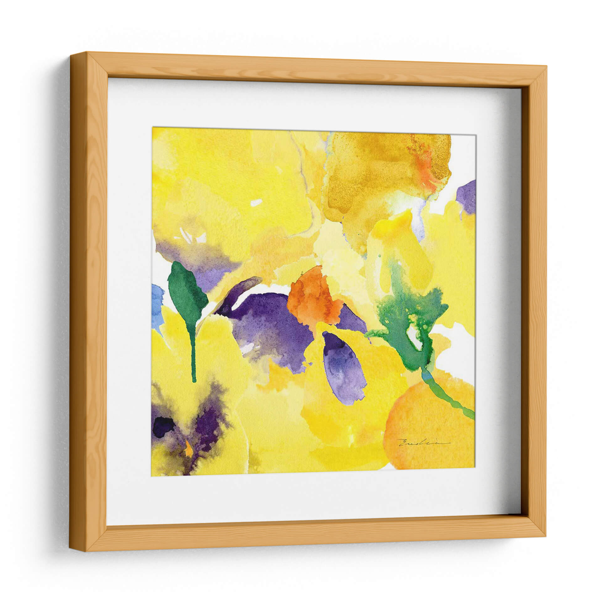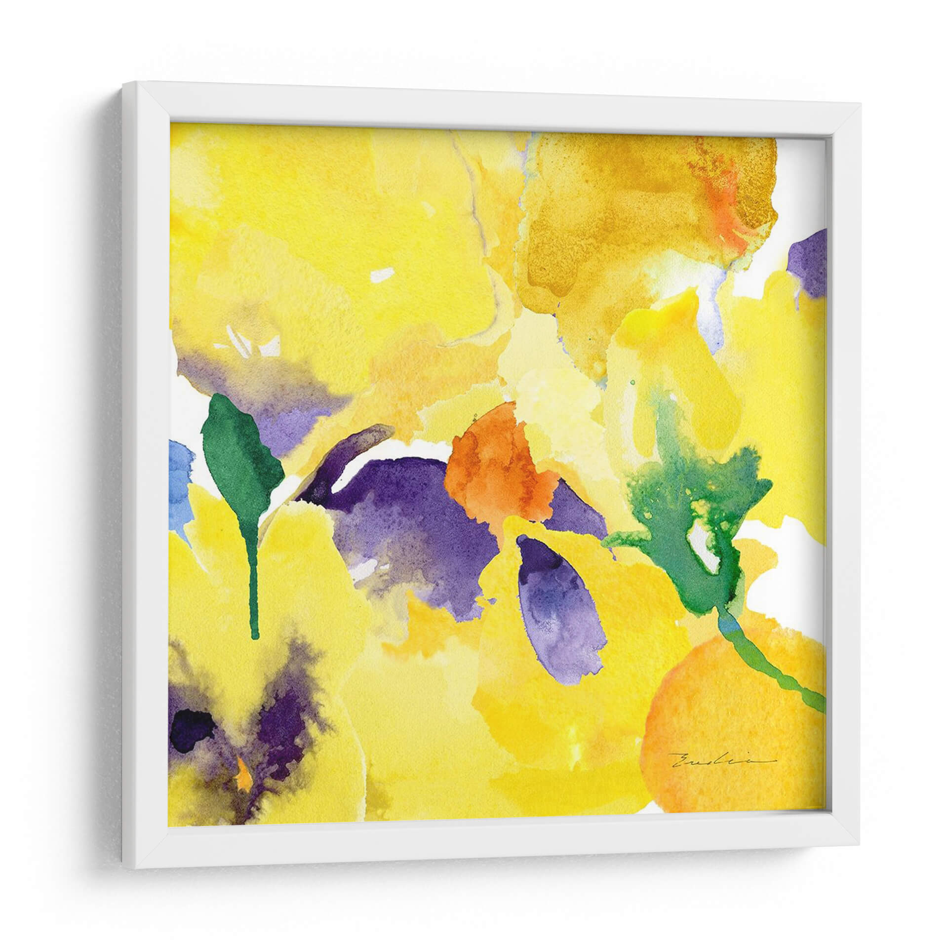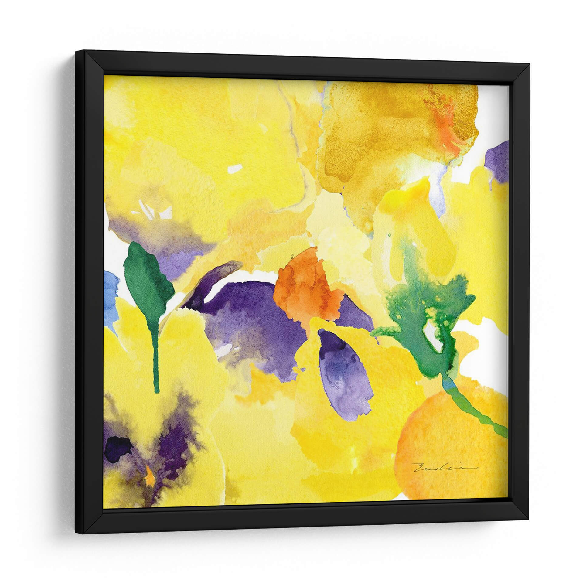 Sumérgete en la vibrante energía de "Composición De Flores De Acuarela V", una obra de arte que captura la esencia de la primavera con una explosión de colores. Esta pieza, creada por Evelia Designs, utiliza la delicadeza de la acuarela para dar vida a un jardín floral abstracto. Las pinceladas fluidas y las manchas de color se entrelazan para formar un tapiz visual que evoca alegría y vitalidad. Predominan los tonos amarillos luminosos, que irradian calidez y optimismo, contrastando elegantemente con toques de morado intenso y verde esmeralda, y sutiles acentos de naranja vibrante. La composición, aunque abstracta, sugiere la forma etérea de las flores, invitando a la contemplación y al disfrute de la belleza natural. Este cuadro decorativo es perfecto para iluminar cualquier espacio, aportando un toque de frescura y sofisticación a salones, dormitorios o estudios. Ideal para quienes buscan una decoración que transmita positividad y un estilo contemporáneo y artístico, esta obra se convertirá en el punto focal de tu ambiente, recordándote la efímera belleza de la naturaleza.