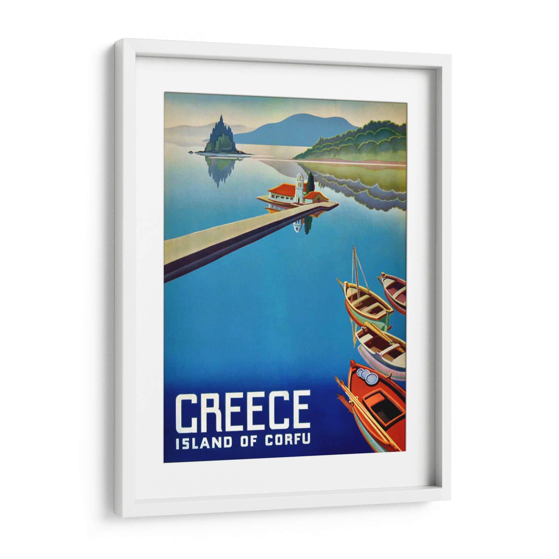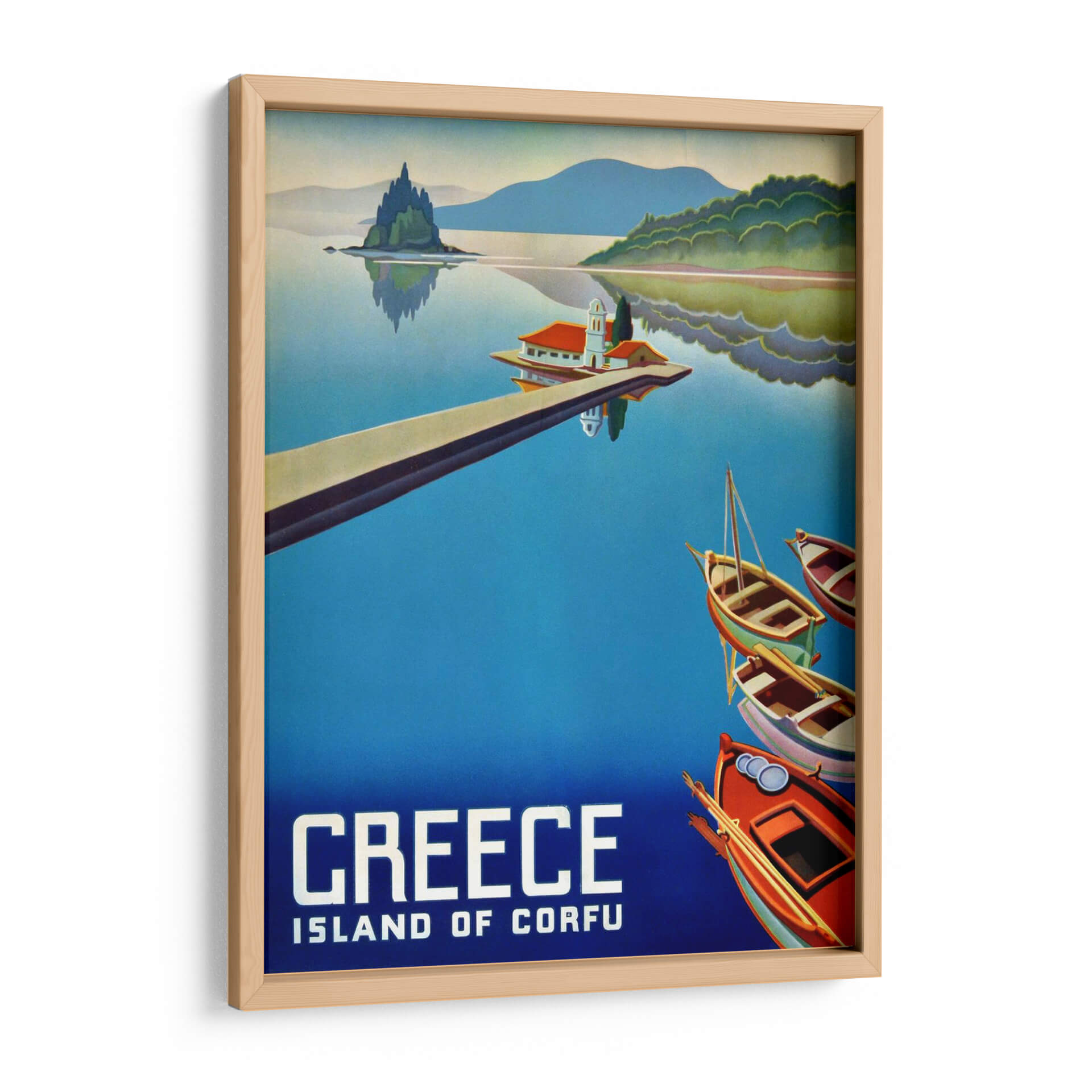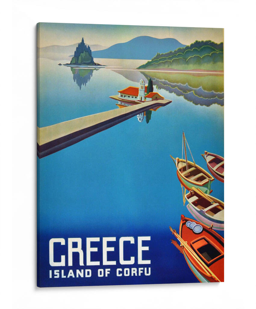 Sumérgete en la serenidad del Mediterráneo con este evocador cuadro decorativo de Corfu, Grecia. La obra captura la esencia de una idílica isla griega, con aguas de un azul profundo que reflejan un cielo despejado y montañas ondulantes en la distancia. Un muelle alargado conduce a una encantadora edificación con techo rojo, adornada con una torre blanca, que parece flotar sobre el mar. Varios barcos de pesca tradicionales, pintados en vibrantes tonos de naranja, verde y blanco, navegan suavemente en primer plano, aportando un toque de color y vitalidad a la escena. El estilo artístico, que recuerda a los carteles de viaje vintage, evoca una sensación de nostalgia y aventura, invitándote a soñar con vacaciones y exploraciones. Este cuadro es ideal para añadir un aire de tranquilidad y escapismo a tu sala de estar, dormitorio o estudio. Su composición equilibrada y su paleta de colores refrescante lo convierten en una pieza versátil, perfecta para complementar decoraciones costeras, minimalistas o contemporáneas, creando un ambiente de calma y belleza en cualquier espacio.