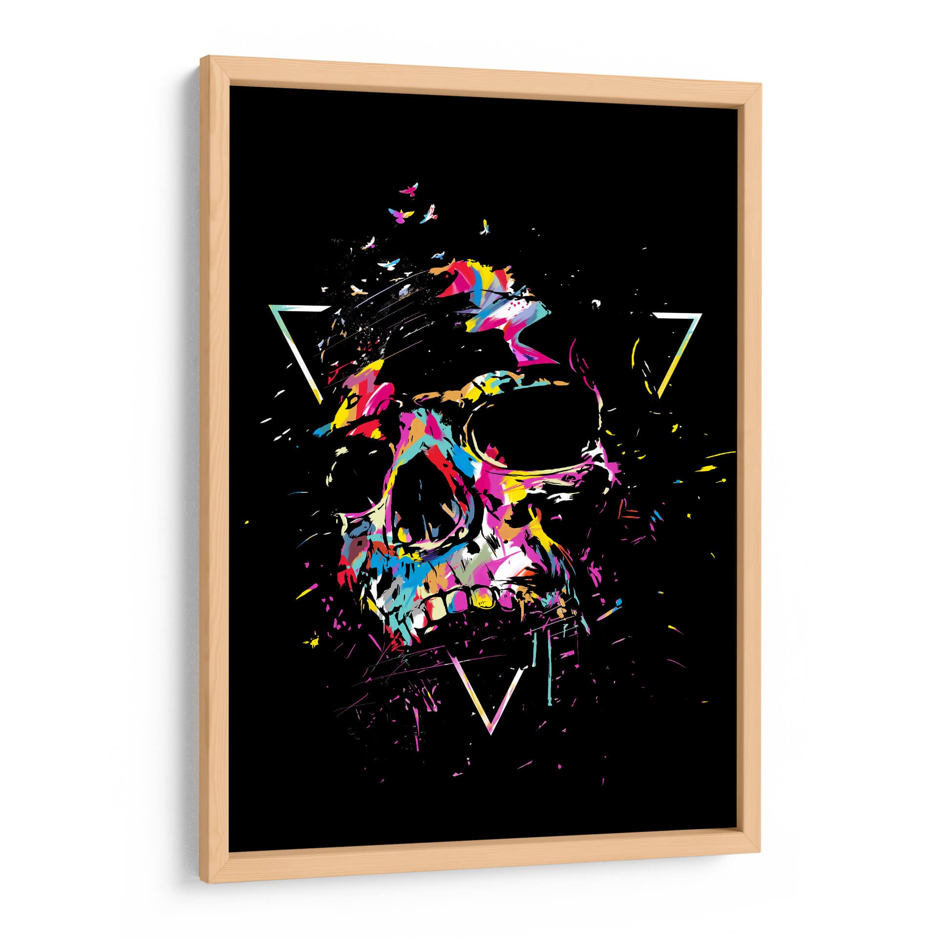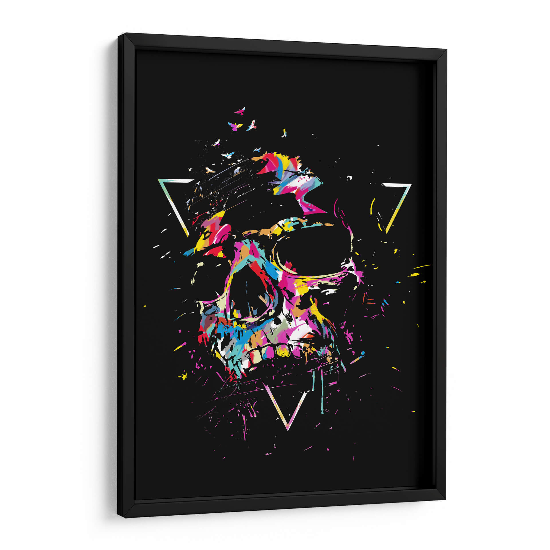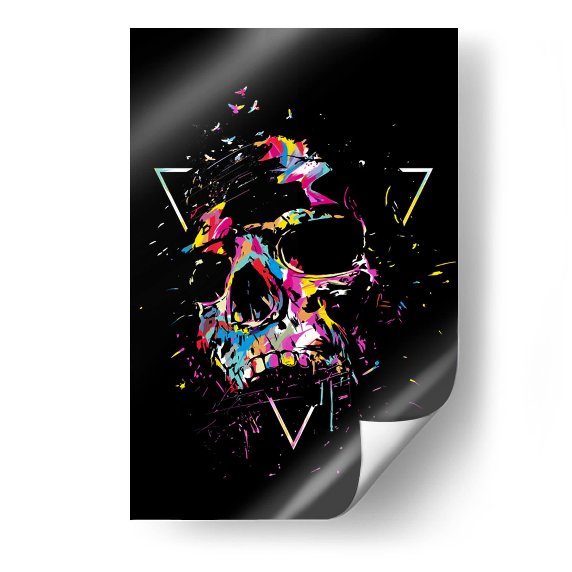 Captura la esencia de la vida y la muerte con nuestro impactante cuadro decorativo 'Cráneo X' de Balazs Solti. Esta obra de arte contemporánea presenta un cráneo vibrante y fragmentado, explota en una paleta de colores audaces y saturados, incluyendo rosas, azules, amarillos y verdes, que contrastan dramáticamente con el fondo negro profundo. Pequeñas siluetas de pájaros revolotean alrededor de la cabeza, añadiendo un toque de movimiento y libertad a la composición. El estilo artístico, una fusión de arte digital y pop art, crea una pieza visualmente dinámica y llena de energía, ideal para quienes buscan un elemento decorativo que provoque conversaciones y añada un toque audaz a su espacio. Los triángulos sutiles integrados en la composición añaden un elemento geométrico moderno. Este cuadro decorativo es perfecto para salas de estar modernas, estudios creativos, oficinas o cualquier ambiente que desee un acento de color y un toque de misterio. Transforma tu pared en una declaración de estilo con esta pieza única que combina lo macabro con lo vibrante y lo abstracto.