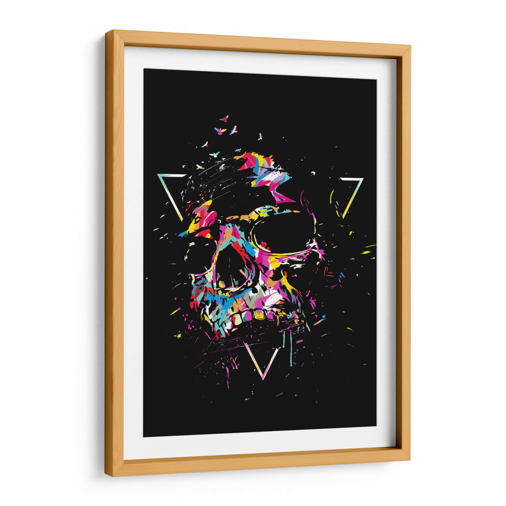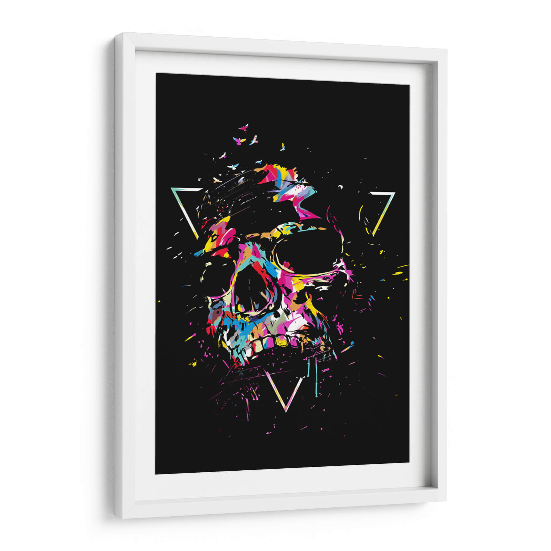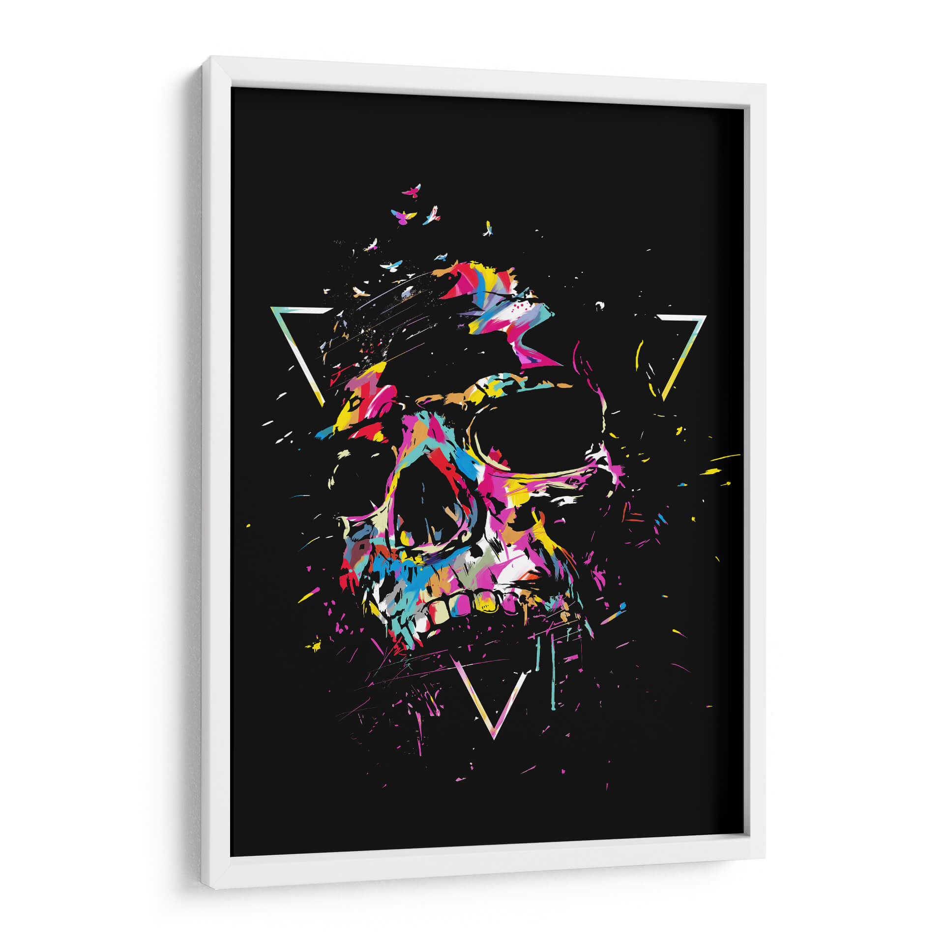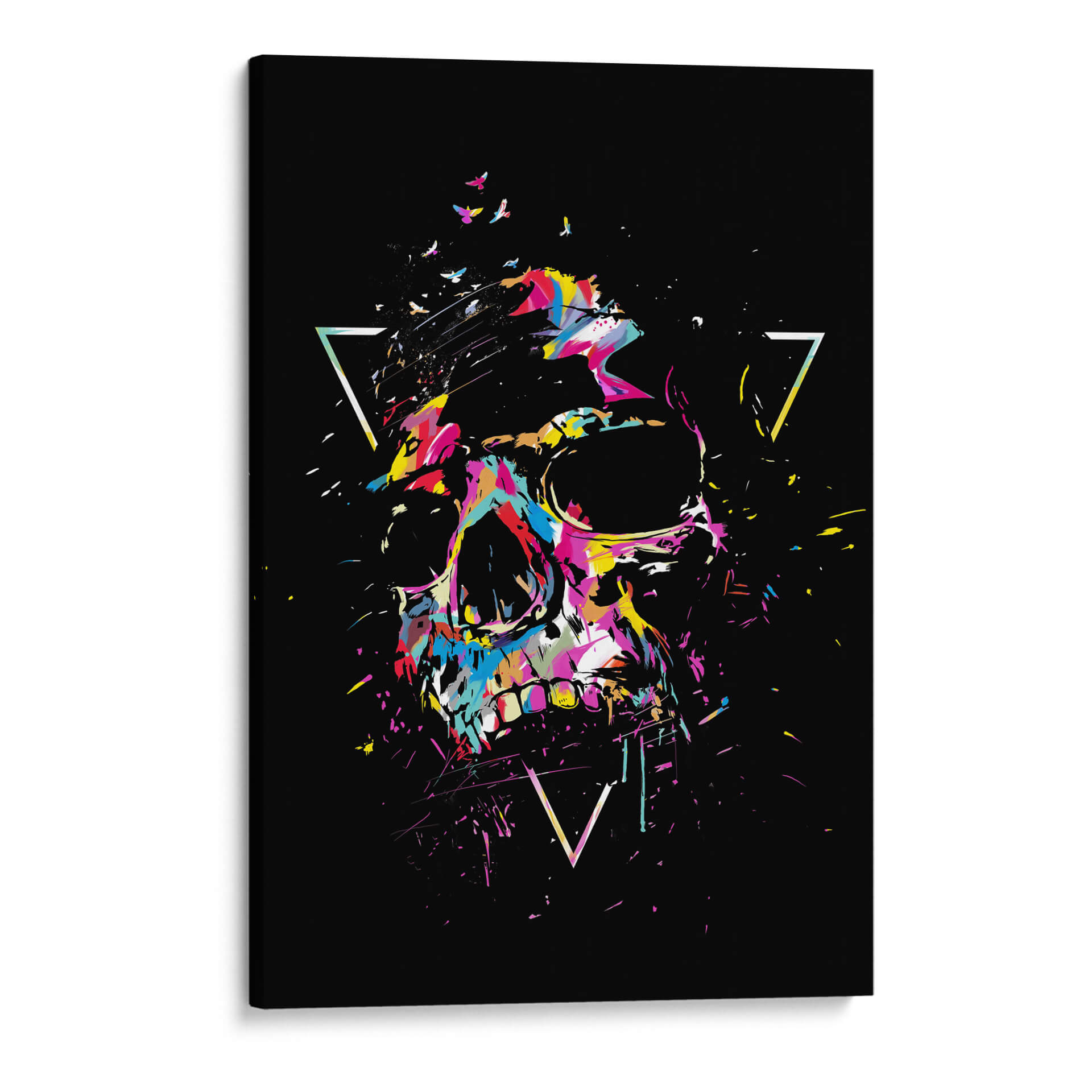 Captura la esencia de la vida y la muerte con nuestro impactante cuadro decorativo 'Cráneo X' de Balazs Solti. Esta obra de arte contemporánea presenta un cráneo vibrante y fragmentado, explota en una paleta de colores audaces y saturados, incluyendo rosas, azules, amarillos y verdes, que contrastan dramáticamente con el fondo negro profundo. Pequeñas siluetas de pájaros revolotean alrededor de la cabeza, añadiendo un toque de movimiento y libertad a la composición. El estilo artístico, una fusión de arte digital y pop art, crea una pieza visualmente dinámica y llena de energía, ideal para quienes buscan un elemento decorativo que provoque conversaciones y añada un toque audaz a su espacio. Los triángulos sutiles integrados en la composición añaden un elemento geométrico moderno. Este cuadro decorativo es perfecto para salas de estar modernas, estudios creativos, oficinas o cualquier ambiente que desee un acento de color y un toque de misterio. Transforma tu pared en una declaración de estilo con esta pieza única que combina lo macabro con lo vibrante y lo abstracto.