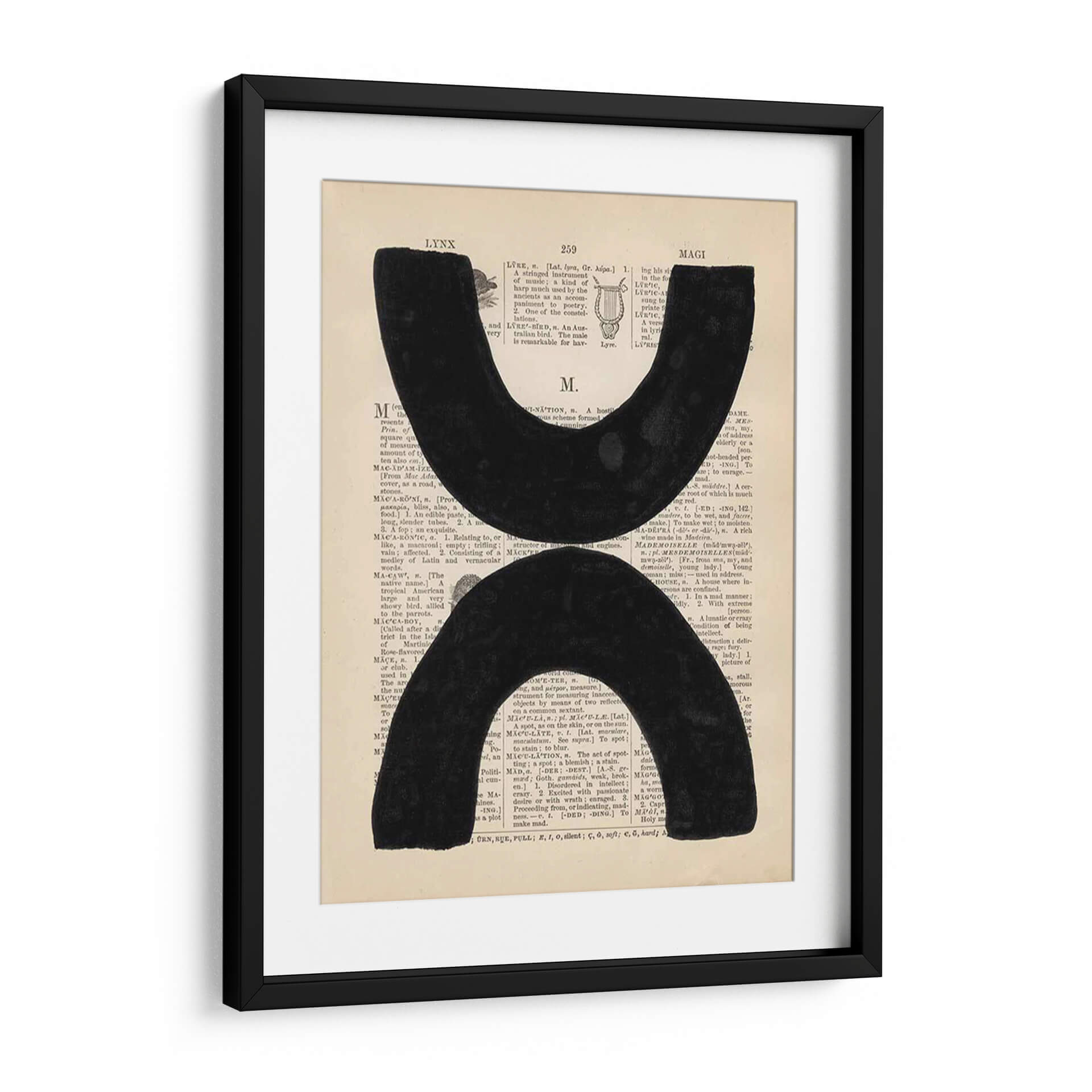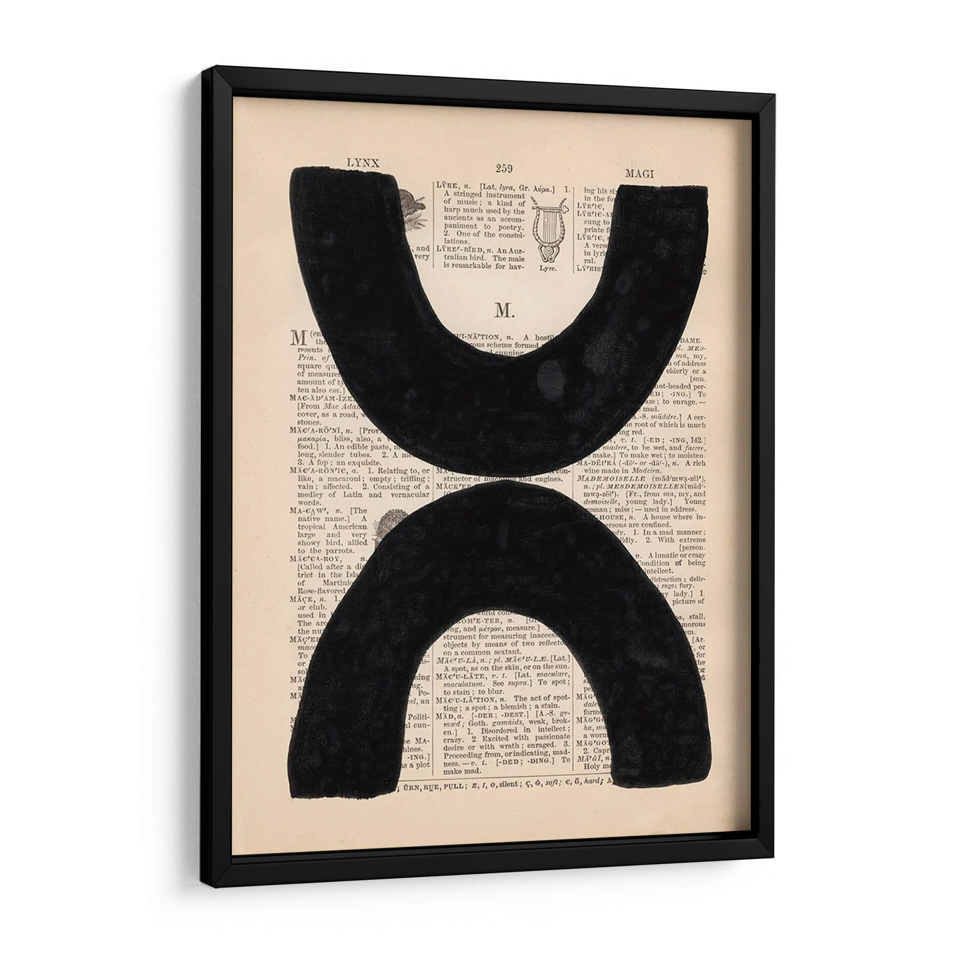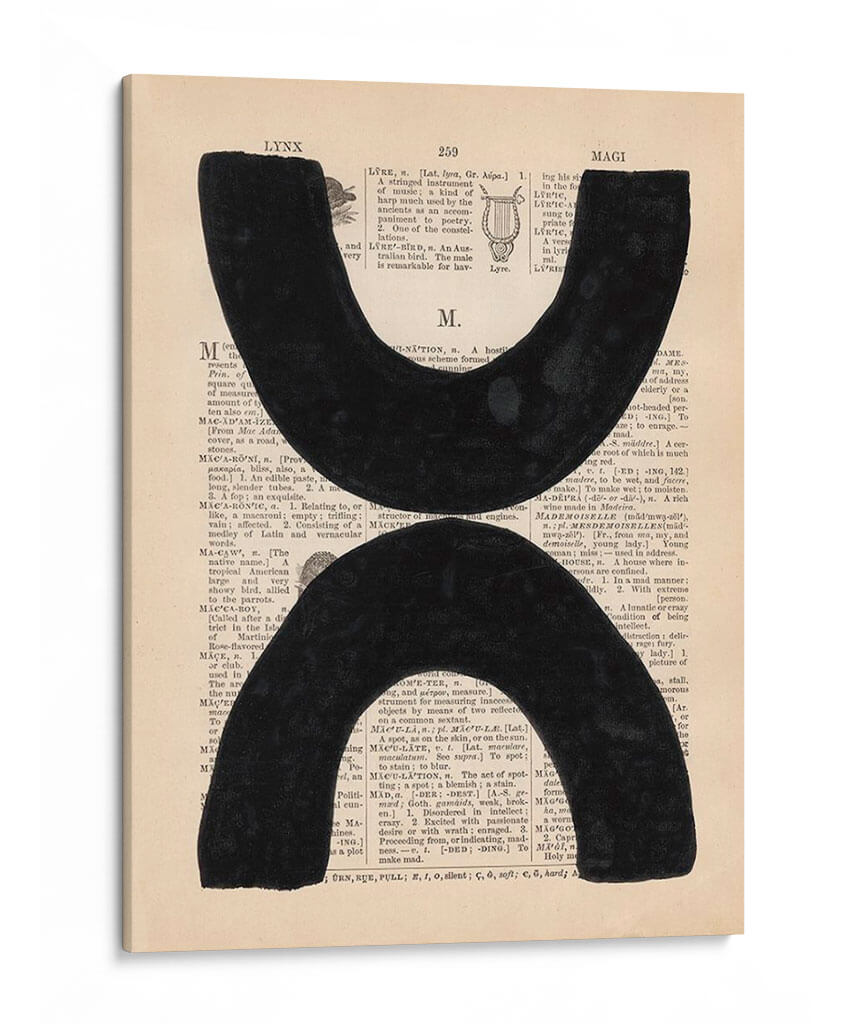 Sumérgete en la profundidad y el contraste de "Definición Moderna VII", una obra de arte contemporáneo que fusiona elementos gráficos con un fondo textual evocador. Dos formas abstractas y audaces en negro intenso contrastan poderosamente sobre un fondo que simula páginas de diccionario antiguas, creando una pieza que es a la vez intrigante y sofisticada. Los sutiles matices del papel y la tipografía añaden una capa de textura y profundidad, invitando a la contemplación. Este cuadro decorativo es perfecto para espacios que buscan un toque de modernidad con un guiño a la historia y el conocimiento. Su diseño minimalista pero impactante lo convierte en una elección ideal para salas de estar, estudios u oficinas, aportando un punto focal de elegancia y pensamiento. La composición equilibra el vacío y la presencia, generando un diálogo visual que estimula la imaginación y añade carácter a cualquier pared. "Definición Moderna VII" no es solo una pieza decorativa, es una declaración de estilo contemporáneo y un recordatorio del poder de la forma y el significado.
