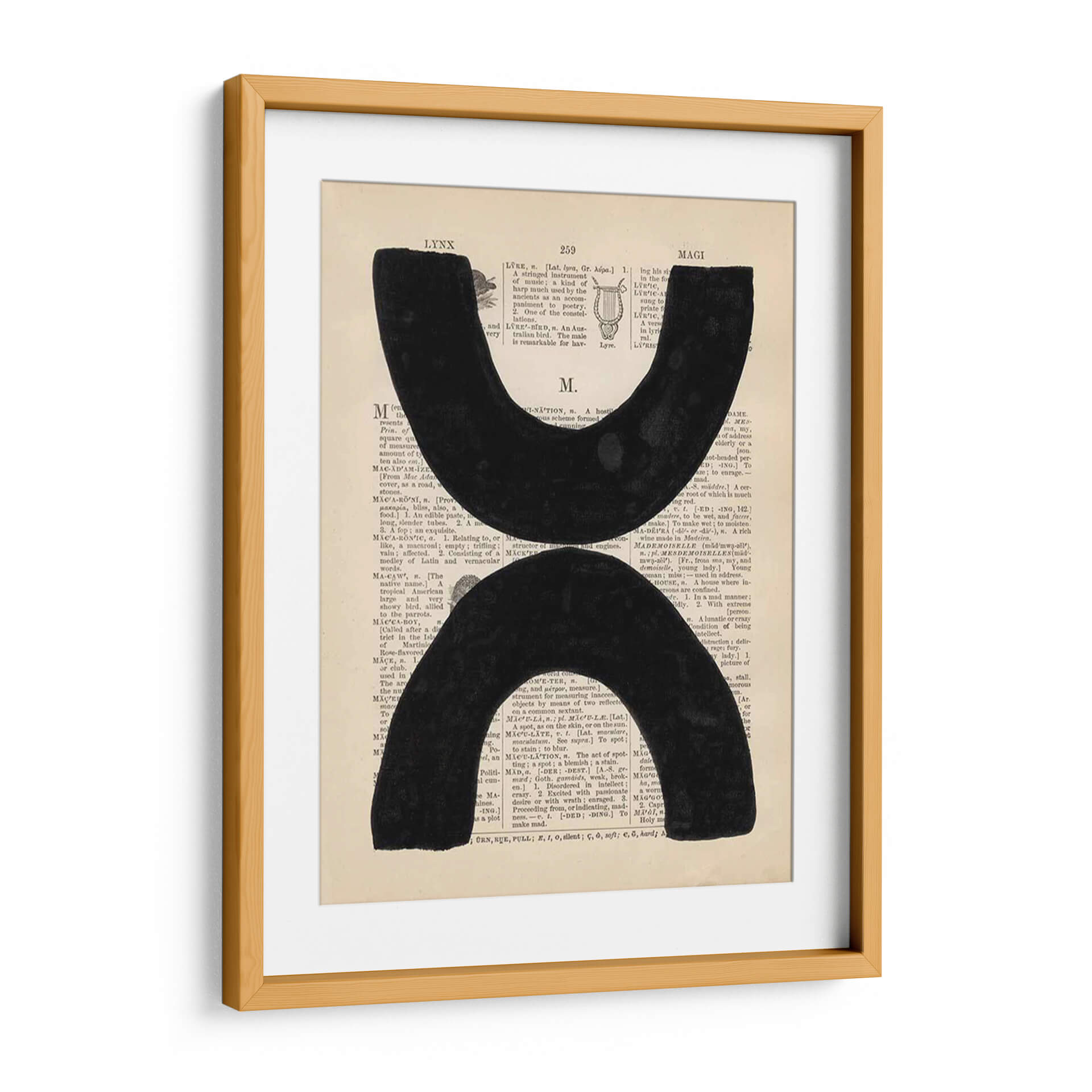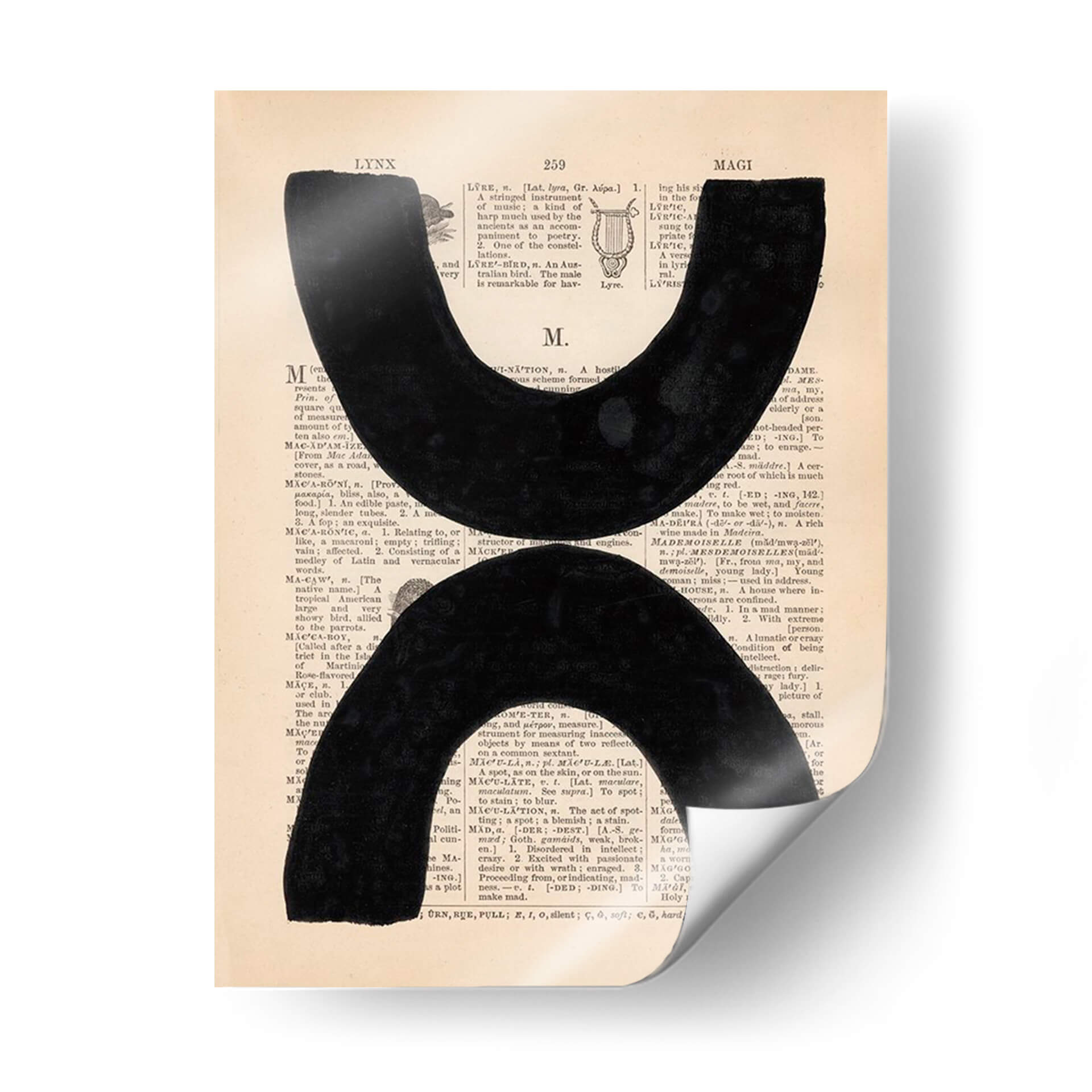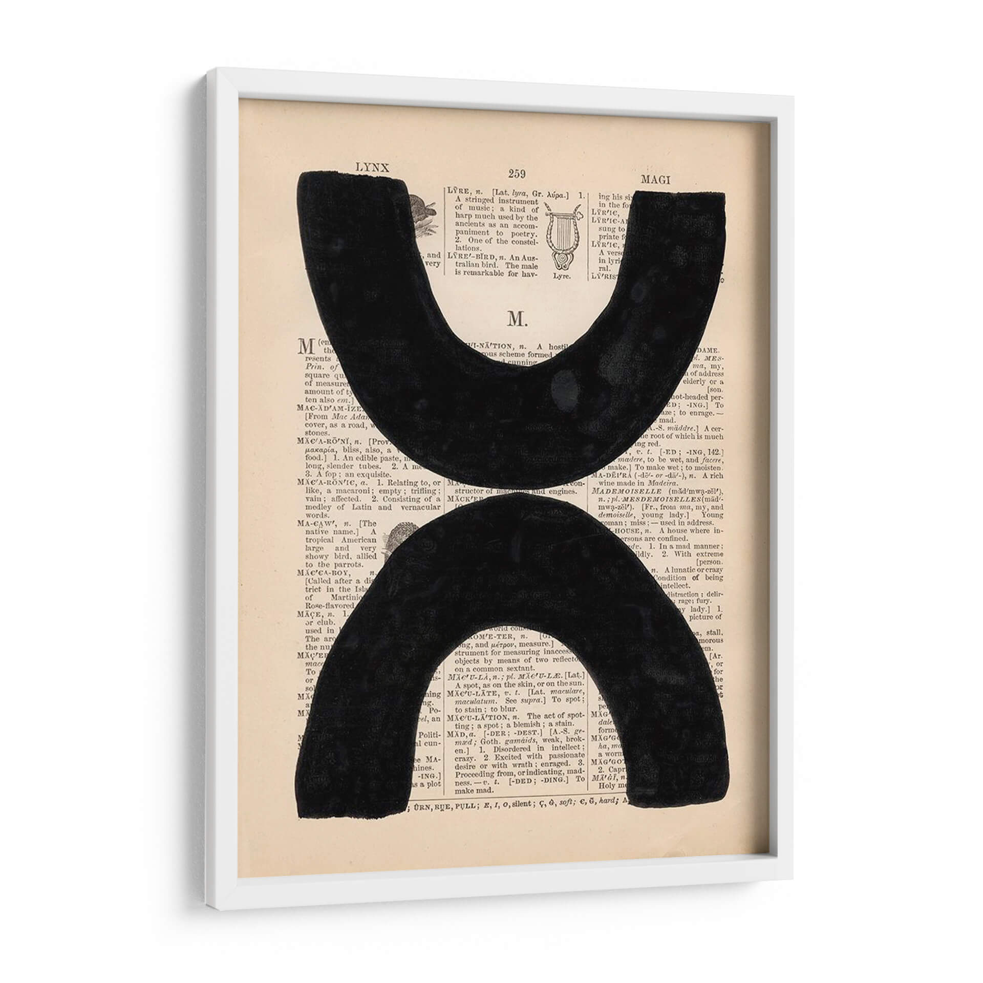Sumérgete en la profundidad y el contraste de "Definición Moderna VII", una obra de arte contemporáneo que fusiona elementos gráficos con un fondo textual evocador. Dos formas abstractas y audaces en negro intenso contrastan poderosamente sobre un fondo que simula páginas de diccionario antiguas, creando una pieza que es a la vez intrigante y sofisticada. Los sutiles matices del papel y la tipografía añaden una capa de textura y profundidad, invitando a la contemplación. Este cuadro decorativo es perfecto para espacios que buscan un toque de modernidad con un guiño a la historia y el conocimiento. Su diseño minimalista pero impactante lo convierte en una elección ideal para salas de estar, estudios u oficinas, aportando un punto focal de elegancia y pensamiento. La composición equilibra el vacío y la presencia, generando un diálogo visual que estimula la imaginación y añade carácter a cualquier pared. "Definición Moderna VII" no es solo una pieza decorativa, es una declaración de estilo contemporáneo y un recordatorio del poder de la forma y el significado.