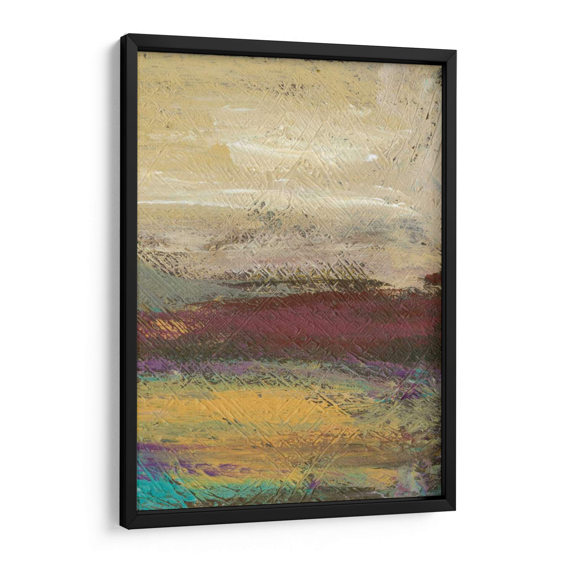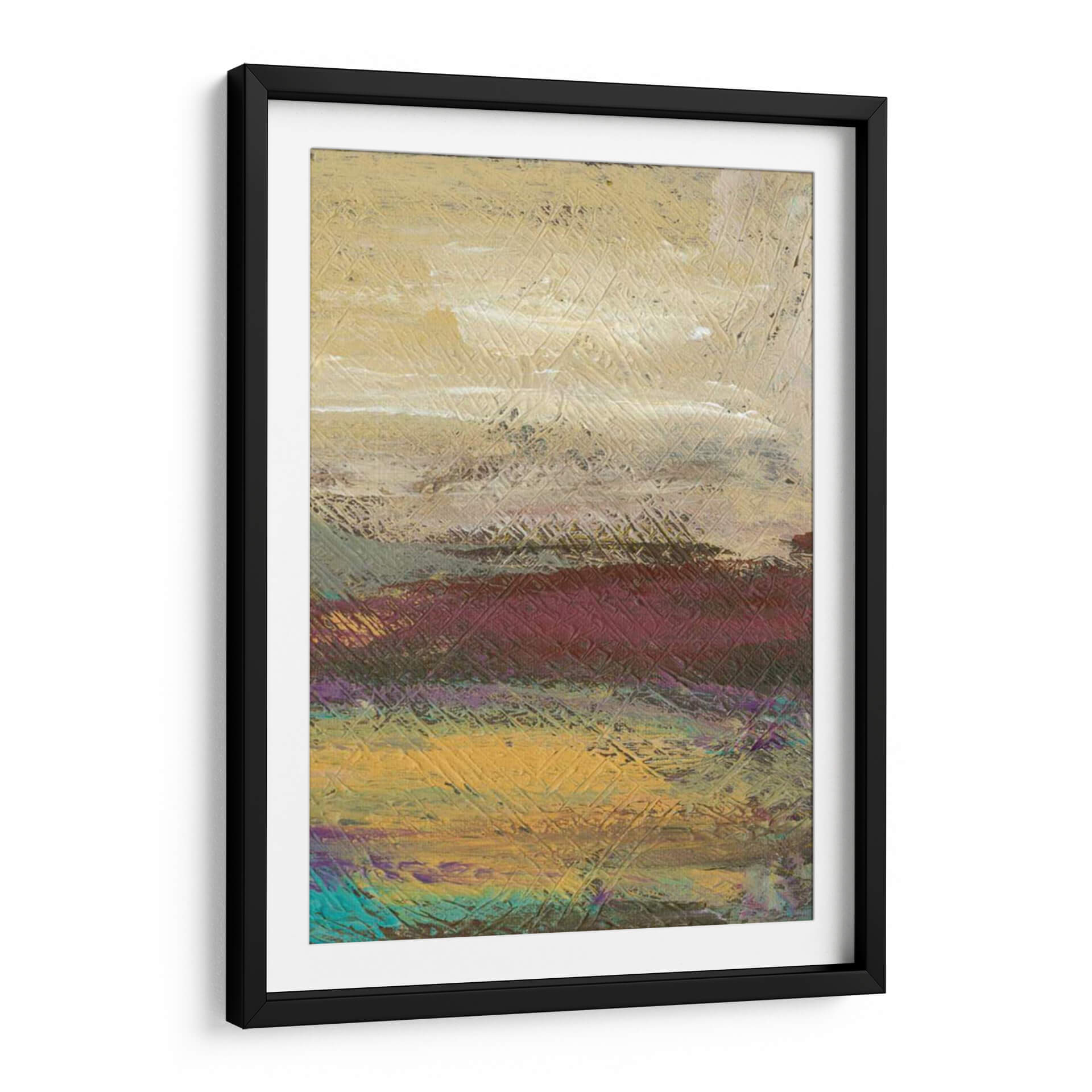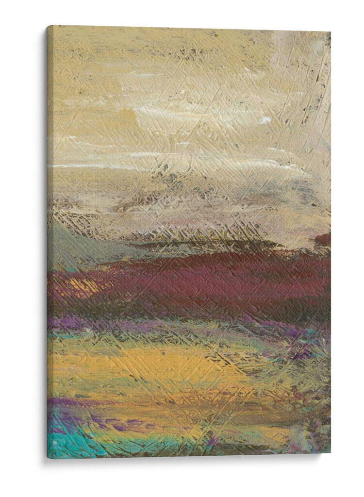 Sumérgete en la serena belleza del paisaje desértico con 'Desertscape II', una obra de arte contemporáneo de Lisa Choate. Este cuadro decorativo captura la esencia de un vasto y etéreo desierto a través de una paleta de colores rica y terrosa, que va desde cálidos tonos dorados y ocres hasta profundos borgoñas y toques vibrantes de turquesa y púrpura. La textura distintiva, lograda mediante pinceladas audaces y un patrón de líneas entrelazadas, añade profundidad y dinamismo a la composición, invitando a la contemplación. Cada capa de color y cada trazo sugieren las vastas extensiones y la atmósfera única de un desierto al amanecer o atardecer. 'Desertscape II' es la pieza ideal para infundir calma y un toque de naturaleza abstracta en cualquier espacio, ya sea una sala de estar moderna, un dormitorio sereno o una oficina que busca inspiración. Este cuadro decorativo contemporáneo no solo embellece tu pared, sino que también transporta tu mente a un lugar de tranquilidad y asombro, convirtiéndose en un punto focal cautivador que refleja un gusto por el arte moderno y la belleza natural estilizada. La obra de Lisa Choate ofrece una perspectiva única y expresiva del paisaje, perfecta para quienes buscan una conexión emocional con su decoración.
