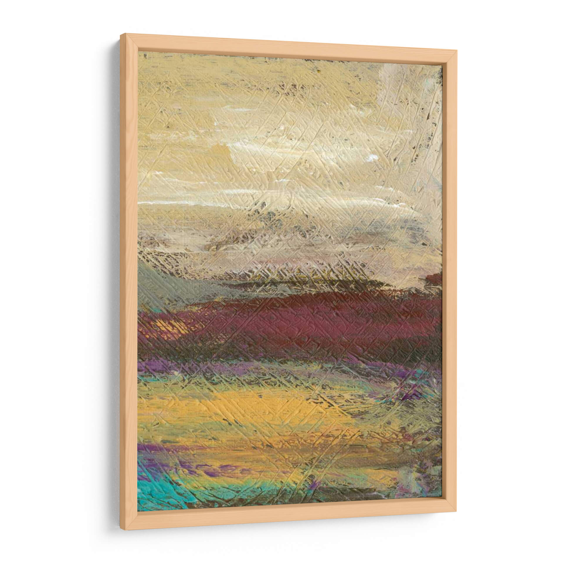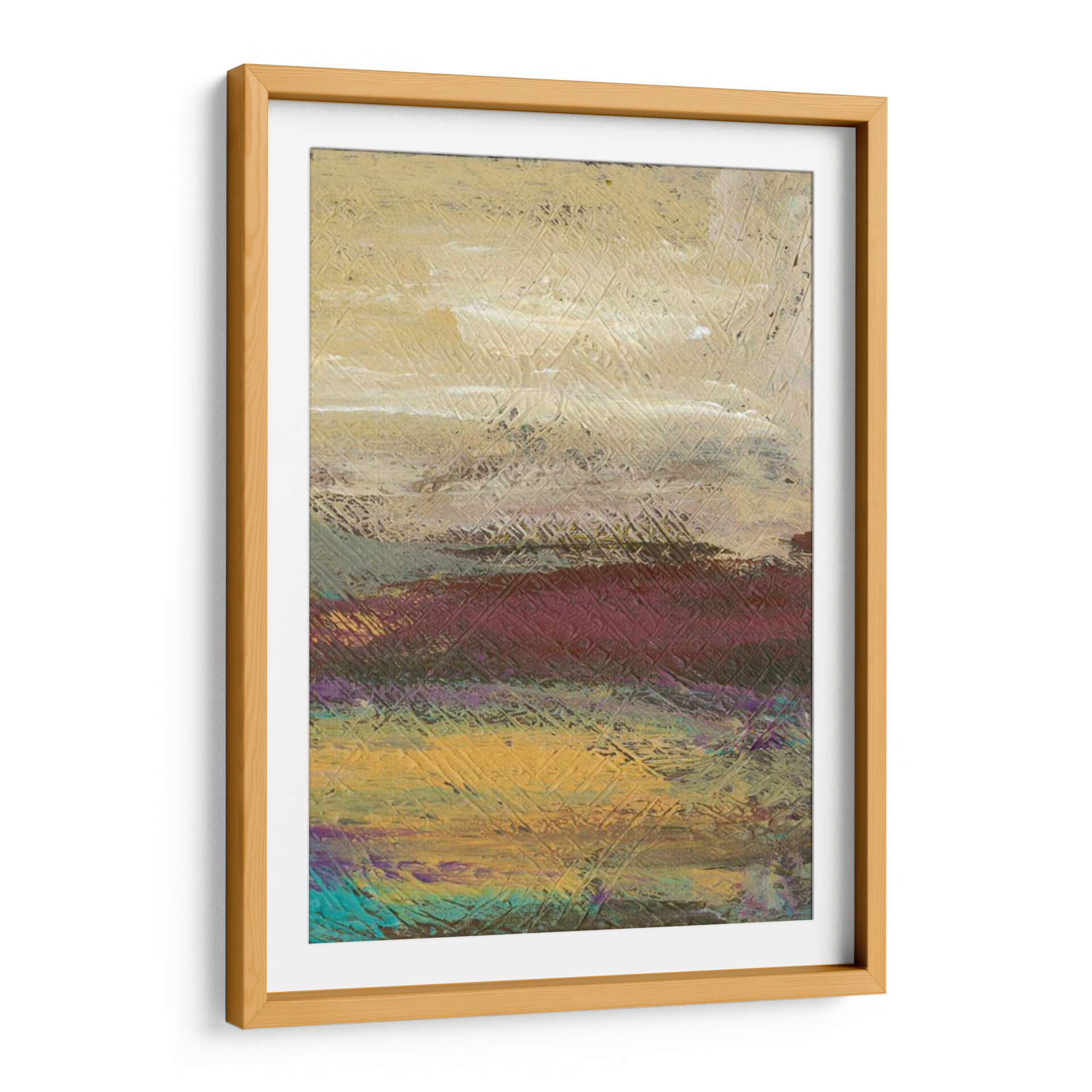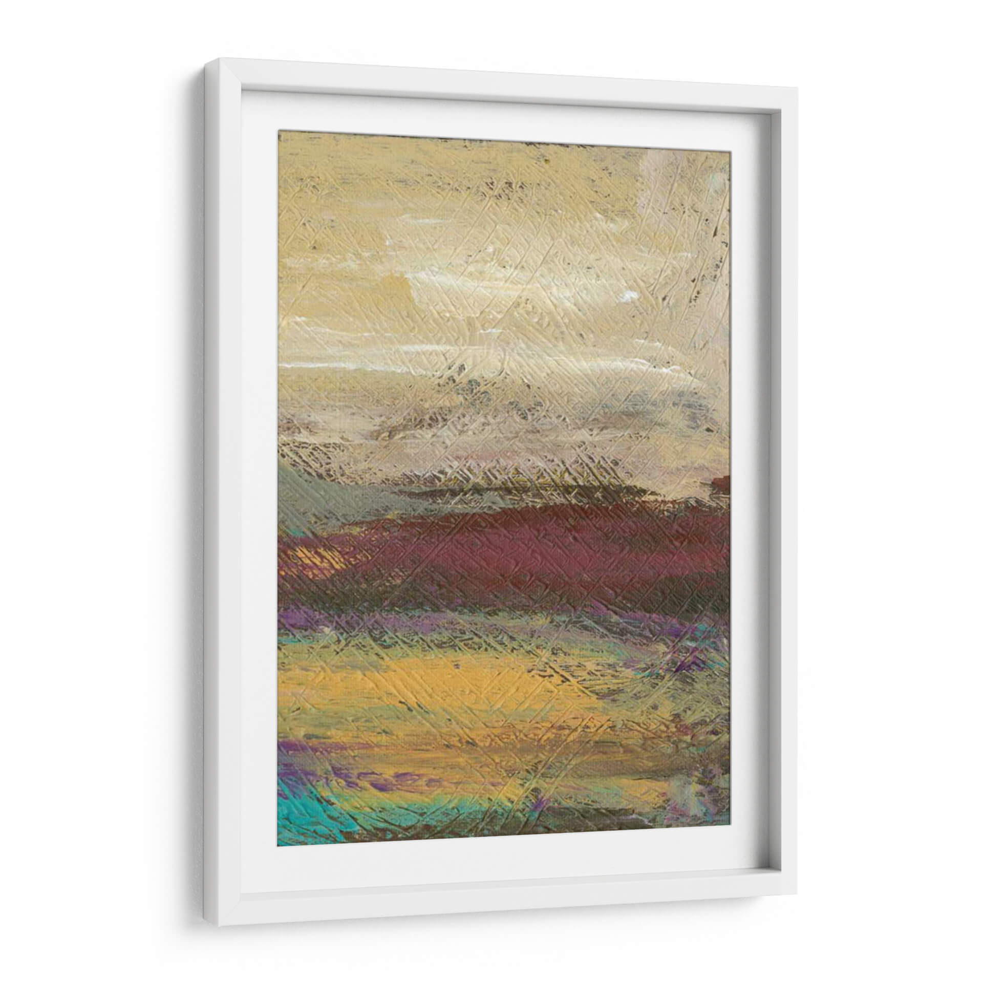 Sumérgete en la serena belleza del paisaje desértico con 'Desertscape II', una obra de arte contemporáneo de Lisa Choate. Este cuadro decorativo captura la esencia de un vasto y etéreo desierto a través de una paleta de colores rica y terrosa, que va desde cálidos tonos dorados y ocres hasta profundos borgoñas y toques vibrantes de turquesa y púrpura. La textura distintiva, lograda mediante pinceladas audaces y un patrón de líneas entrelazadas, añade profundidad y dinamismo a la composición, invitando a la contemplación. Cada capa de color y cada trazo sugieren las vastas extensiones y la atmósfera única de un desierto al amanecer o atardecer. 'Desertscape II' es la pieza ideal para infundir calma y un toque de naturaleza abstracta en cualquier espacio, ya sea una sala de estar moderna, un dormitorio sereno o una oficina que busca inspiración. Este cuadro decorativo contemporáneo no solo embellece tu pared, sino que también transporta tu mente a un lugar de tranquilidad y asombro, convirtiéndose en un punto focal cautivador que refleja un gusto por el arte moderno y la belleza natural estilizada. La obra de Lisa Choate ofrece una perspectiva única y expresiva del paisaje, perfecta para quienes buscan una conexión emocional con su decoración.