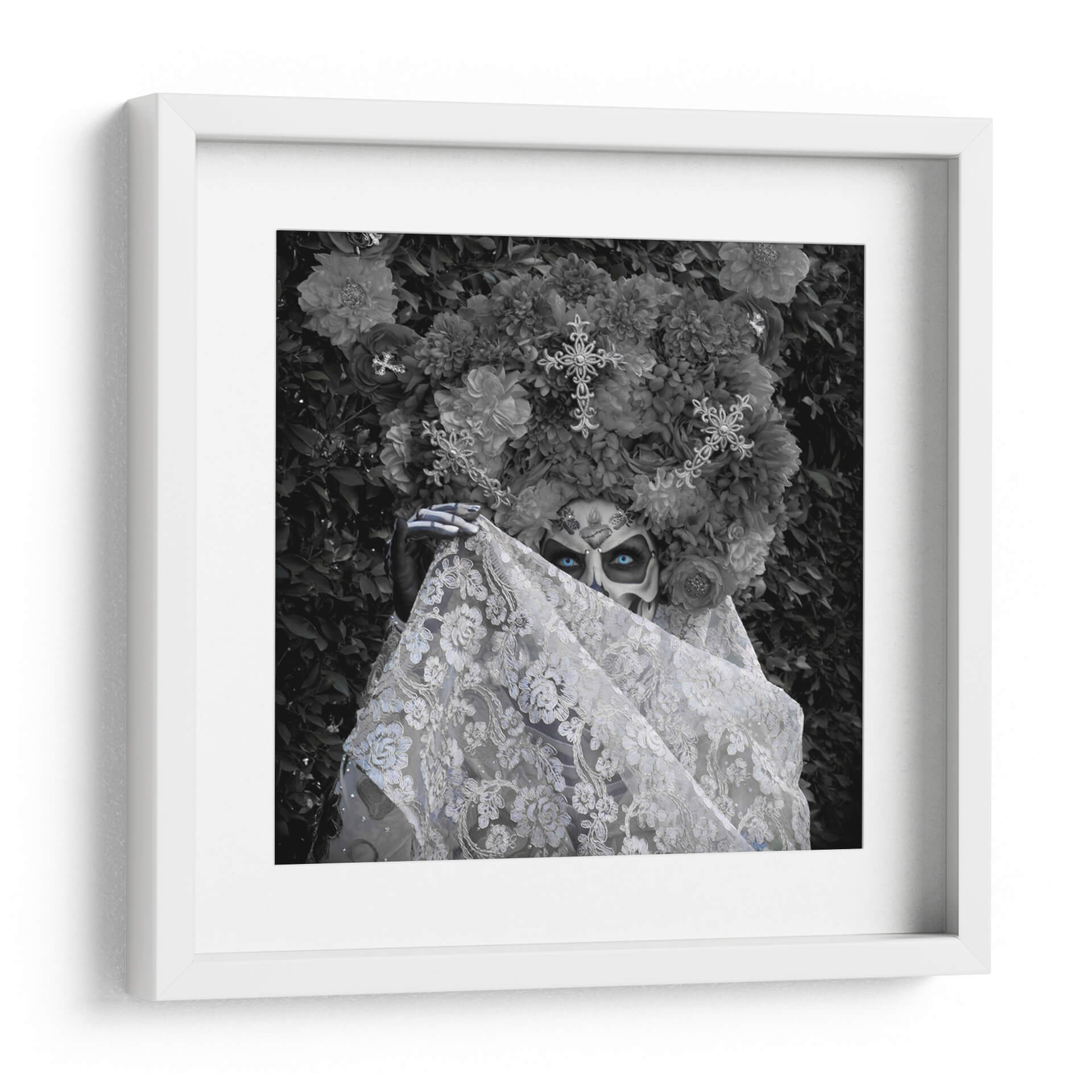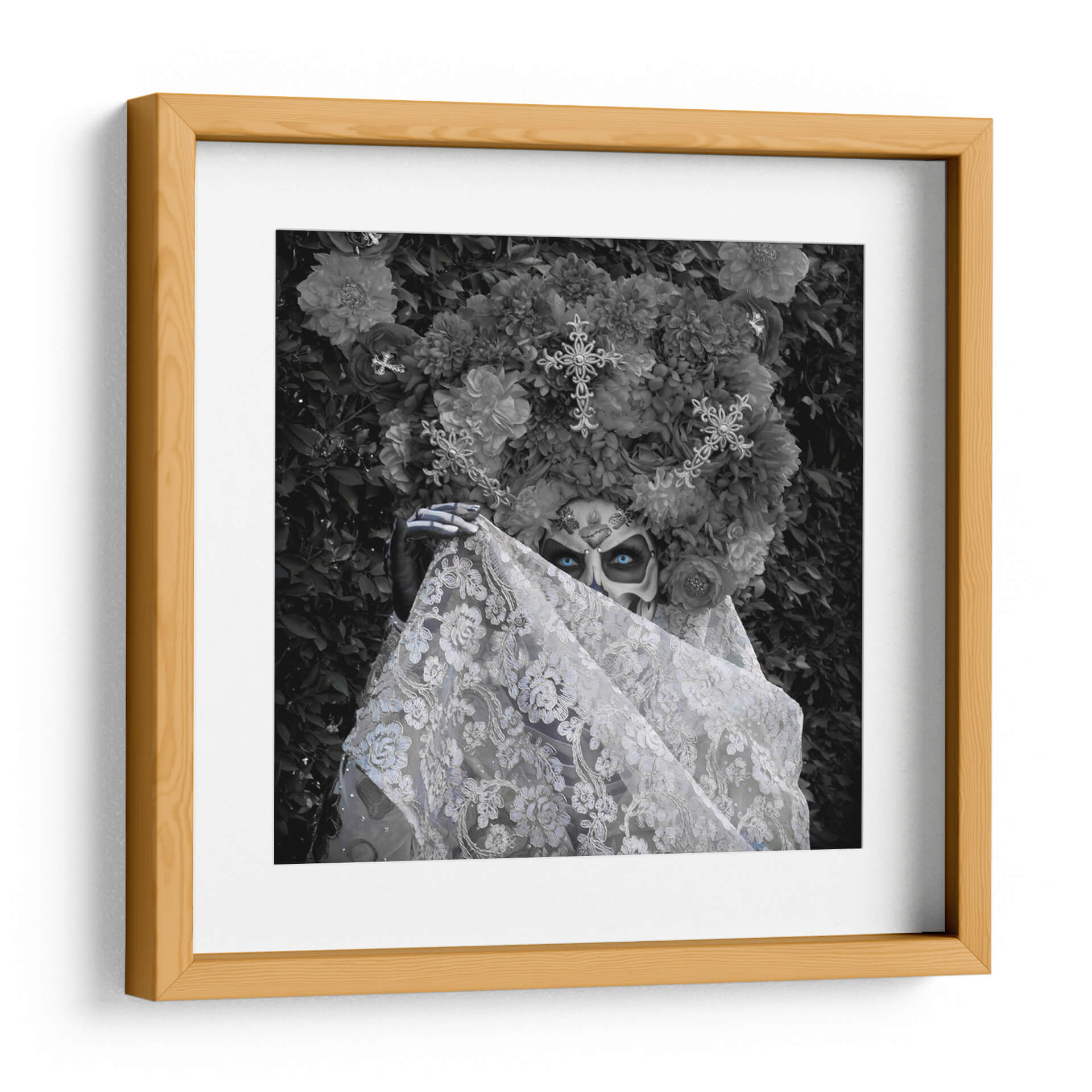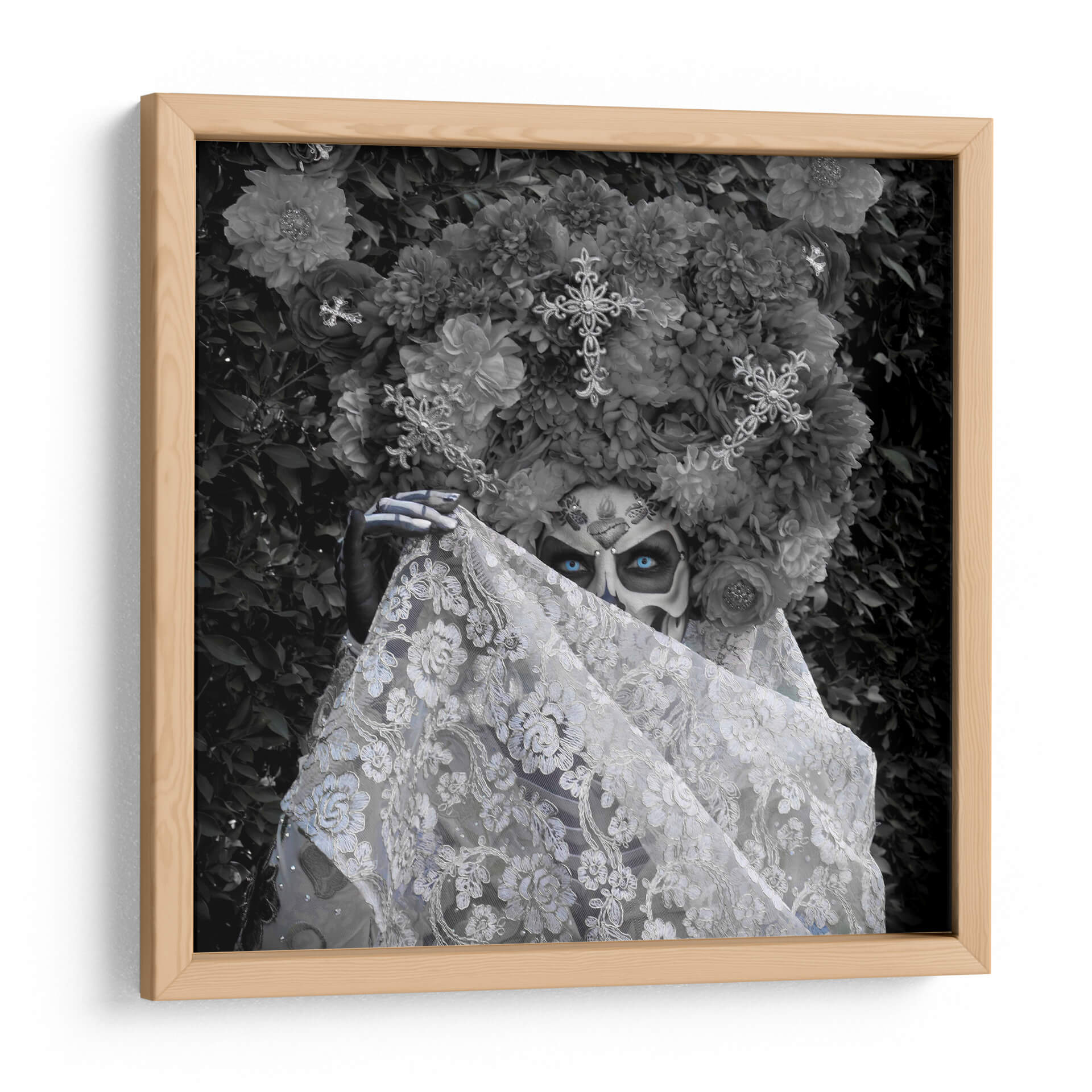 Sumérgete en la enigmática belleza de "Día de los Muertos" de C. Ray Roth, un cuadro decorativo que trasciende lo ordinario. Esta obra maestra captura la esencia de la festividad mexicana con una profundidad visual cautivadora. En primer plano, una figura velada por un delicado encaje floral, revela unos penetrantes ojos azules que invitan a la contemplación. El maquillaje de catrina, intrincado y artístico, acentúa la dualidad entre la vida y la muerte, un tema recurrente y poderoso en el arte. La explosión de flores que corona la cabeza de la figura, en contraste con el fondo sombrío y texturizado, crea un impacto visual dramático y lleno de simbolismo. Los tonos predominantes, aunque presentados en un estilo gráfico y de alto contraste, sugieren una paleta que podría incluir blancos, negros y toques vibrantes, haciendo de esta pieza un punto focal ideal para cualquier espacio que busque carácter y profundidad. Ideal para salones modernos, estudios o incluso como una pieza de conversación audaz en una oficina, este cuadro decorativo evoca misterio, celebración y una profunda conexión con la tradición. Añade un toque de arte contemporáneo con un trasfondo cultural rico a tu hogar.
