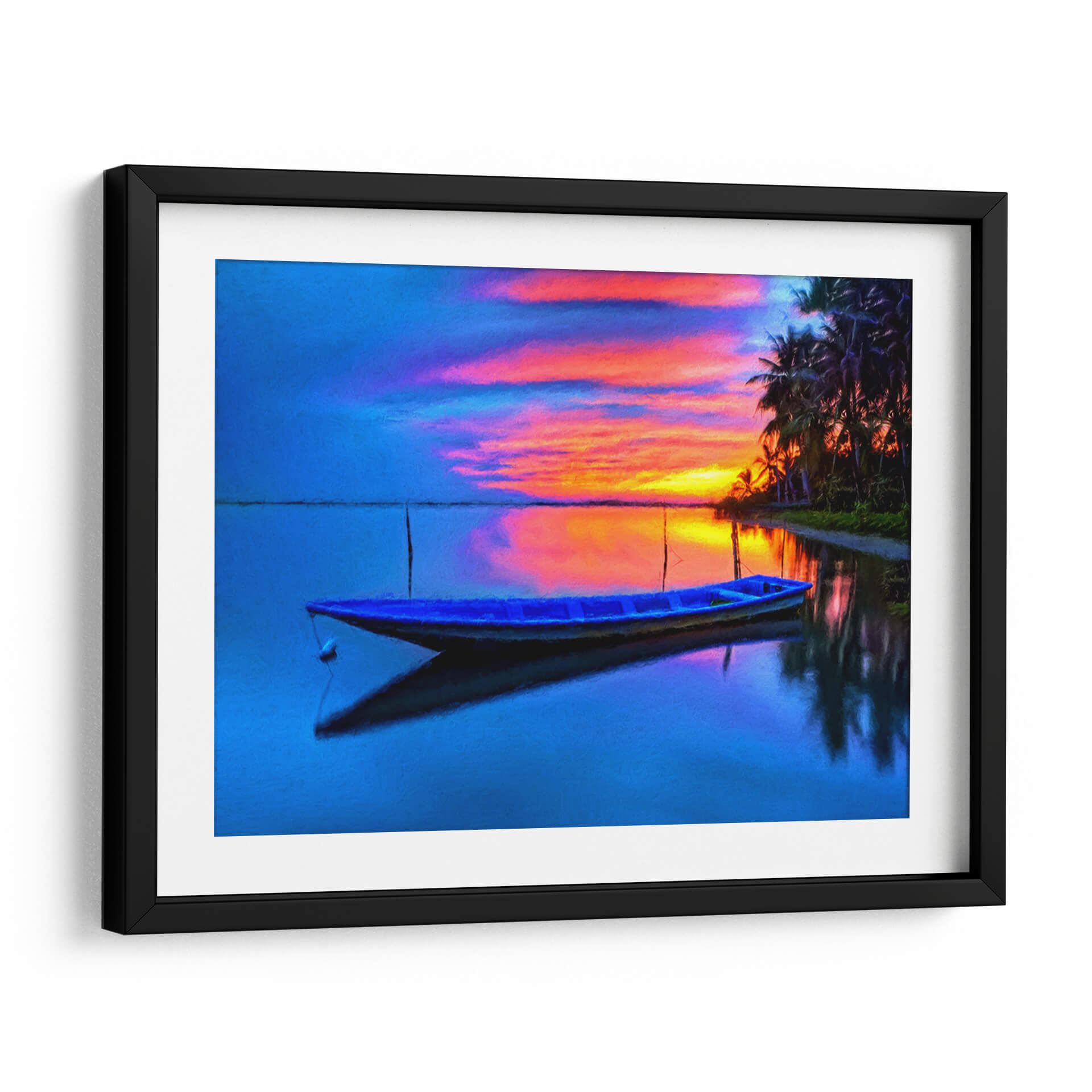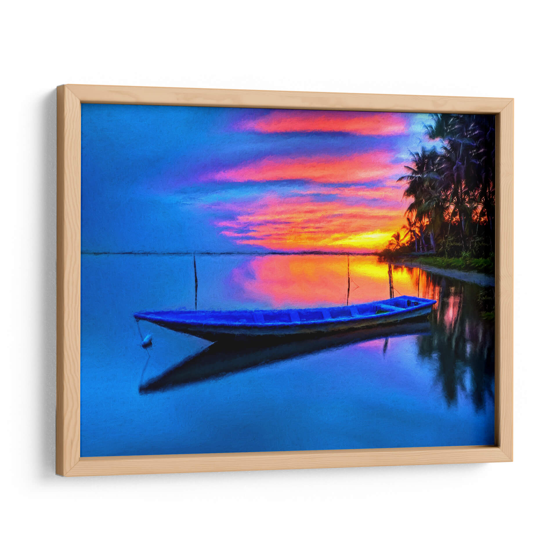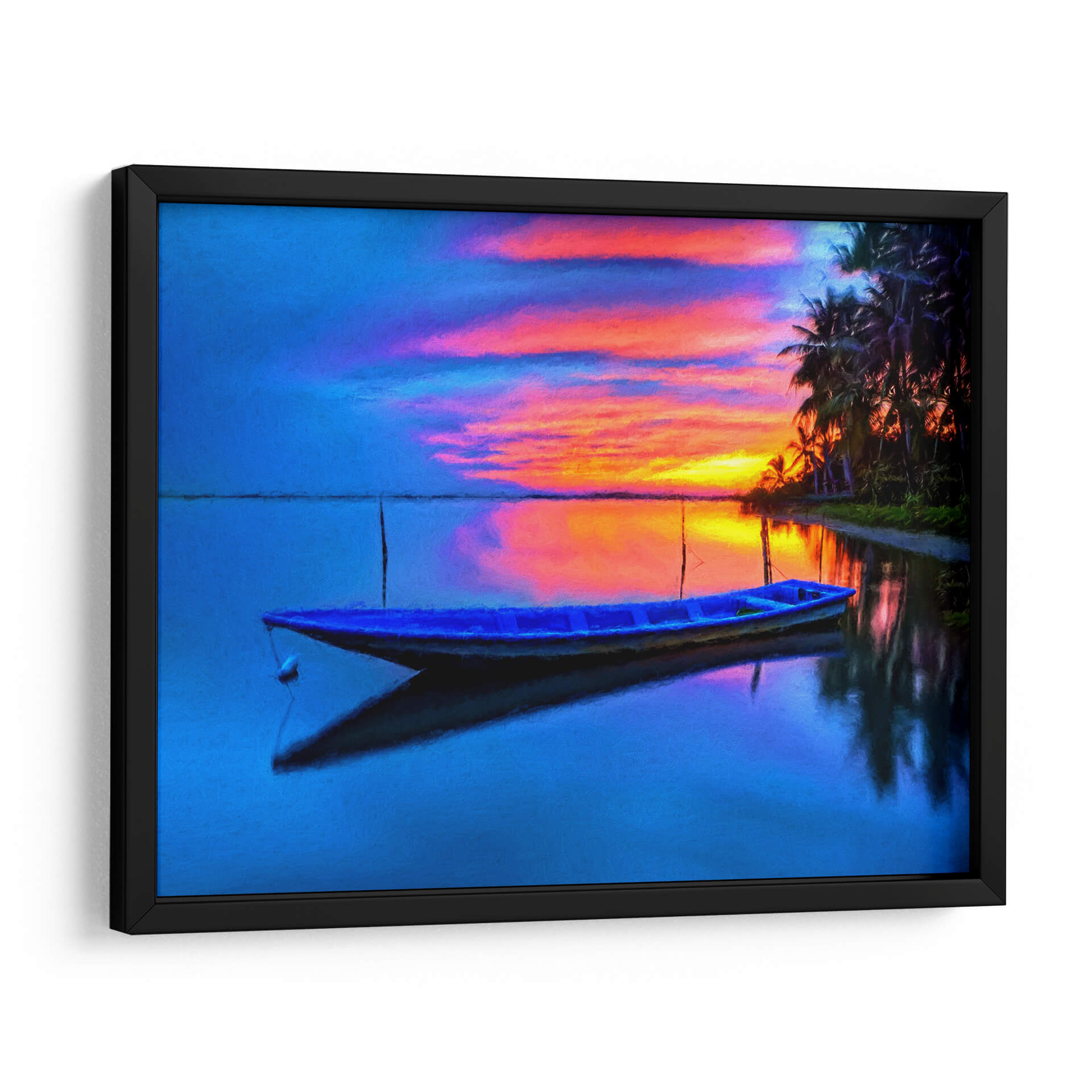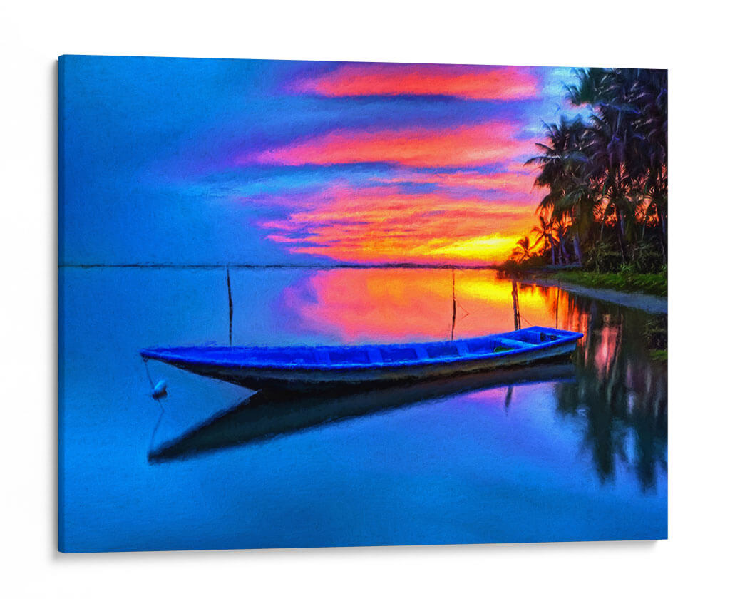 Sumérgete en la serenidad y el vibrante espectáculo de "El Mar 6", una obra de arte contemporáneo que captura la esencia de un atardecer tropical. Este cuadro decorativo presenta un bote azul solitario flotando en aguas tranquilas, reflejando el cielo encendido con tonos de naranja, rosa y púrpura. Las siluetas de palmeras bordean la costa, añadiendo un toque exótico y de misterio a la escena. La pincelada audaz y expresiva del artista Marcos Rodríguez evoca una sensación de calma profunda y contemplación, transportando al espectador a un paraíso sereno. La paleta de colores contrastantes, desde los azules intensos del agua hasta los cálidos y ardientes tonos del cielo, crea un ambiente hipnótico y relajante. Ideal para añadir un toque de color y tranquilidad a cualquier espacio, este cuadro es perfecto para salones, dormitorios o incluso oficinas que buscan un refugio visual. Transforma tu hogar en un santuario de paz con esta pieza única que evoca la belleza efímera de la naturaleza y la soledad introspectiva.