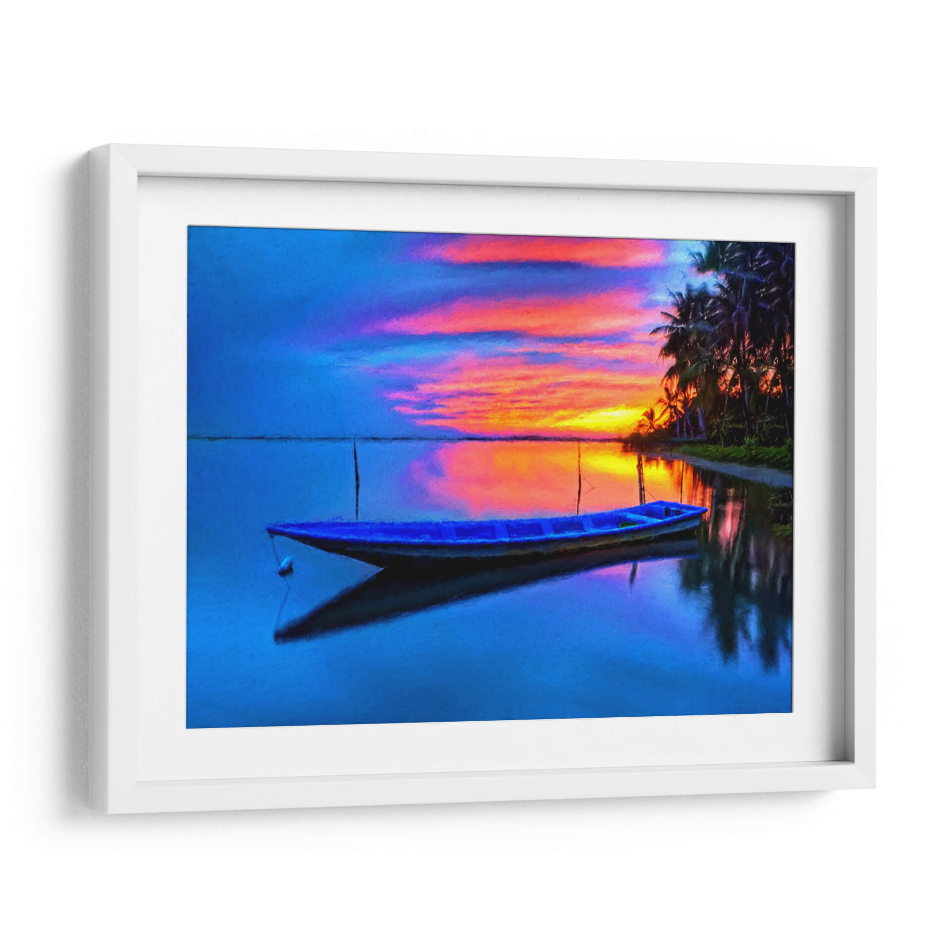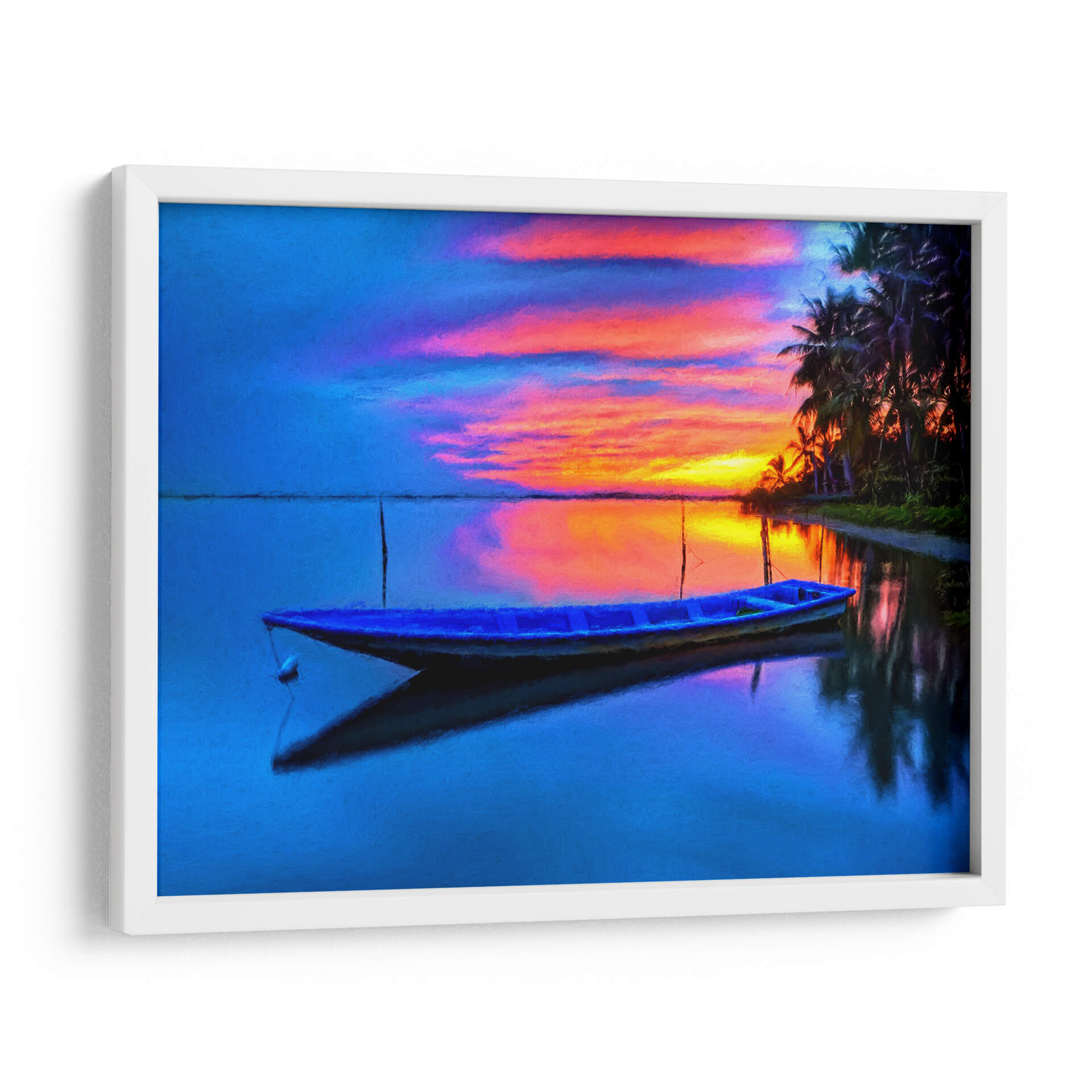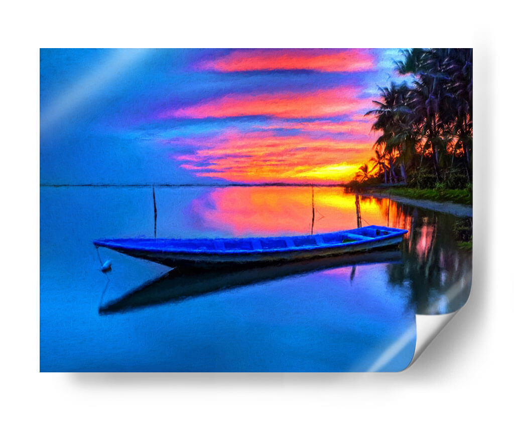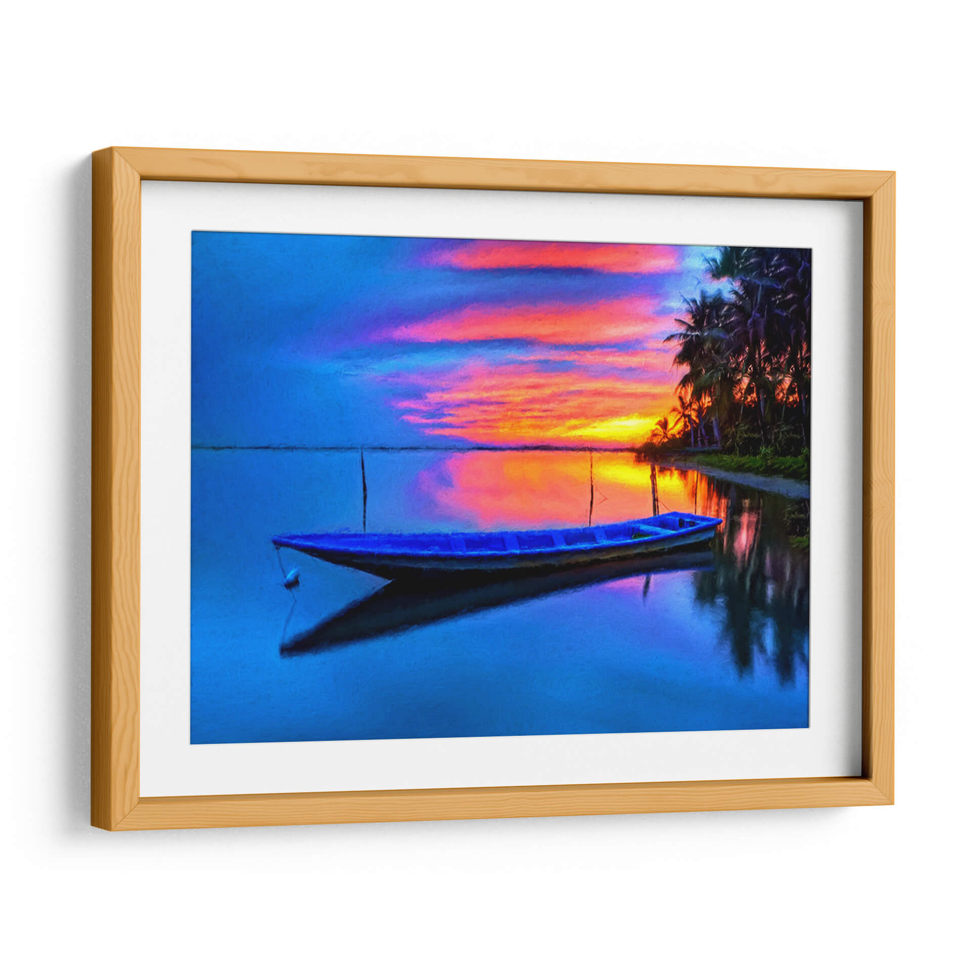 Sumérgete en la serenidad y el vibrante espectáculo de "El Mar 6", una obra de arte contemporáneo que captura la esencia de un atardecer tropical. Este cuadro decorativo presenta un bote azul solitario flotando en aguas tranquilas, reflejando el cielo encendido con tonos de naranja, rosa y púrpura. Las siluetas de palmeras bordean la costa, añadiendo un toque exótico y de misterio a la escena. La pincelada audaz y expresiva del artista Marcos Rodríguez evoca una sensación de calma profunda y contemplación, transportando al espectador a un paraíso sereno. La paleta de colores contrastantes, desde los azules intensos del agua hasta los cálidos y ardientes tonos del cielo, crea un ambiente hipnótico y relajante. Ideal para añadir un toque de color y tranquilidad a cualquier espacio, este cuadro es perfecto para salones, dormitorios o incluso oficinas que buscan un refugio visual. Transforma tu hogar en un santuario de paz con esta pieza única que evoca la belleza efímera de la naturaleza y la soledad introspectiva.