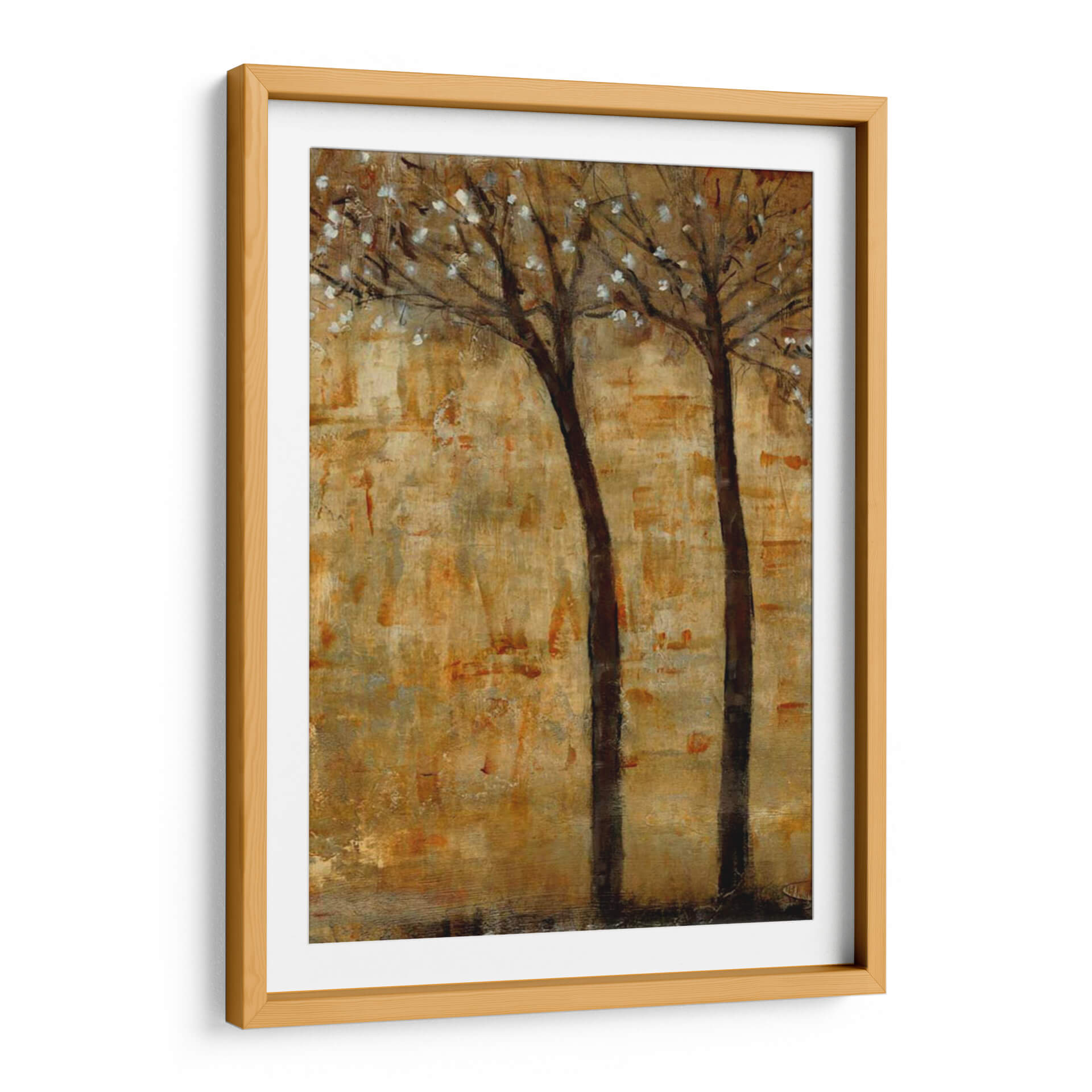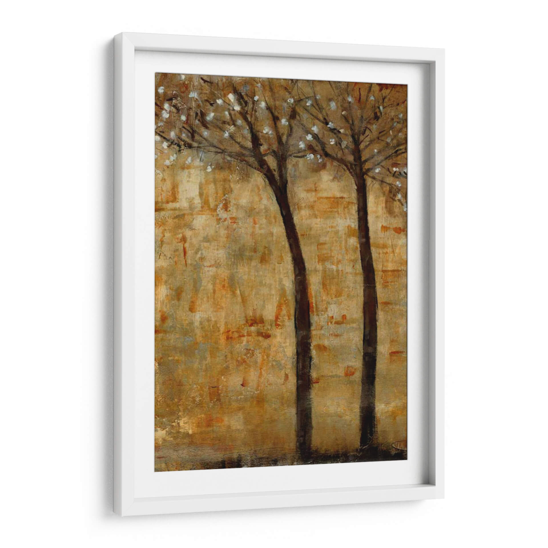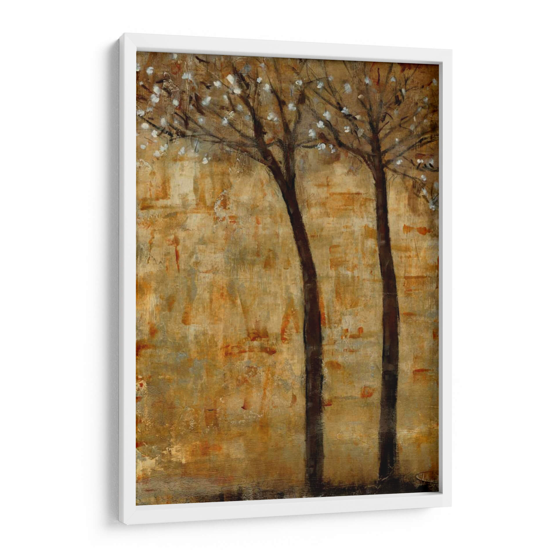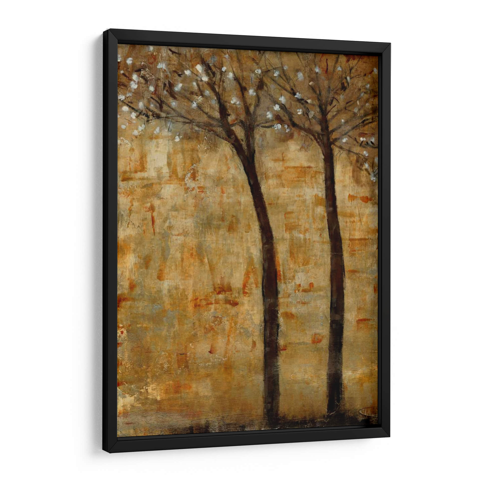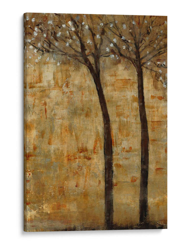 Sumérgete en la serenidad otoñal con "En La Floración II", una cautivadora obra de arte de Tim OToole. Este cuadro decorativo captura la delicada belleza de dos árboles esbeltos, sus ramas adornadas con efímeras flores blancas que contrastan suavemente contra un fondo texturizado en tonos tierra y dorados. La técnica pictórica evoca una sensación de profundidad y movimiento, como si el viento susurrara a través de las hojas. Los ricos ocres, dorados y marrones crean una atmósfera cálida y acogedora, perfecta para cualquier rincón del hogar que busque un toque de naturaleza y tranquilidad. Su estilo abstracto-impresionista permite una interpretación personal, invitando a la contemplación y al descanso visual. Ideal para salas de estar, dormitorios o estudios, este cuadro abstracto aportará un aire de sofisticación rústica y una conexión con la naturaleza. "En La Floración II" es más que una simple decoración; es una invitación a pausar y apreciar la efímera belleza del mundo natural, transformando tu espacio en un refugio de paz y estilo contemporáneo. Descubre cómo esta pieza puede ser el punto focal que eleve tu decoración.