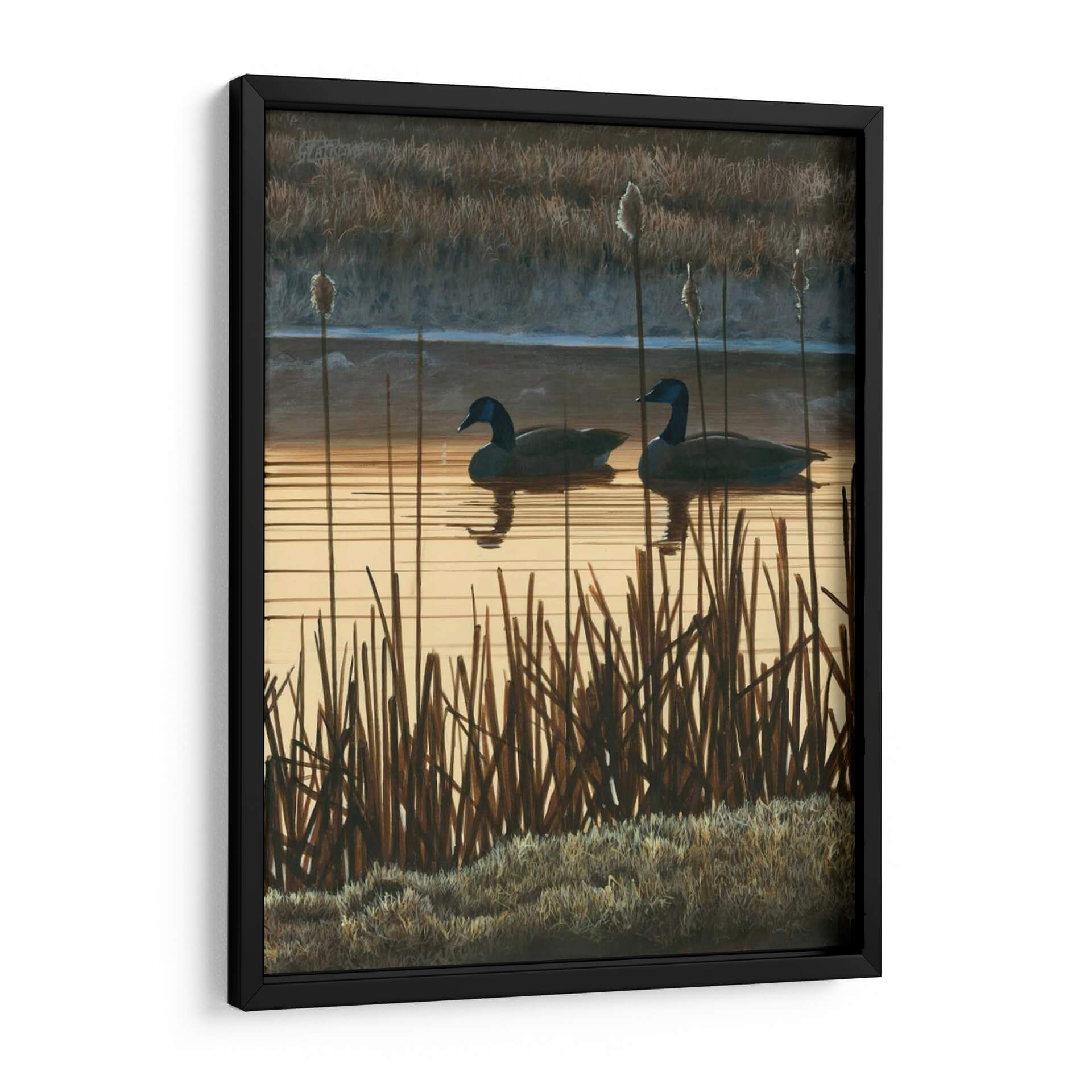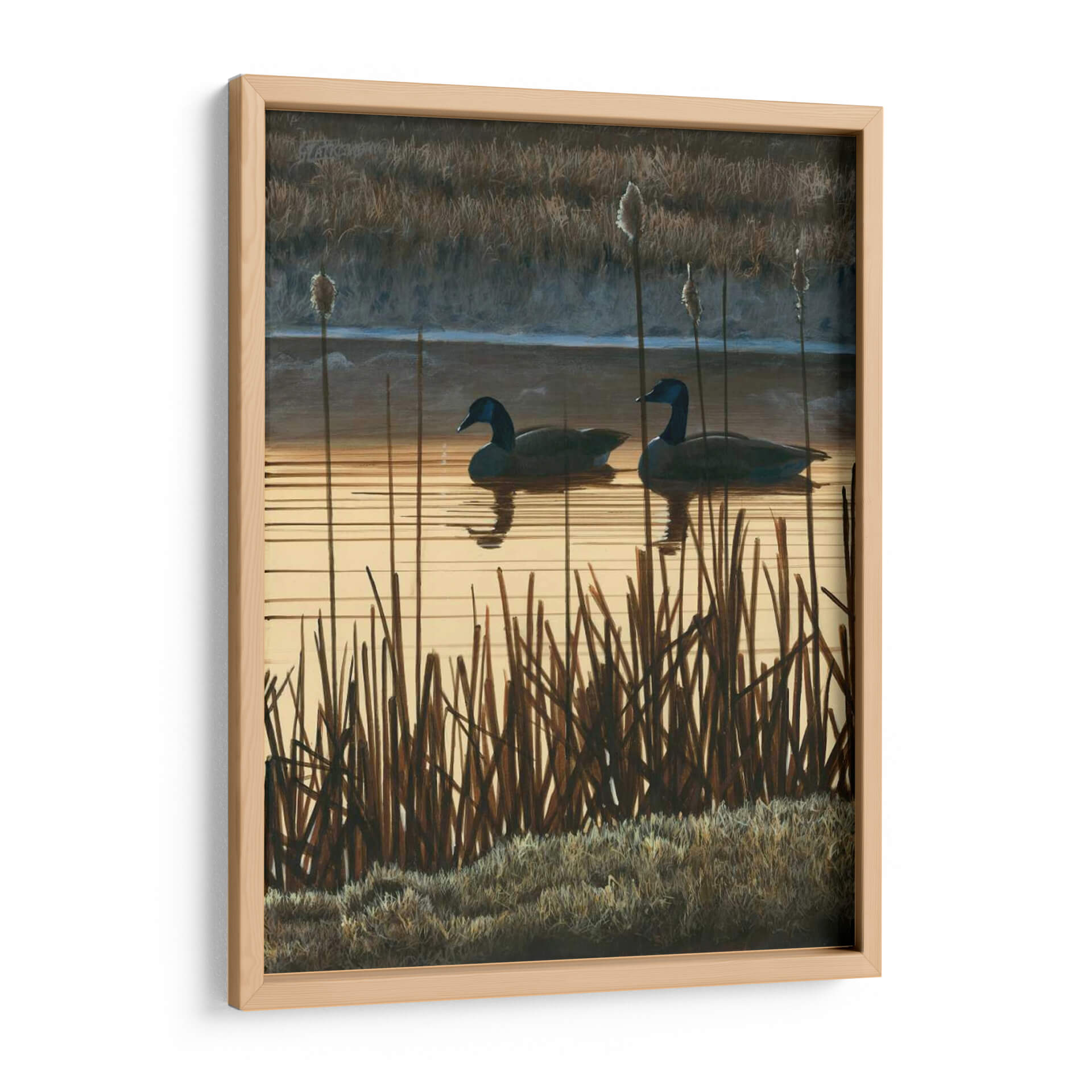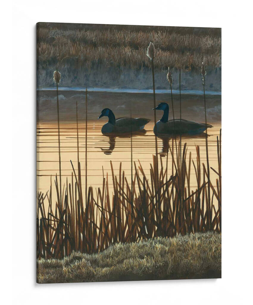 Sumérgete en la serena belleza de "En Primer Lugar La Luz II", una cautivadora obra de arte del artista Julie Holland. Esta pieza evoca la tranquilidad de un amanecer o atardecer sobre un lago, con dos gansos navegando pacíficamente entre la densa vegetación de juncias. La paleta de colores, dominada por cálidos tonos dorados y ocres, junto con los fríos azules y grises del fondo, crea una atmósfera de paz y contemplación. El realismo sutil y la detallada representación de la naturaleza invitan a la reflexión y a la conexión con el mundo natural. Ideal para espacios que buscan transmitir calma y sofisticación, como salas de estar, dormitorios o estudios, este cuadro decorativo se convierte en un punto focal que aporta una dosis de naturaleza y serenidad a tu hogar. La composición, con las líneas verticales de las plantas y la horizontalidad del agua, guía la mirada a través de una escena atemporal. Añade un toque de elegancia natural y una sensación de quietud a tu decoración con esta exquisita pieza.