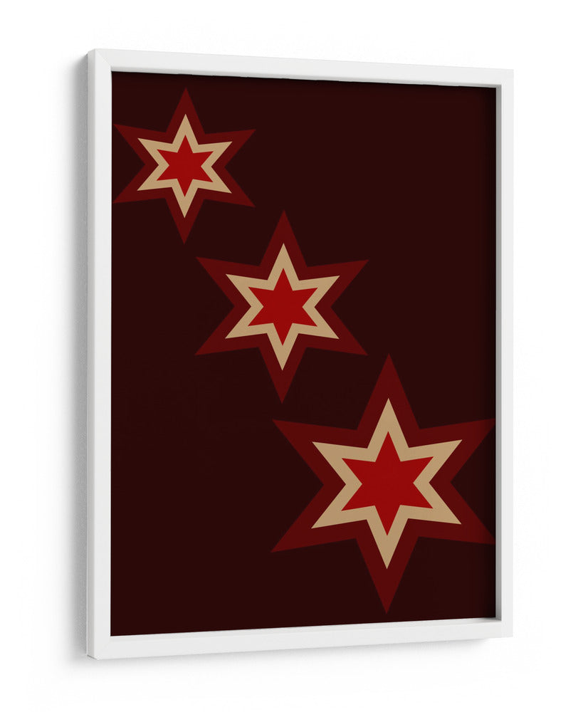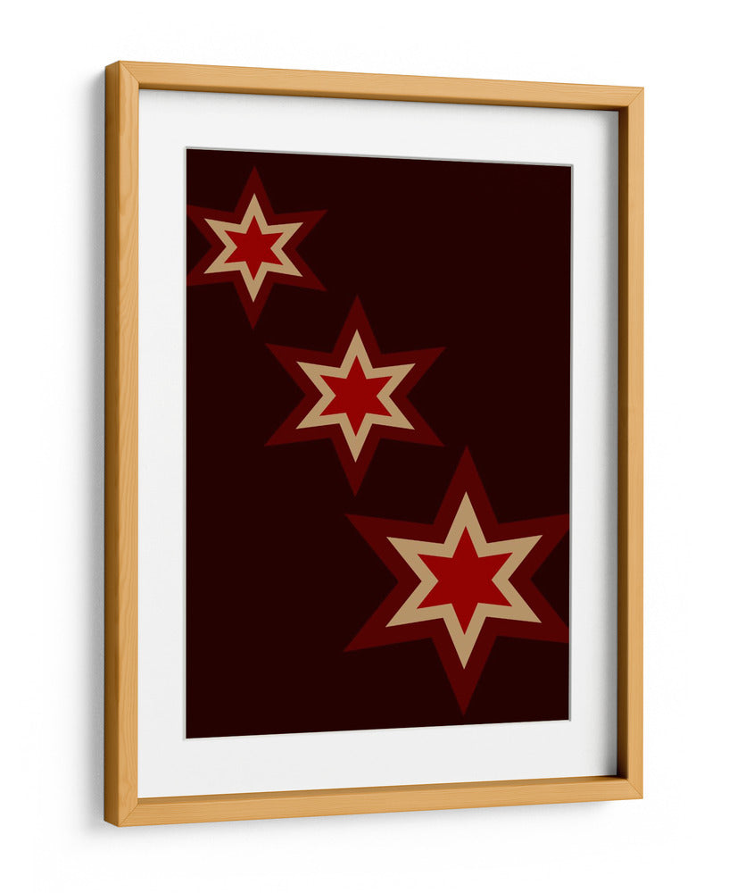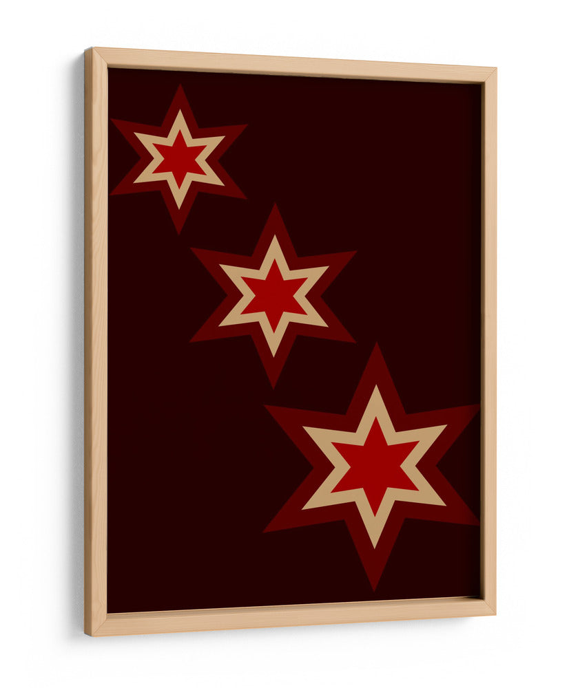 Este cautivador cuadro decorativo, titulado "Estrellas de Navidad" por Andreas Magnusson, es una obra maestra contemporánea que irradia elegancia y un toque festivo sutil. La composición presenta tres estrellas estilizadas, dispuestas en una diagonal ascendente que aporta dinamismo y equilibrio visual a la pieza. Cada estrella está definida por capas de colores vibrantes, predominando el rojo intenso y un cálido tono beige, contrastando elegantemente sobre un fondo profundo de color burdeos. La paleta de colores evoca una sensación de sofisticación y calidez, perfecta para añadir un toque de distinción a cualquier espacio. El estilo gráfico y geométrico de la obra, junto con su simplicidad cautivadora, la convierte en una opción versátil. Este cuadro decorativo es ideal para salas de estar modernas, comedores o incluso oficinas que buscan una pieza de arte que sea a la vez llamativa y serena. Su diseño atemporal y la atmósfera que crea invitan a la contemplación y añaden un carácter único a la decoración del hogar, siendo una excelente elección para quienes aprecian el arte abstracto con un guiño a la celebración.