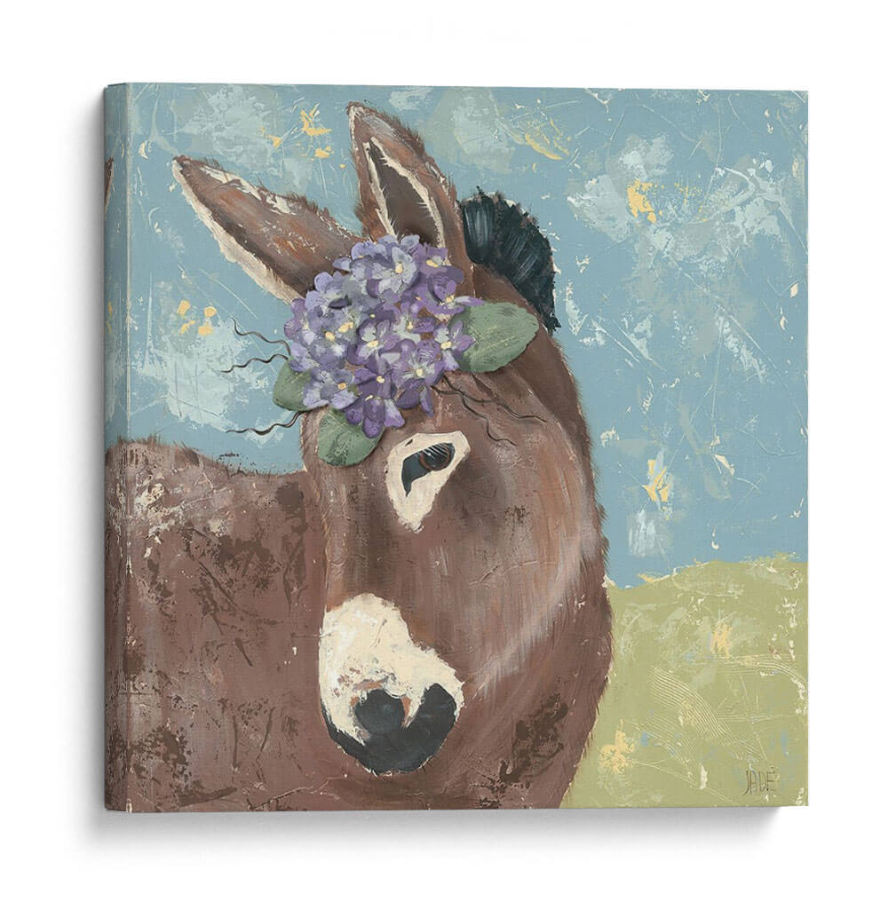 Transforma tu espacio con 'Farm Fun III', una encantadora obra de arte que captura la dulzura de un burro adornado con una corona de flores moradas. La paleta de colores, que combina tonos tierra cálidos del animal con el azul sereno del cielo y el verde suave del prado, crea una atmósfera de tranquilidad y alegría campestre. El estilo pictórico, con texturas visibles y pinceladas expresivas, añade profundidad y carácter a la pieza, evocando una sensación de autenticidad y calidez. Este cuadro decorativo es perfecto para infundir personalidad y un toque de humor tierno a cualquier habitación, desde una sala de estar acogedora hasta un dormitorio infantil o una cocina rústica. Su diseño único lo convierte en un punto focal que invita a la conversación y al disfrute visual. Ideal para amantes de los animales y aquellos que buscan arte con alma y encanto.
