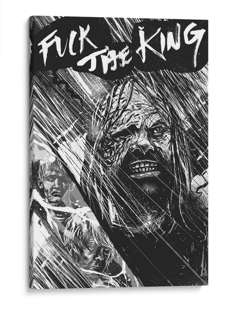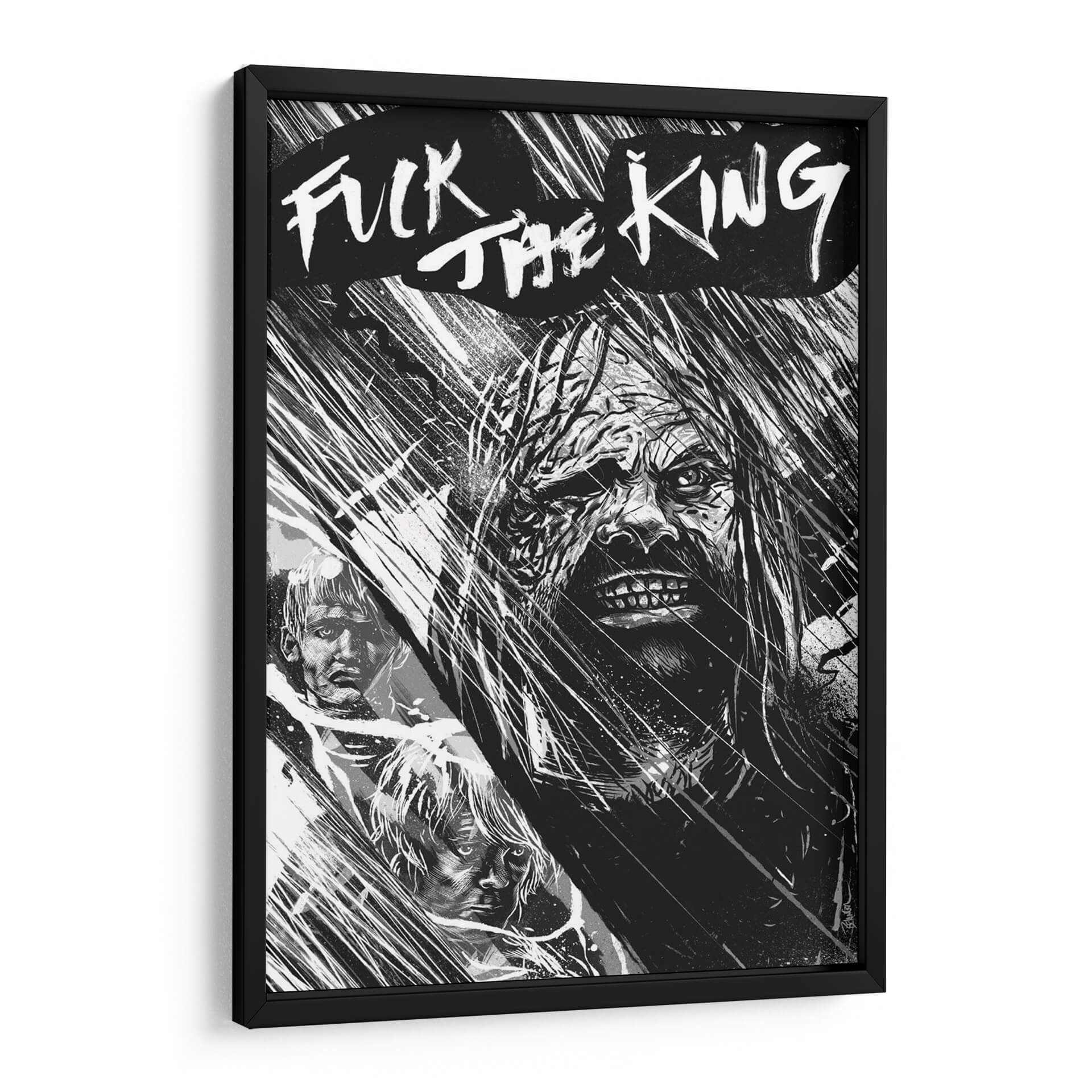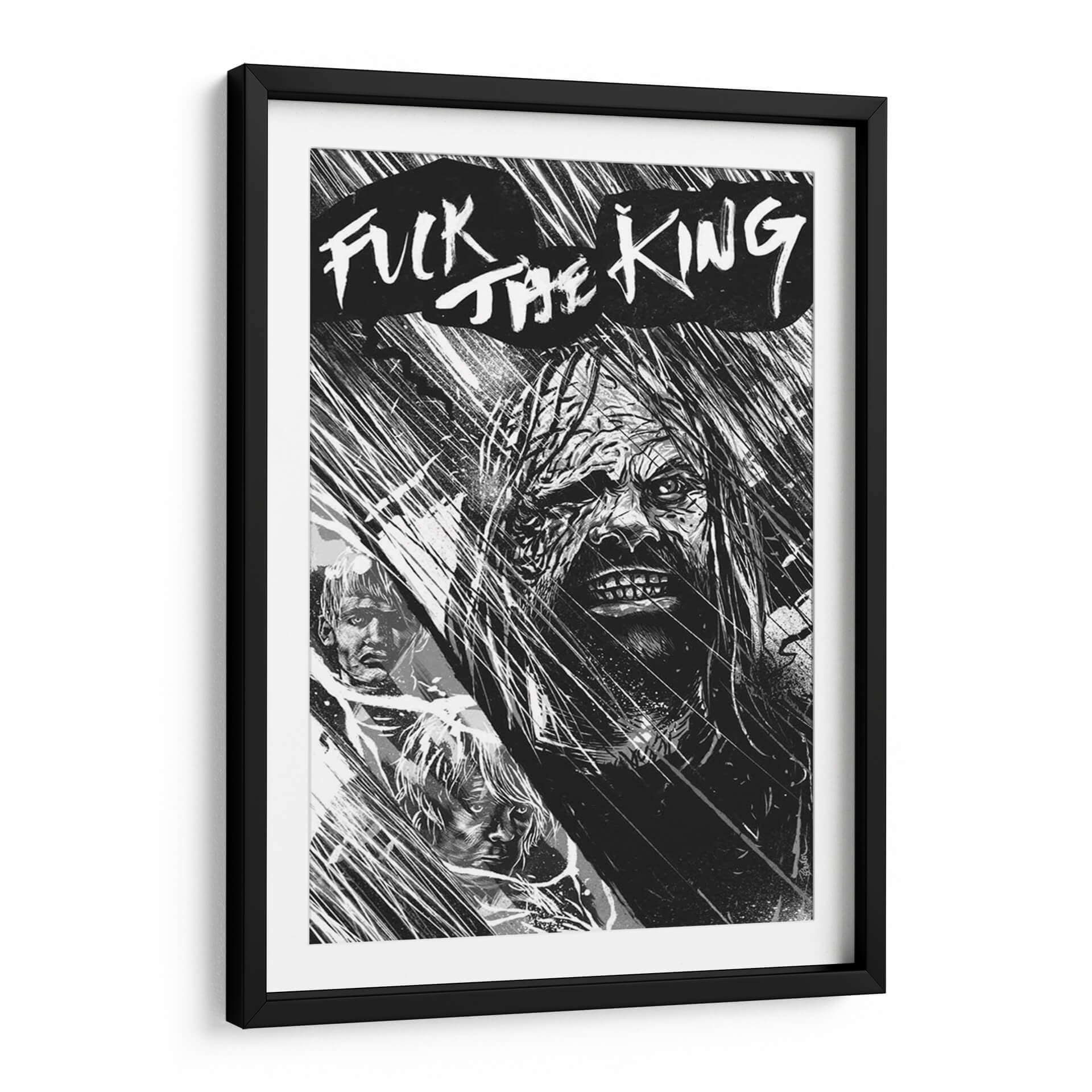Sumérgete en la intensidad cruda y el impacto visual de este cuadro decorativo, una obra que desafía las convenciones y provoca la reflexión. La pieza presenta un primer plano dramático de un rostro rugoso y expresivo, con una mirada penetrante que parece cargar con el peso de la historia y la rebelión. Alrededor, emergen figuras infantiles, sus rostros jóvenes y serios contrastando con la figura principal, creando una narrativa visual compleja y evocadora. La paleta de colores, estrictamente monocromática en blanco y negro con intensos contrastes de luz y sombra, añade una capa de dramatismo y urgencia, acentuando las texturas y los detalles finos. El estilo, que recuerda al grabado o al dibujo a trazo, confiere a la obra una energía visceral y un toque de rebeldía. "Fuck the King" es más que una imagen; es una declaración de poder, resistencia y una crítica social que resonará en espacios audaces y contemporáneos. Ideal para quienes buscan piezas de arte que generen conversación y aporten un carácter distintivo a su hogar u oficina, esta obra es un punto focal innegable que inyectará personalidad y un espíritu desafiante a cualquier decoración moderna. Su fuerte composición y mensaje la convierten en una elección perfecta para salas de estar, estudios o espacios creativos que buscan expresar audacia.