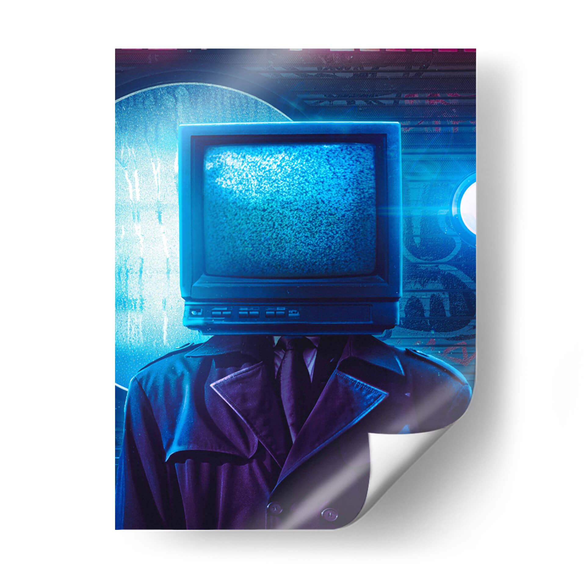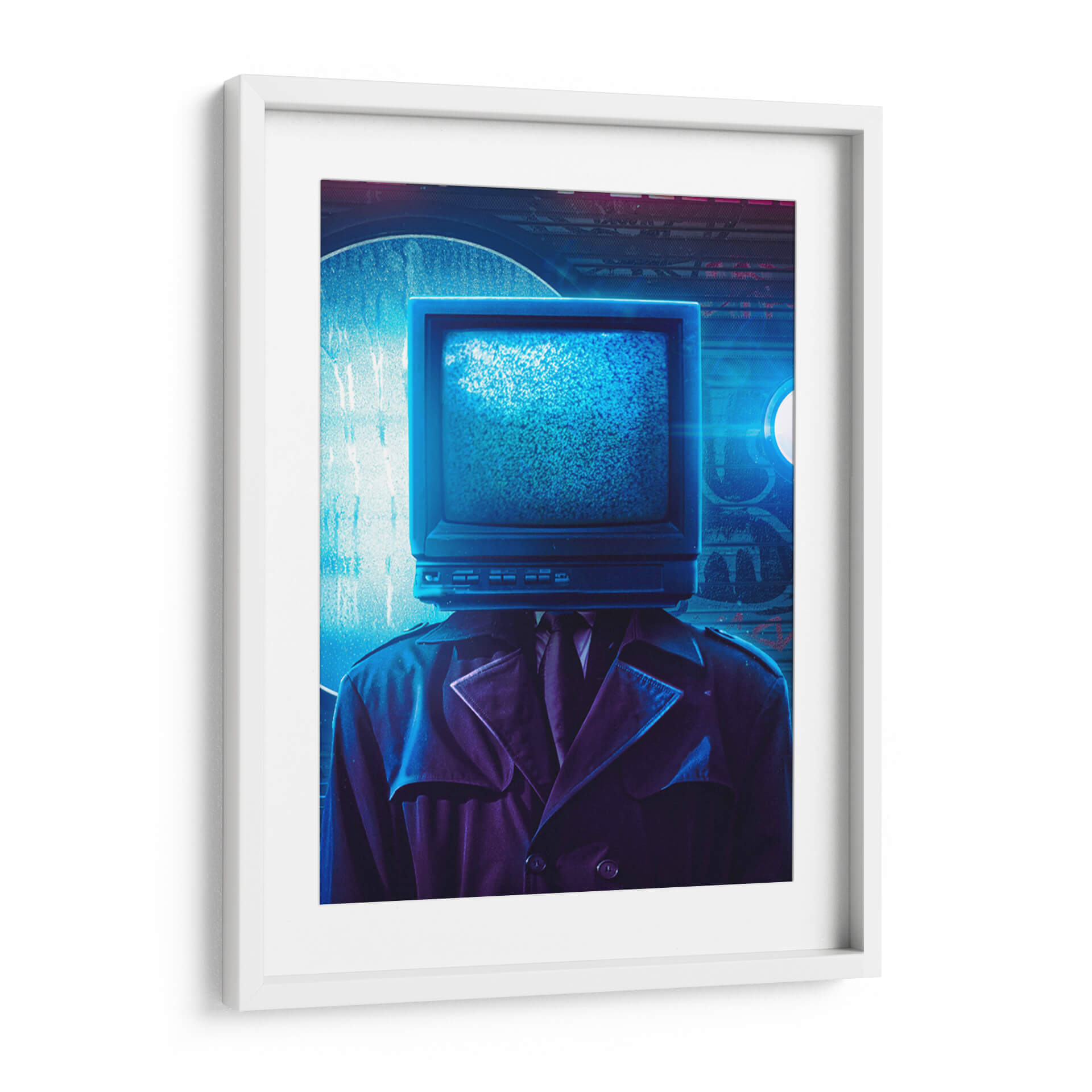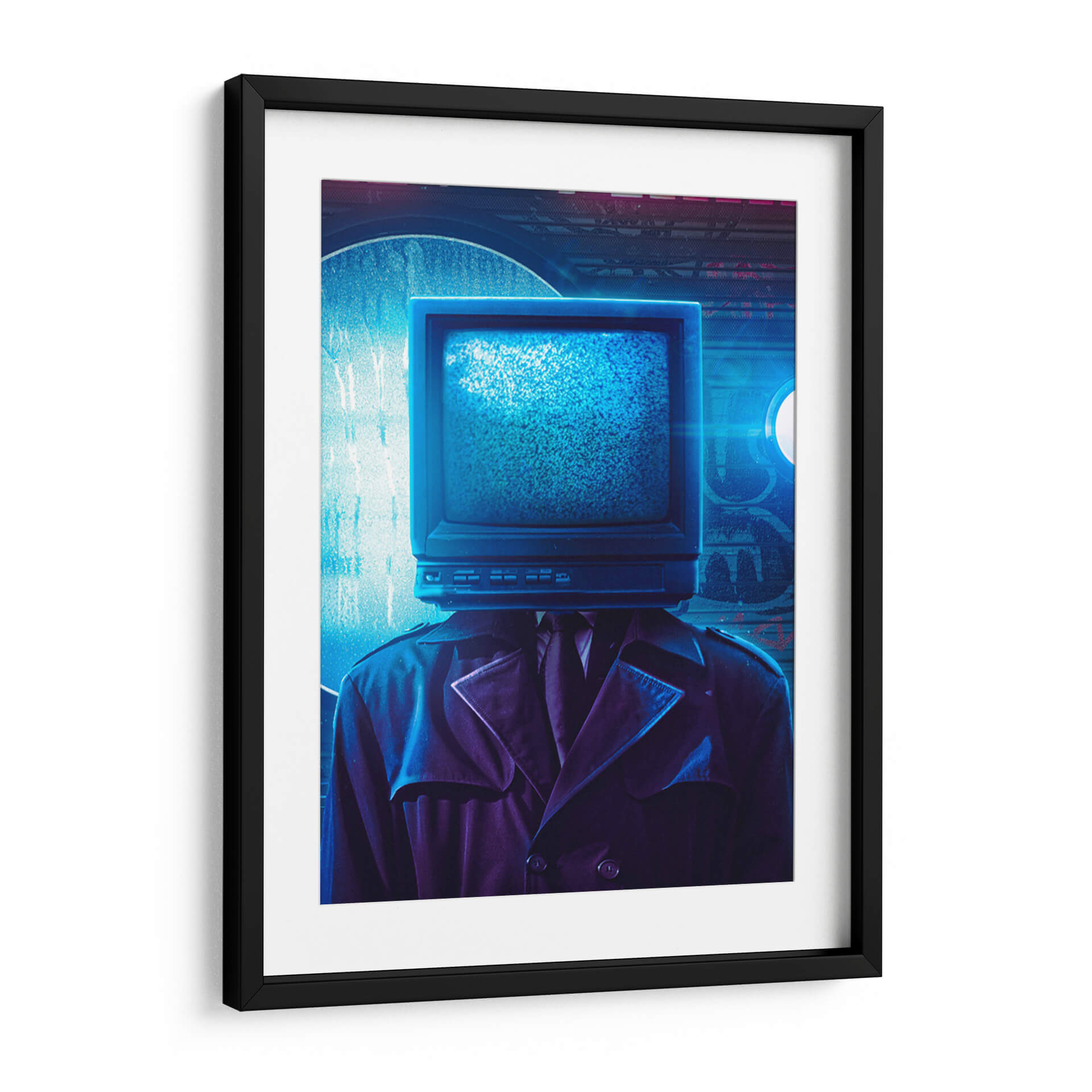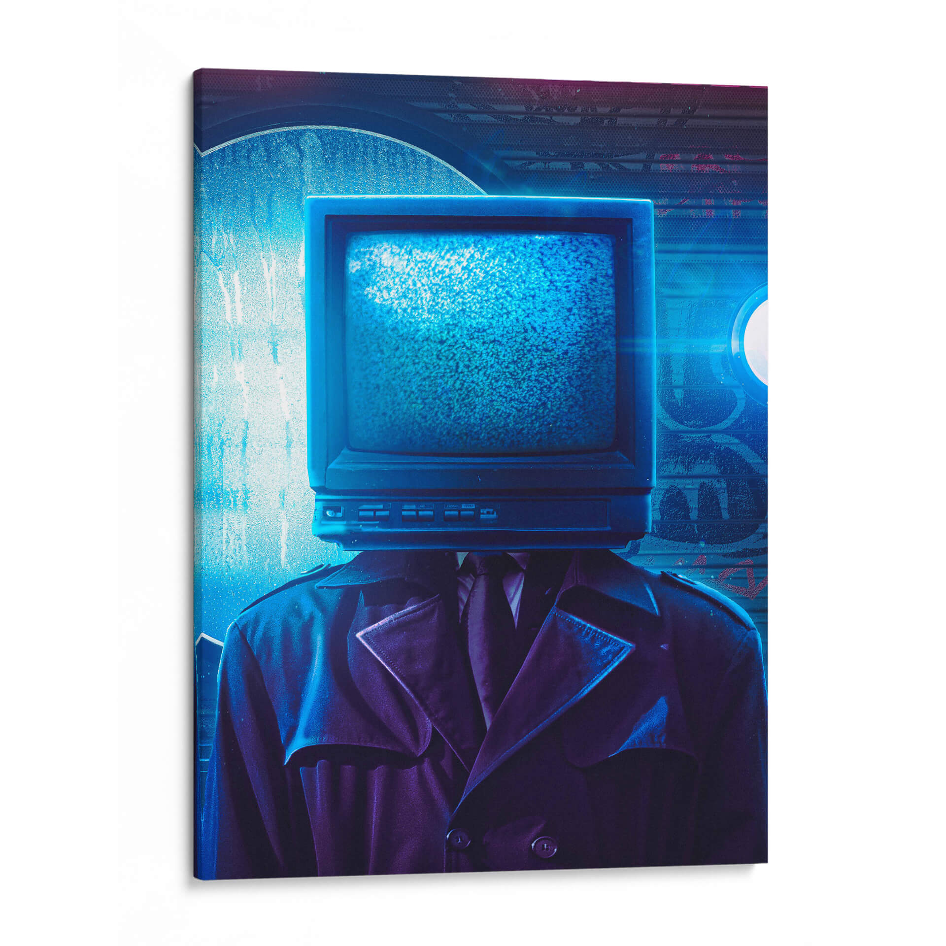 Sumérgete en el enigmático mundo de "Hombre Televisión", una obra de arte contemporáneo que desafía la percepción y la conexión humana en la era digital. Esta pieza evoca una atmósfera de misterio y reflexión, presentando una figura vestida con un elegante traje y gabardina, cuya cabeza es reemplazada por un televisor de tubo estático, emitiendo un brillo azul penetrante. La paleta de colores, dominada por profundos azules y púrpuras, junto con la iluminación dramática, crea un ambiente casi cinematográfico, reminiscent del cine negro o la ciencia ficción distópica. El estilo, una mezcla de surrealismo y realismo, invita a la contemplación sobre la influencia de los medios, la alienación y la búsqueda de identidad en un mundo saturado de información. "Hombre Televisión" es perfecto para espacios que buscan un toque de intriga y modernidad, como una oficina vanguardista, un salón de estar contemporáneo o un estudio personal. Este cuadro decorativo no es solo una imagen, sino una declaración visual que generará conversación y estimulará el pensamiento, transformando cualquier pared en un portal hacia la reflexión.