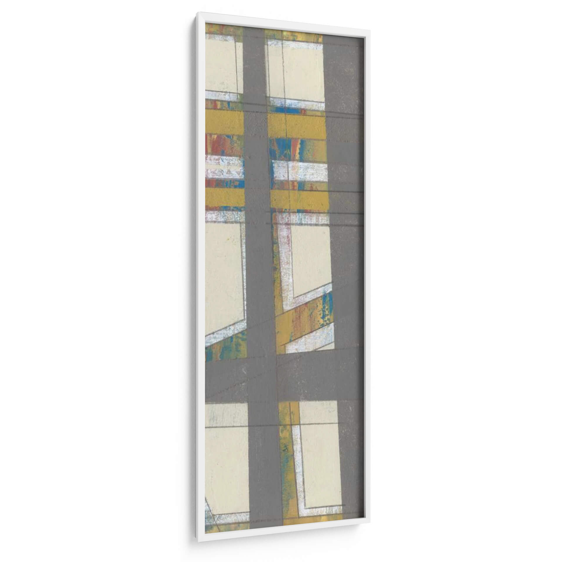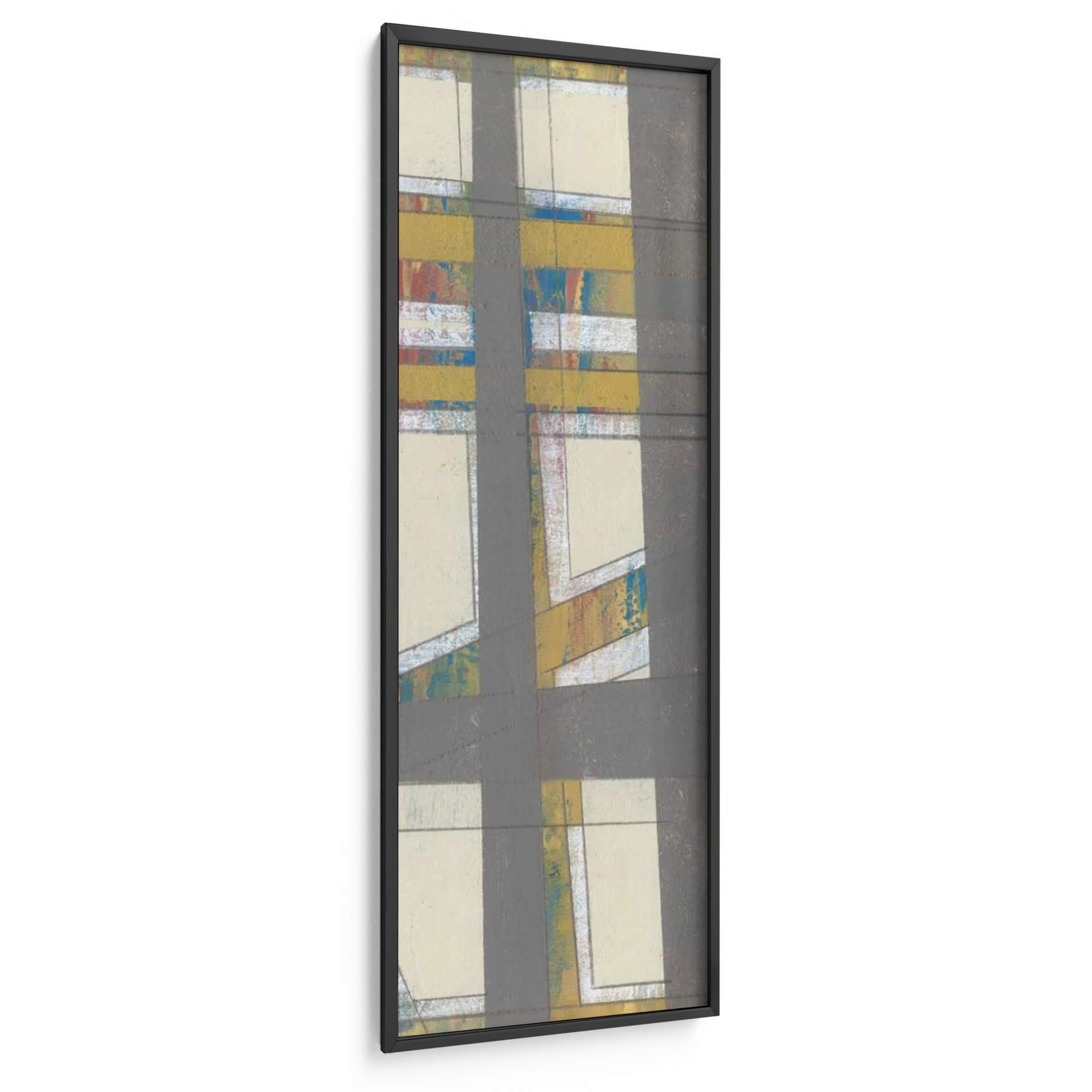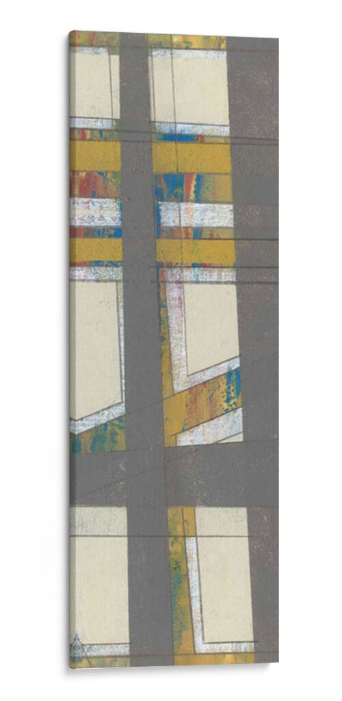 Sumérgete en la cautivadora obra de arte 'Industria Primaria II' de Jennifer Goldberger, un cuadro decorativo que evoca una fascinante mezcla de estructura y dinamismo. Esta pieza abstracta se caracteriza por su audaz composición geométrica, donde líneas grises oscuras se cruzan y definen espacios rectangulares de tonos crema y beige. Dentro de estas áreas, emergen pinceladas vibrantes de amarillo mostaza, azul eléctrico y toques de rojo y blanco, creando un contraste intrigante que rompe la aparente sobriedad. La textura sugerida en estas zonas de color añade profundidad y un carácter orgánico a la estética general. 'Industria Primaria II' transmite una sensación de orden y caos controlado, una energía contenida que puede revitalizar cualquier ambiente. Es una elección perfecta para espacios modernos, oficinas o salas de estar que buscan un punto focal arquitectónico con un toque de expresividad artística. Este cuadro decorativo contemporáneo es ideal para quienes aprecian el arte abstracto que combina elementos gráficos con una paleta de colores audaz y texturas sugerentes, ofreciendo una experiencia visual rica y estimulante. Añade una dimensión única a tu decoración con esta obra maestra.
