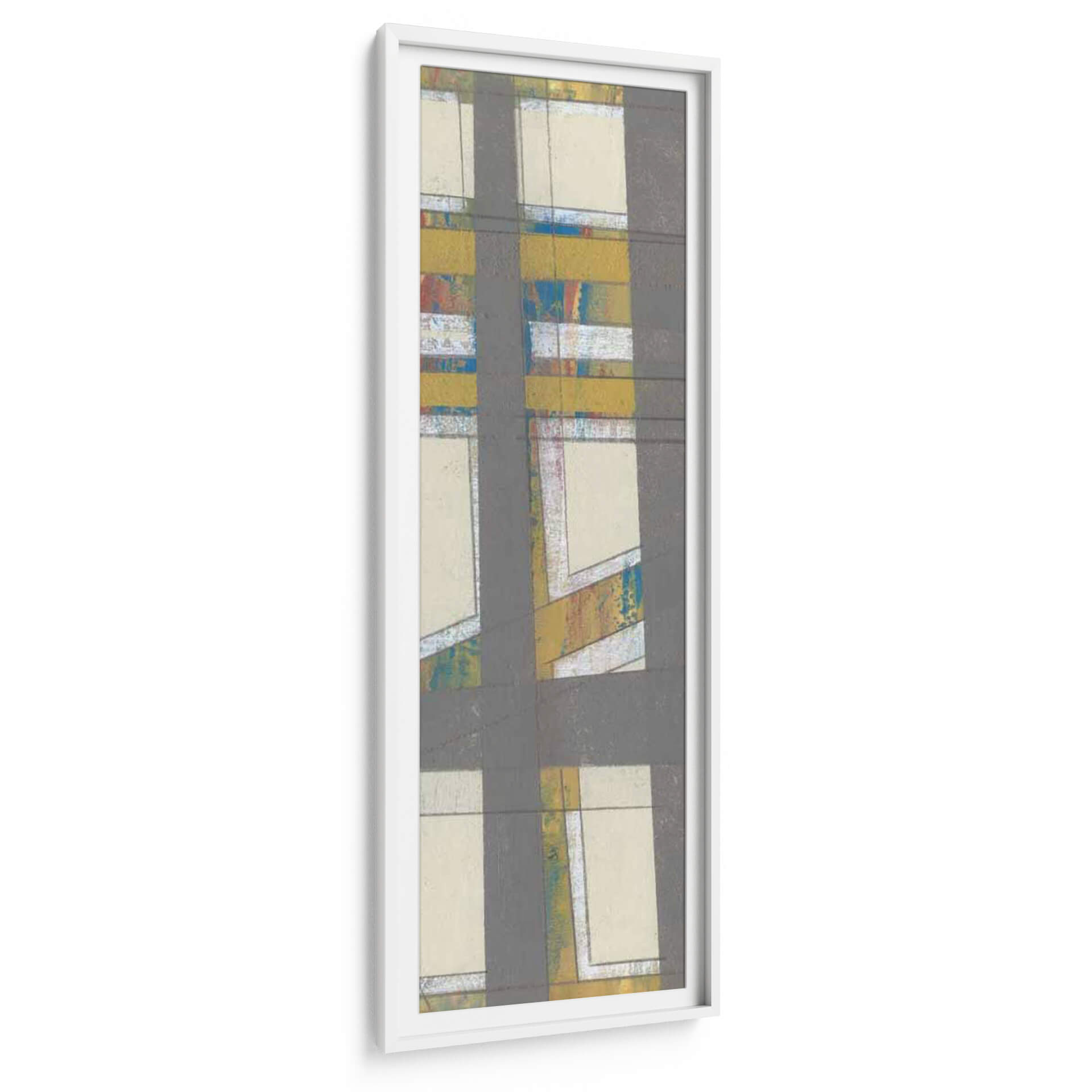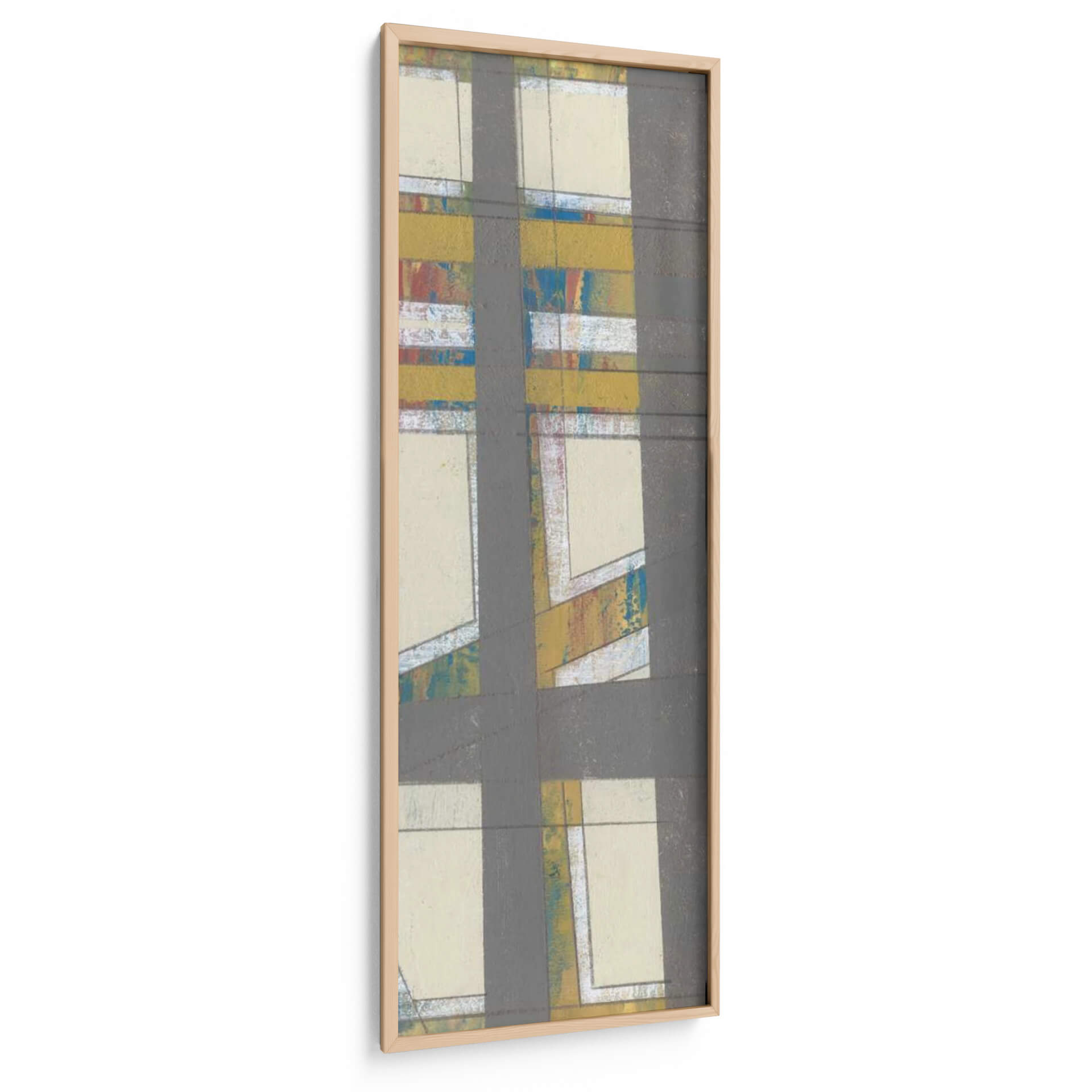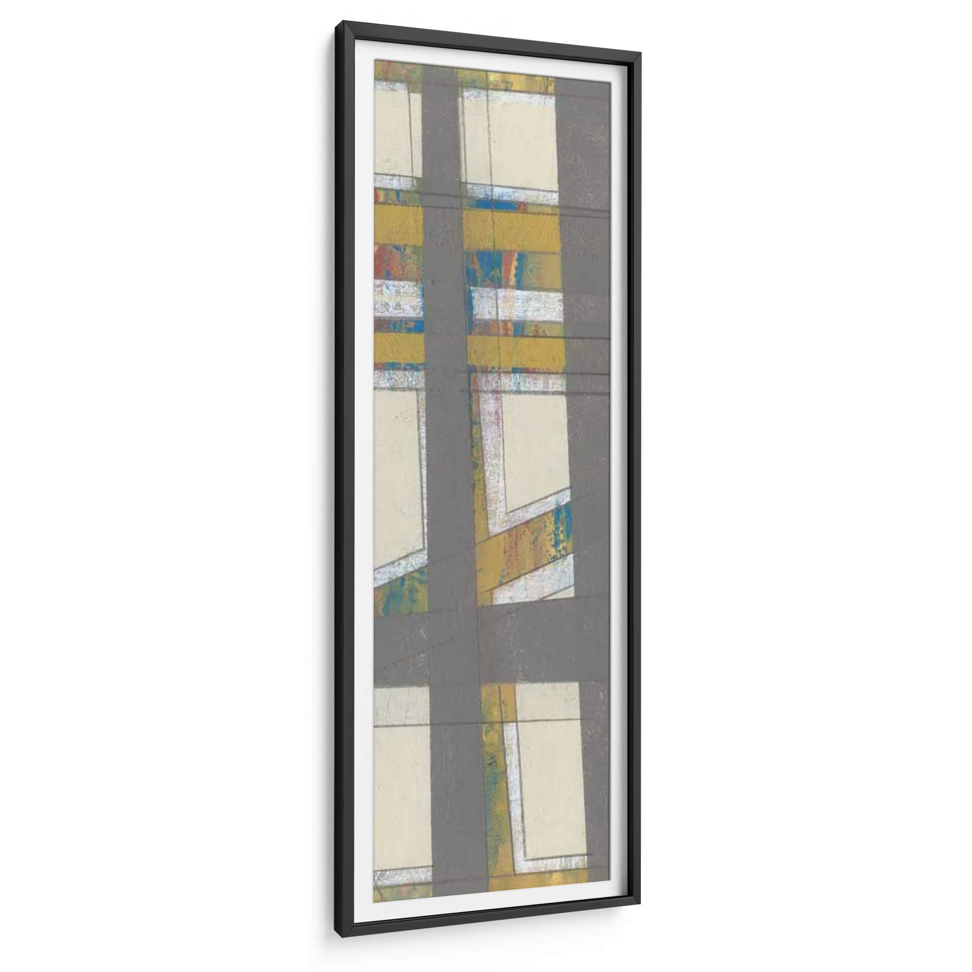 Sumérgete en la cautivadora obra de arte 'Industria Primaria II' de Jennifer Goldberger, un cuadro decorativo que evoca una fascinante mezcla de estructura y dinamismo. Esta pieza abstracta se caracteriza por su audaz composición geométrica, donde líneas grises oscuras se cruzan y definen espacios rectangulares de tonos crema y beige. Dentro de estas áreas, emergen pinceladas vibrantes de amarillo mostaza, azul eléctrico y toques de rojo y blanco, creando un contraste intrigante que rompe la aparente sobriedad. La textura sugerida en estas zonas de color añade profundidad y un carácter orgánico a la estética general. 'Industria Primaria II' transmite una sensación de orden y caos controlado, una energía contenida que puede revitalizar cualquier ambiente. Es una elección perfecta para espacios modernos, oficinas o salas de estar que buscan un punto focal arquitectónico con un toque de expresividad artística. Este cuadro decorativo contemporáneo es ideal para quienes aprecian el arte abstracto que combina elementos gráficos con una paleta de colores audaz y texturas sugerentes, ofreciendo una experiencia visual rica y estimulante. Añade una dimensión única a tu decoración con esta obra maestra.