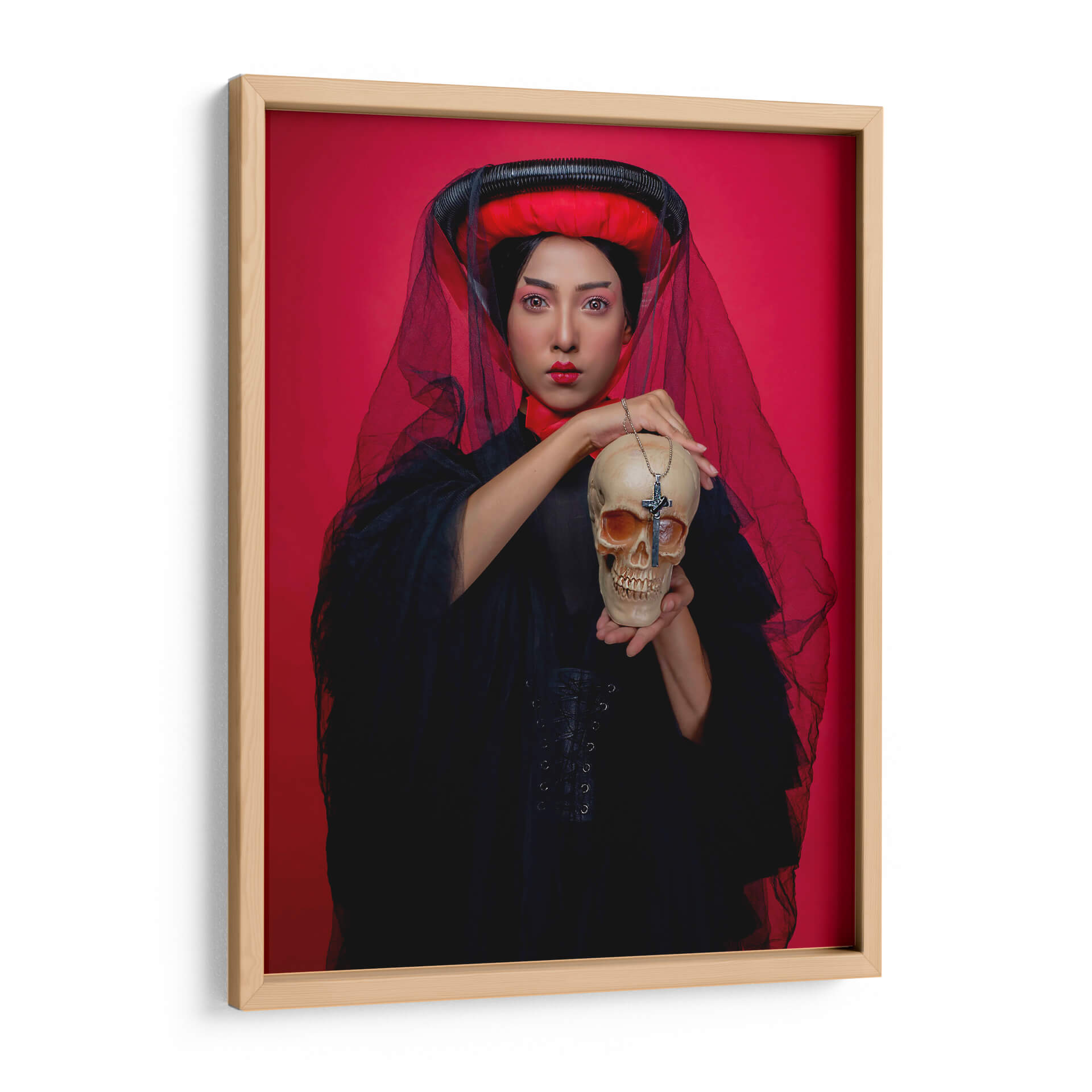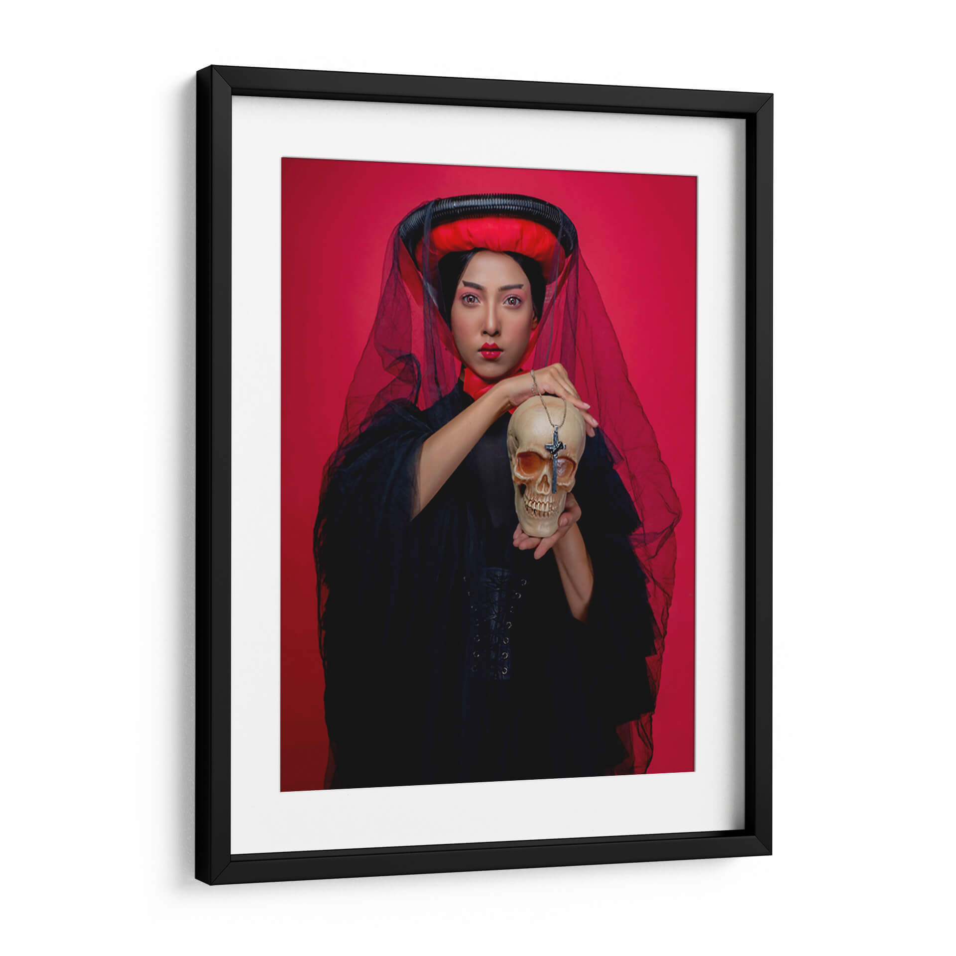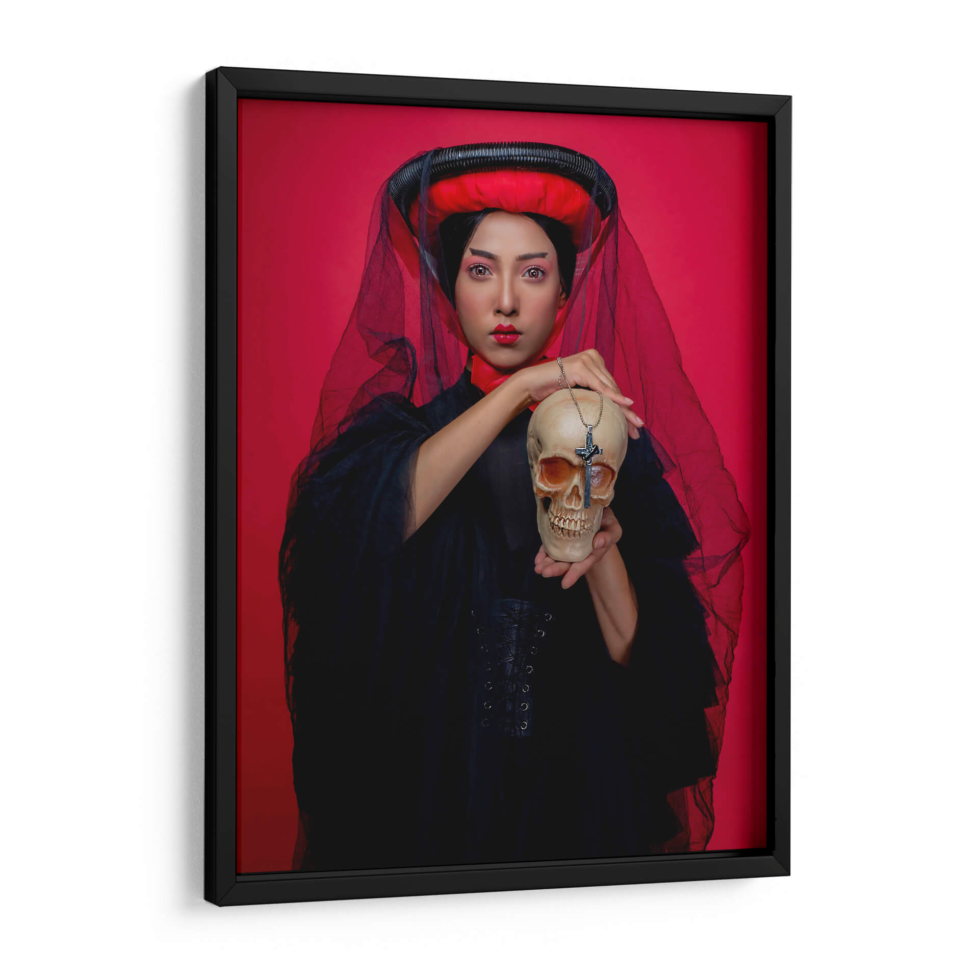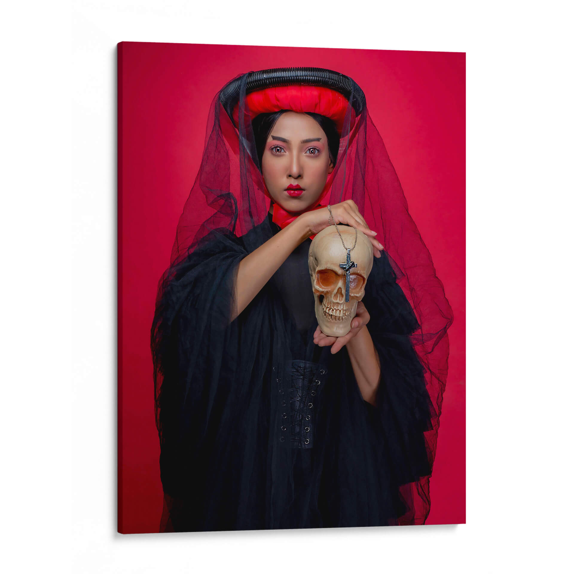 Sumérgete en el enigmático mundo de "JAPONESES MISTERIOSOS", una obra de arte contemporáneo que trasciende lo ordinario. Esta cautivadora pieza visual presenta a una figura femenina vestida con atuendos oscuros y un velo etéreo, su mirada intensa fija en el espectador mientras sostiene un cráneo adornado con un colgante cruciforme. El vibrante fondo rojo intensifica el drama y el misterio de la escena, creando un contraste impactante con la figura central y el tono pálido del cráneo. La composición, con su enfoque directo y la pose deliberada de la modelo, evoca una atmósfera de intriga, poder y reflexión sobre la dualidad de la vida y la muerte, o quizás sobre la feminidad y la fuerza interior. La paleta de colores, dominada por el rojo escarlata y los profundos negros, junto con los tonos tierra del cráneo, añade una dimensión de sofisticación y audacia. Ideal para espacios que buscan un toque de vanguardia y conversación, este cuadro decorativo es perfecto para salas de estar modernas, estudios creativos u oficinas que desean proyectar una imagen de carácter y profundidad. La habilidad del artista Debasish Chattopadhyay para capturar una narrativa visual tan potente en "JAPONESES MISTERIOSOS" la convierte en una adición imprescindible para los amantes del arte que aprecian las piezas con significado y una estética audaz. Transforma tu entorno con esta obra que invita a la contemplación y añade un aire de misterio contemporáneo.