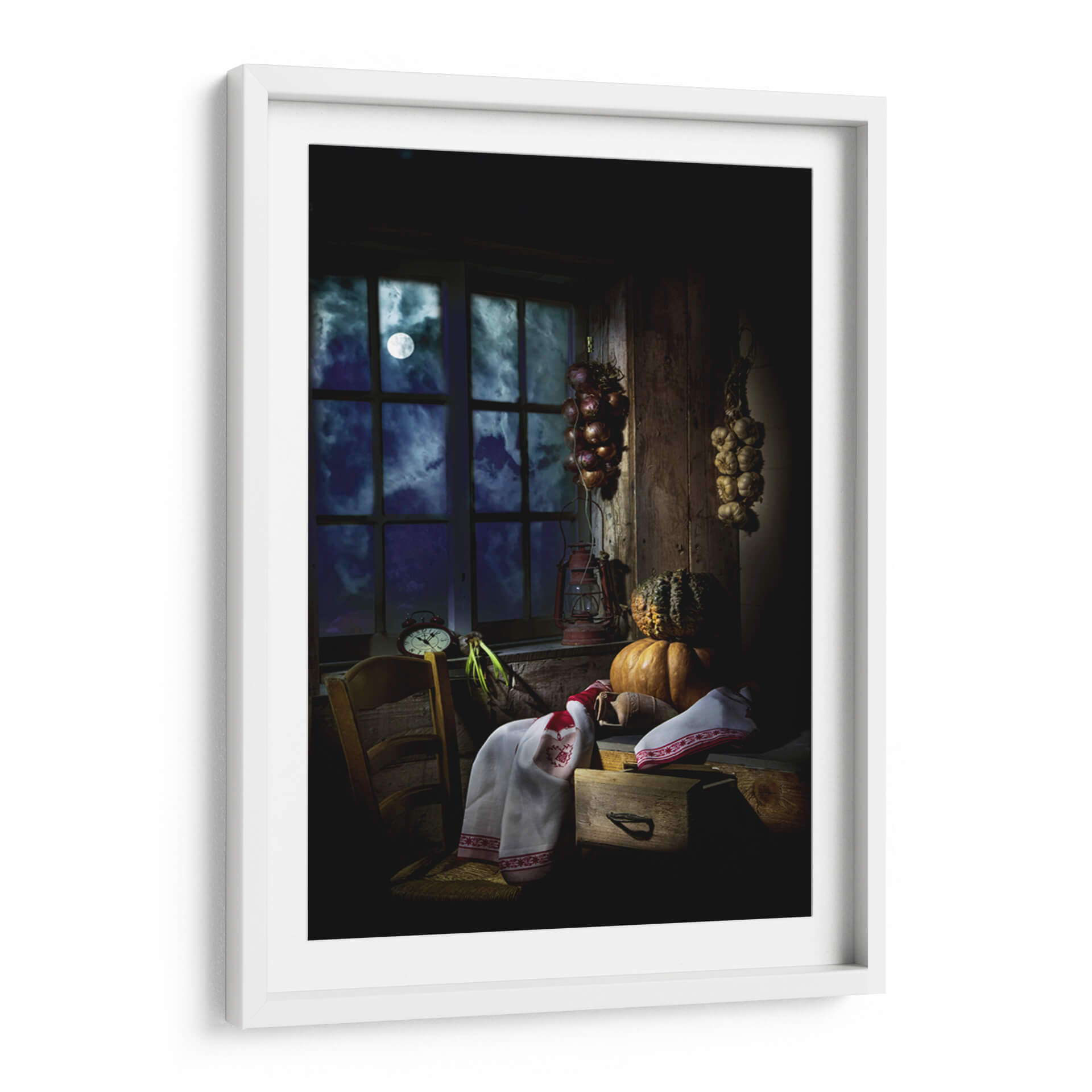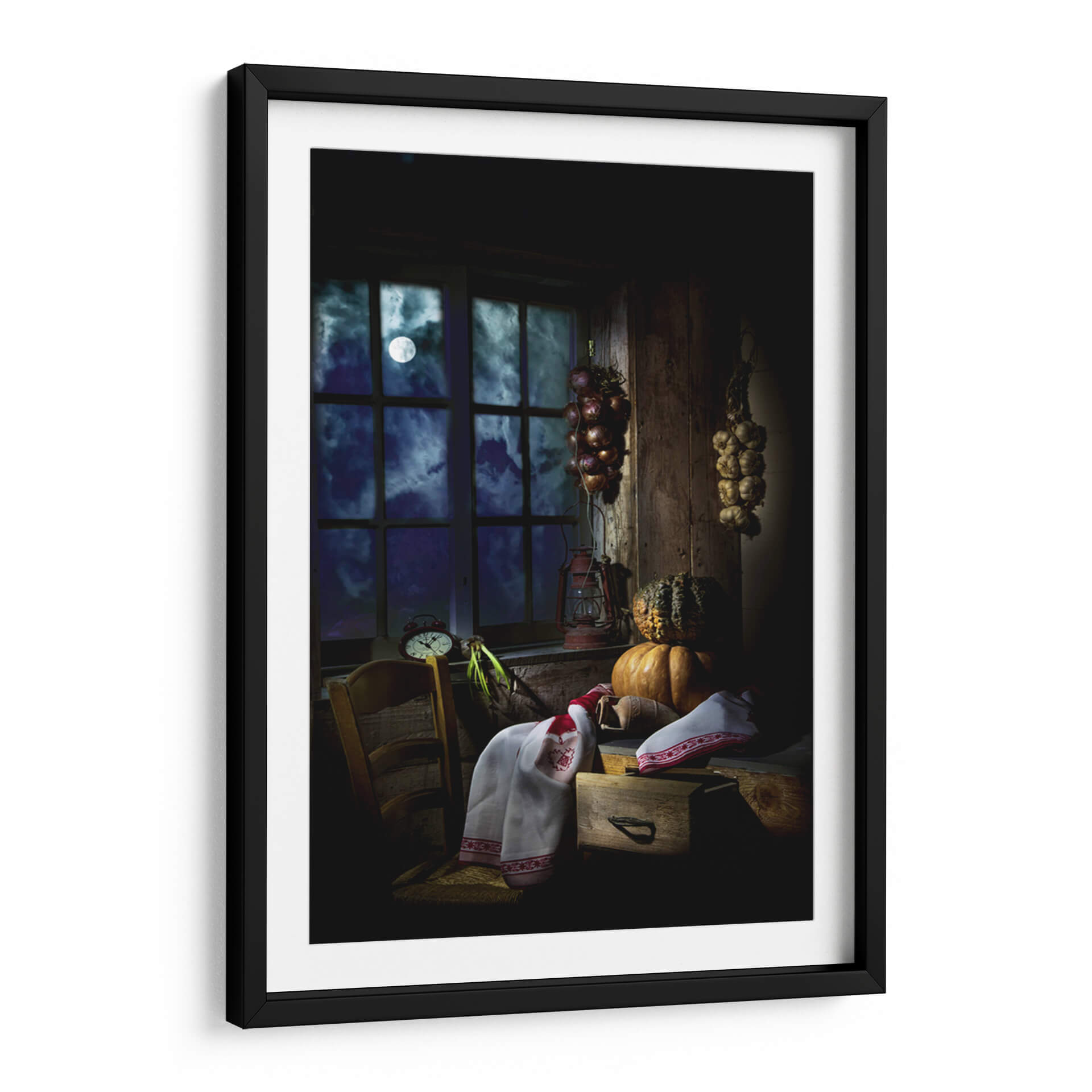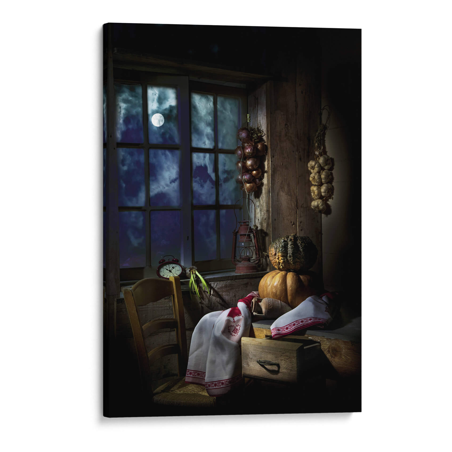 Sumérgete en la atmósfera misteriosa y acogedora de "La Noche de Halloween" de Felice Angelino, una obra de arte que captura la esencia de una noche otoñal con un toque de magia. A través de una ventana con parteluz, se vislumbra una luna llena pálida y un cielo estrellado envuelto en nubes dramáticas, sugiriendo un paisaje nocturno enigmático. En el interior, una escena rústica cobra vida con elementos que evocan la temporada: calabazas de formas variadas, ajos y cebollas secándose, y una lámpara de aceite antigua que proyecta una luz tenue. La paleta de colores se centra en profundos azules, negros, y ocres terrosos, con toques de rojo en los textiles y la linterna, creando un ambiente íntimo y ligeramente inquietante. El estilo detallado y la iluminación dramática, casi teatral, invitan a la contemplación y añaden una sensación de nostalgia o anticipación. Este cuadro decorativo es ideal para añadir un punto focal con carácter a salones, comedores o estudios, aportando una sensación de calidez hogareña con un trasfondo de misterio festivo. "La Noche de Halloween" es más que una imagen; es una invitación a sentir la quietud y la magia de una noche de otoño inolvidable, perfecta para coleccionistas de arte que aprecian las escenas evocadoras y la atmósfera detallada.