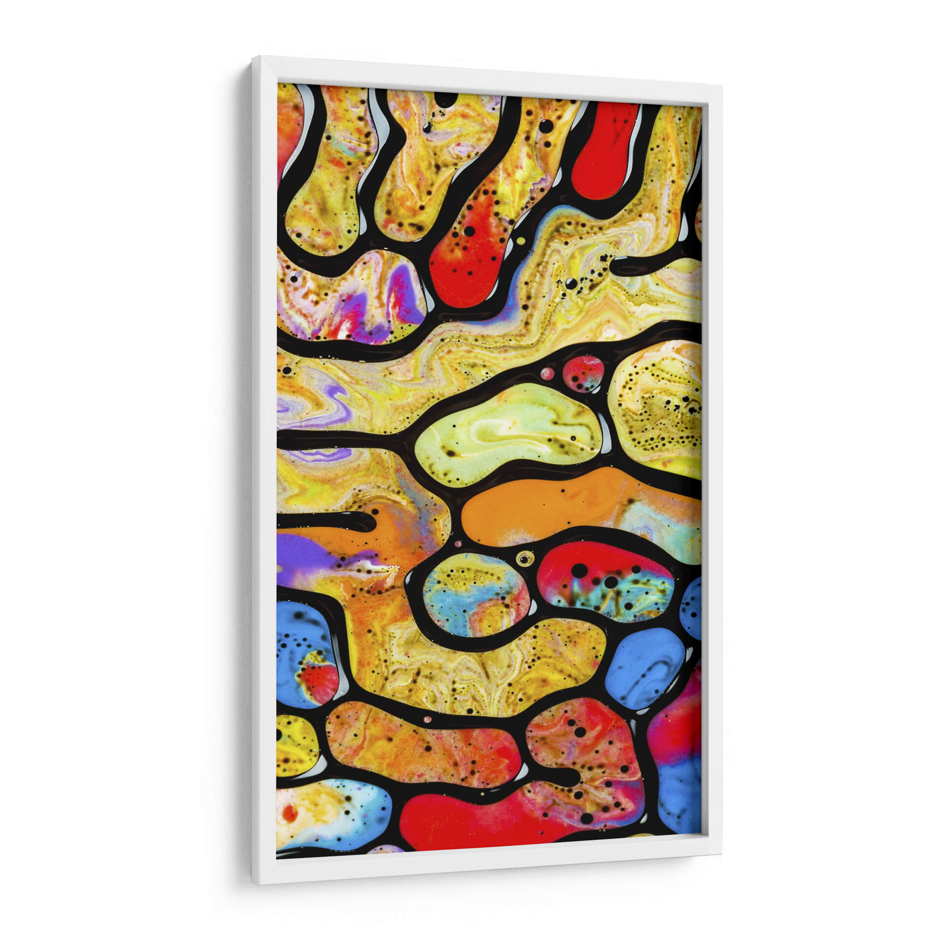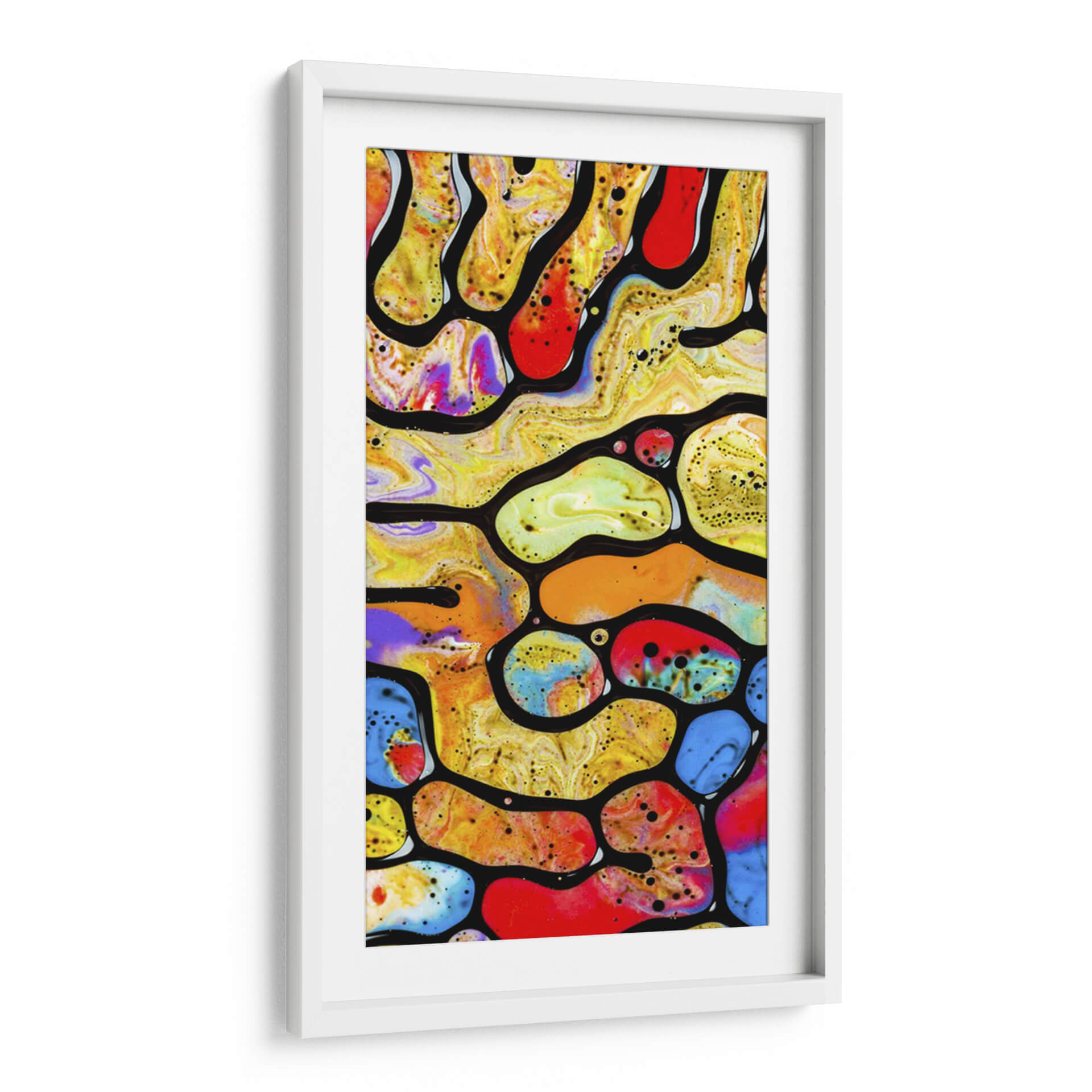 Adéntrate en el vibrante y enigmático mundo de 'Laberinto Acrílico', una obra de arte contemporáneo que captura la imaginación con su intrincada red de formas orgánicas y colores intensos. Esta pieza abstracta se despliega como un microcosmos de vida, donde fluidos de colores primarios y secundarios se entrelazan y chocan dentro de contornos negros definidos, creando una sensación de movimiento perpetuo y dinamismo. Los tonos amarillos, naranjas y rojos dominantes irradian energía y calidez, salpicados por vibrantes azules y púrpuras que añaden profundidad y sorpresa visual. Las pequeñas motas de color y las texturas sutiles dentro de cada forma invitan a una inspección más detallada, revelando capas de complejidad. 'Laberinto Acrílico' es más que una simple decoración de pared; es una ventana a un universo abstracto que estimula la curiosidad y fomenta la contemplación. Su estilo único y su audaz paleta de colores la convierten en una pieza central perfecta para cualquier espacio moderno, aportando un toque de sofisticación y carácter. Ideal para salas de estar, oficinas o cualquier lugar donde se desee una explosión de color y un punto de conversación intrigante.