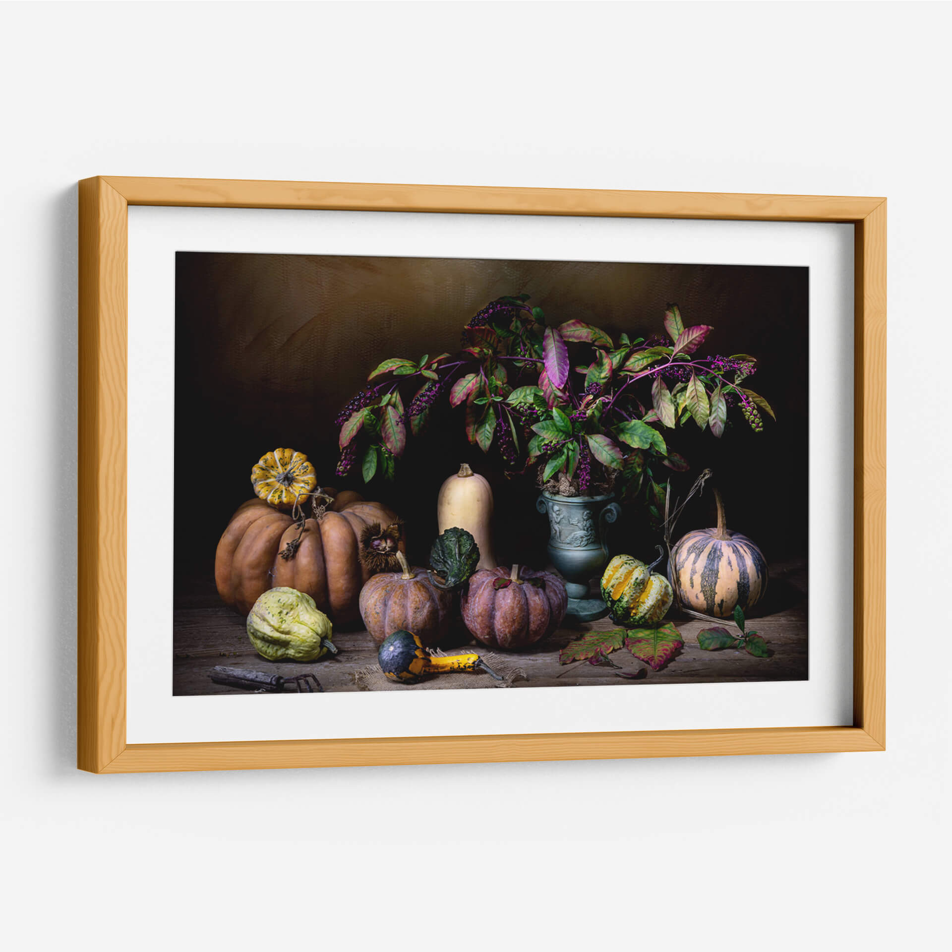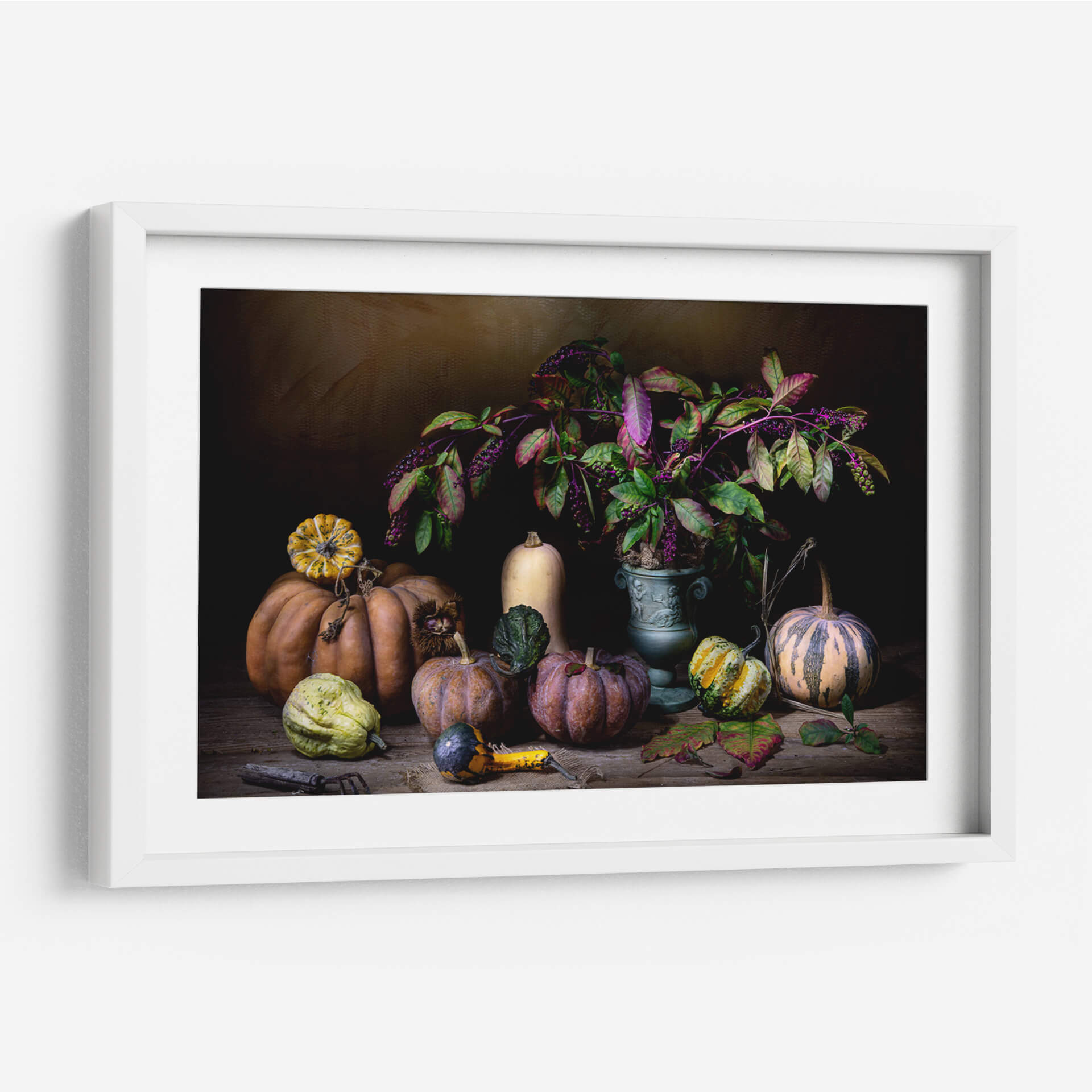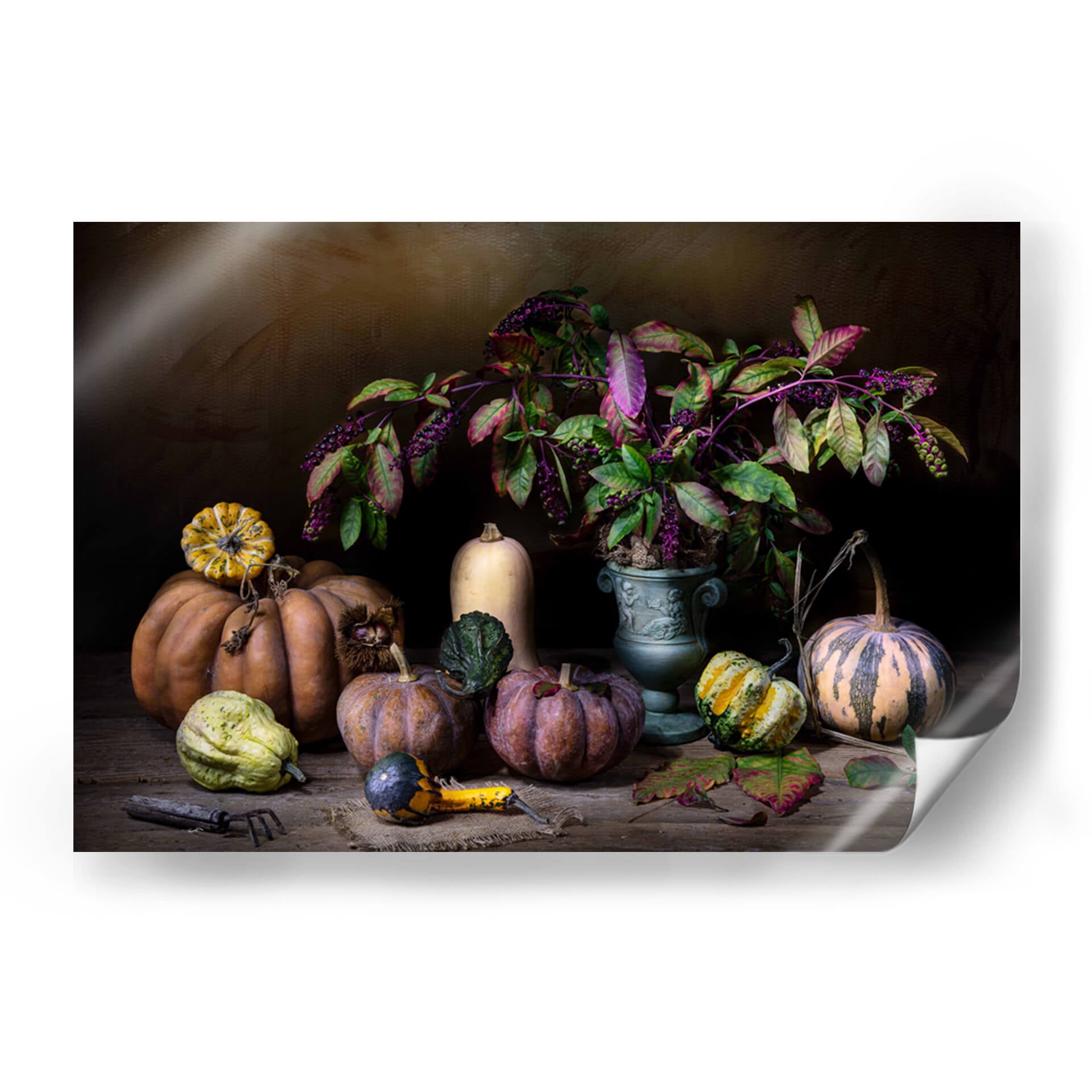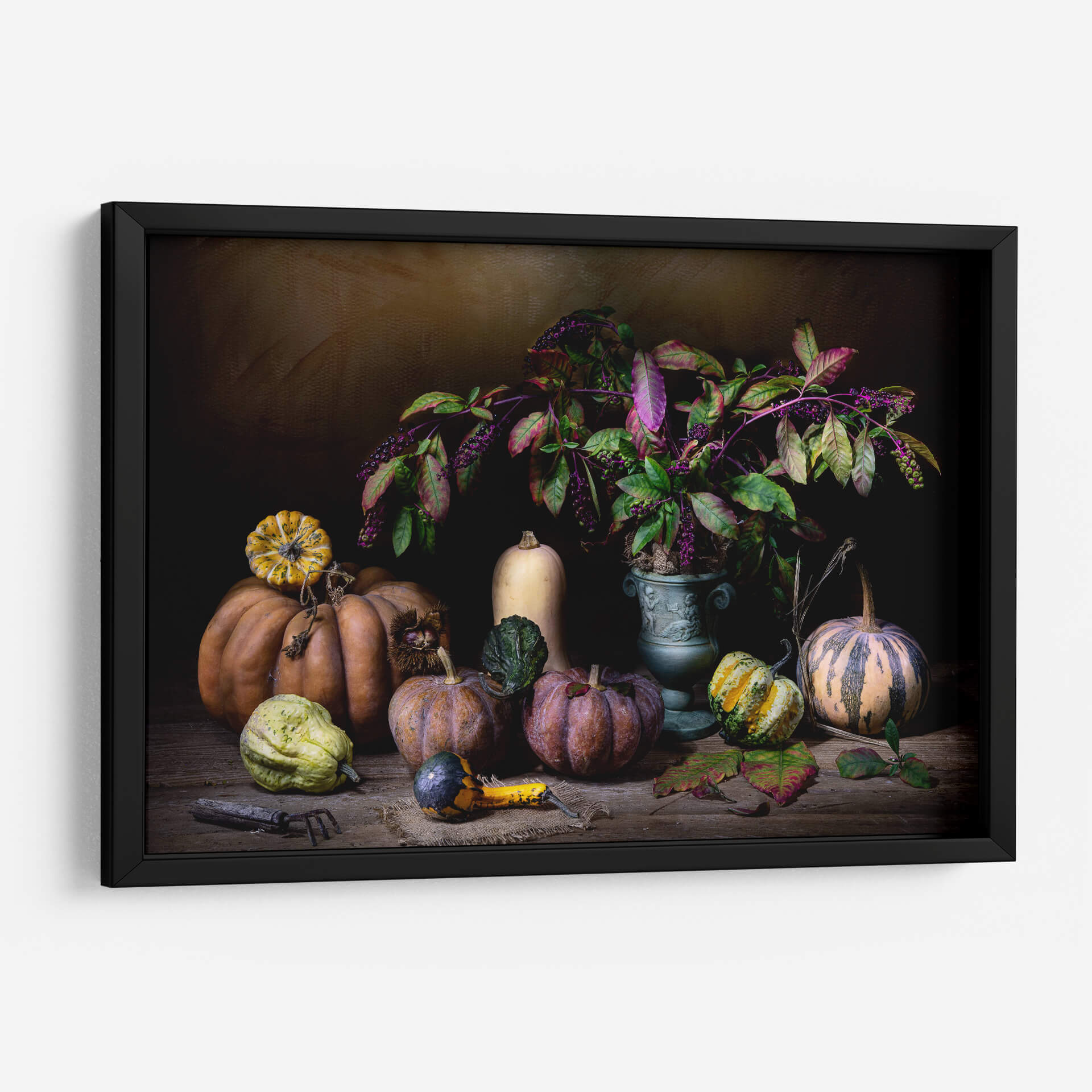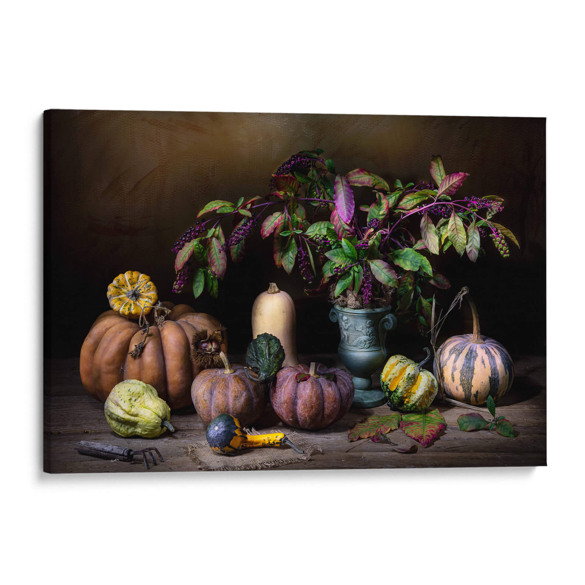 Sumérgete en la calidez y la abundancia de la naturaleza con este evocador cuadro decorativo, 'Las sorelle zuccone', del artista Felice Angelino. La obra presenta una exquisita composición de calabazas de diversas formas y tonalidades ocres y anaranjadas, dispuestas sobre una rústica superficie de madera. Un delicado follaje otoñal, con vibrantes hojas teñidas de púrpura y verde, y bayas oscuras en contraste, añade un toque de vida y color, todo ello enmarcado por un oscuro y texturizado fondo que realza la riqueza de los elementos. La iluminación suave y el estilo de naturaleza muerta clásica crean una atmósfera de serenidad y tradición, perfecta para añadir un acento acogedor a tu comedor, cocina o sala de estar. Este cuadro decorativo es ideal para quienes aprecian la belleza de las estaciones y buscan infundir sus espacios con una sensación de confort y conexión con la tierra. Deja que esta pieza atemporal sea el centro de atención en tu hogar, evocando la generosidad del otoño y el arte de la vida.