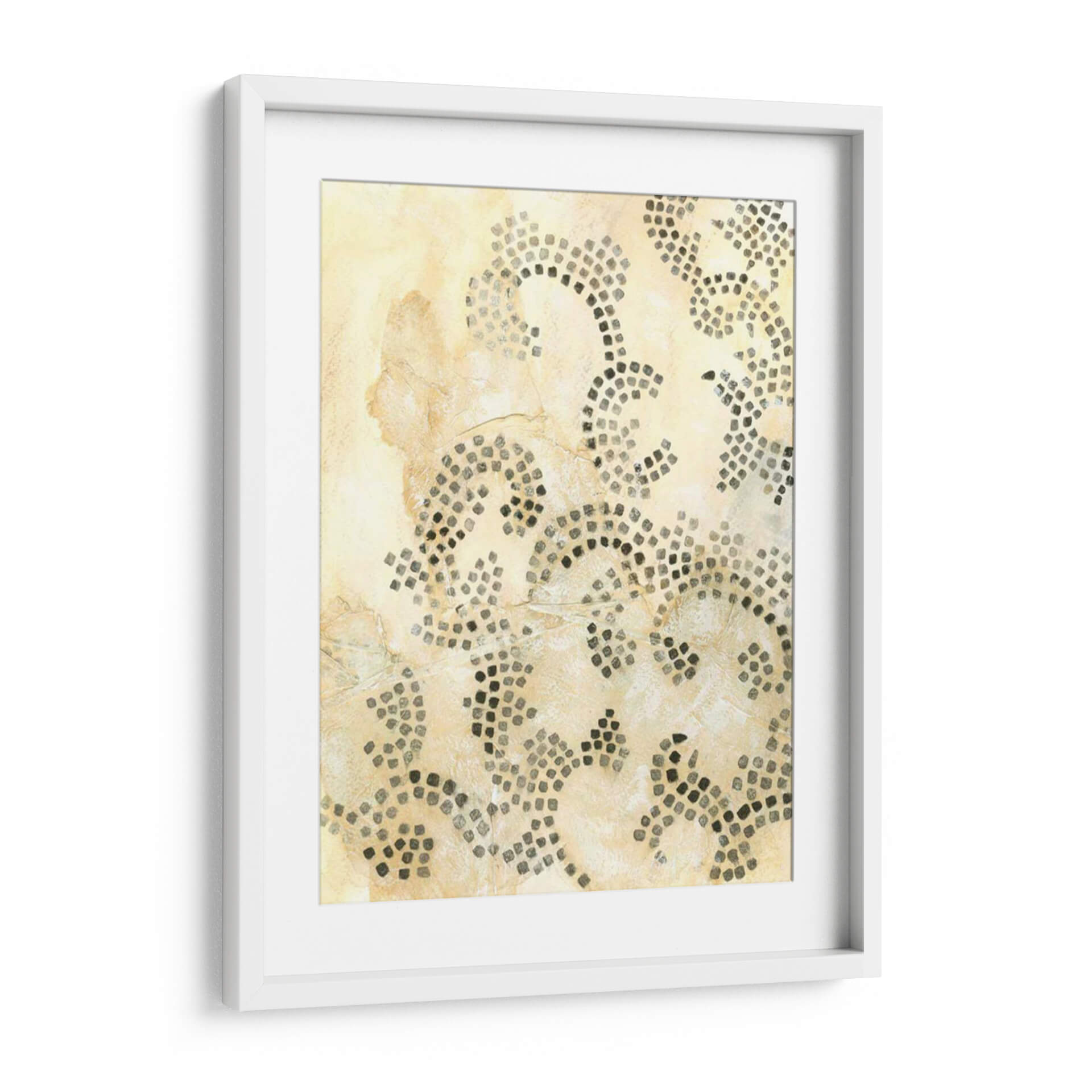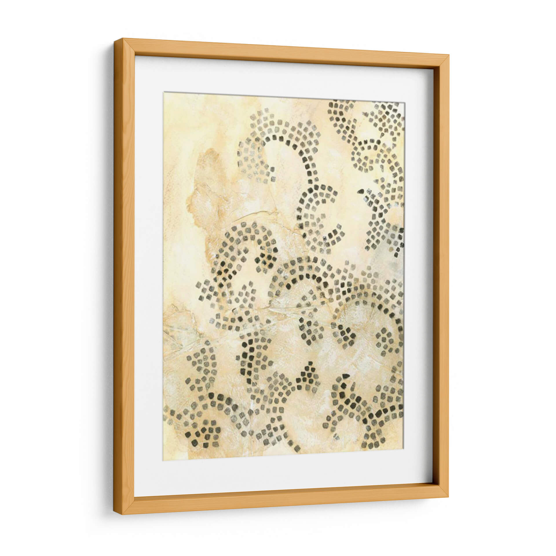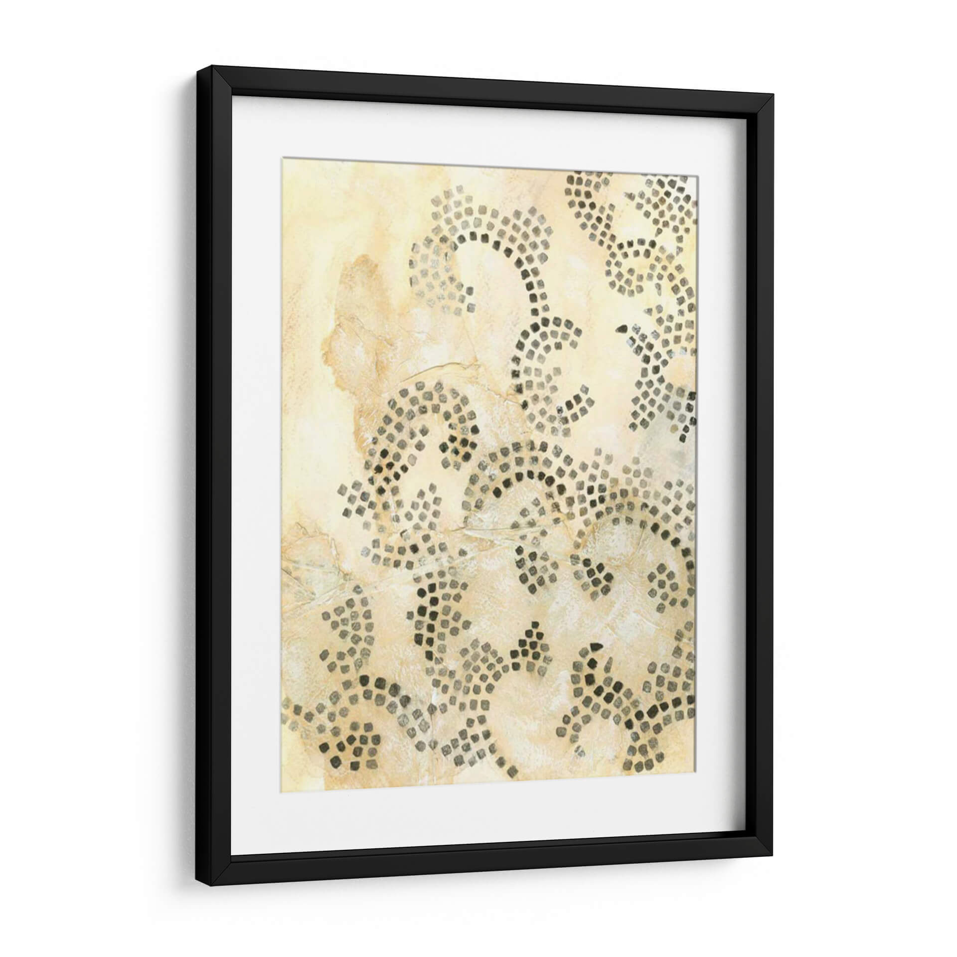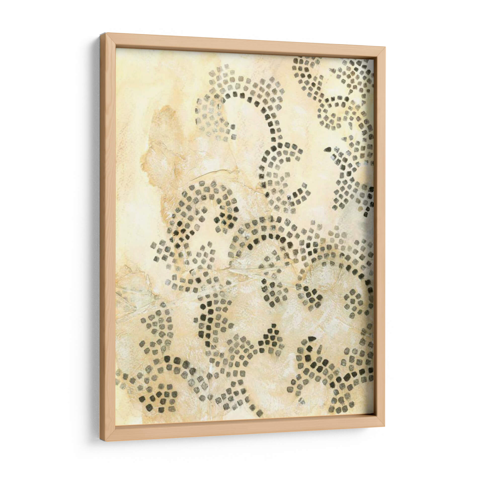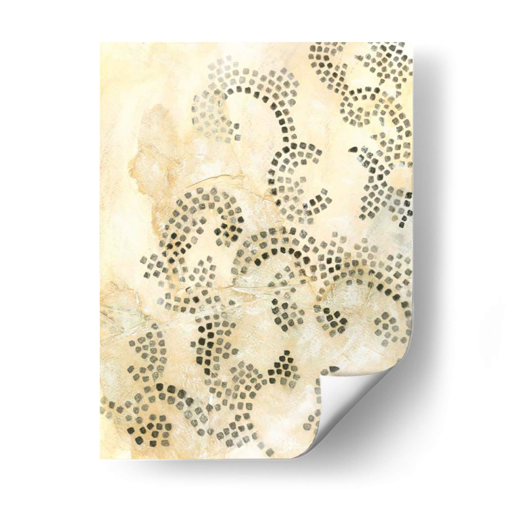 Sumérgete en la sutileza y la textura de 'Mosaico Antiguo I', una obra de arte de Chariklia Zarris que evoca la sensación de historia y artesanía. Este cuadro decorativo presenta un diseño abstracto inspirado en motivos de mosaico, compuesto por pequeños cuadrados oscuros dispuestos en patrones orgánicos y fluidos sobre un fondo texturizado en tonos tierra y crema. La paleta de colores cálidos y neutros, dominada por beiges, marfiles y grises oscuros, crea una atmósfera de calma y sofisticación, perfecta para añadir un toque de elegancia atemporal a cualquier espacio. La composición, con sus líneas curvas y la densidad variable de los 'mosaicos', invita a la contemplación y aporta profundidad visual. Ideal para salones, dormitorios o estudios que busquen un elemento decorativo que combine arte contemporáneo con un guiño a las técnicas ancestrales. 'Mosaico Antiguo I' no es solo una pieza de decoración, sino una invitación a apreciar la belleza en los detalles y la armonía de las formas.