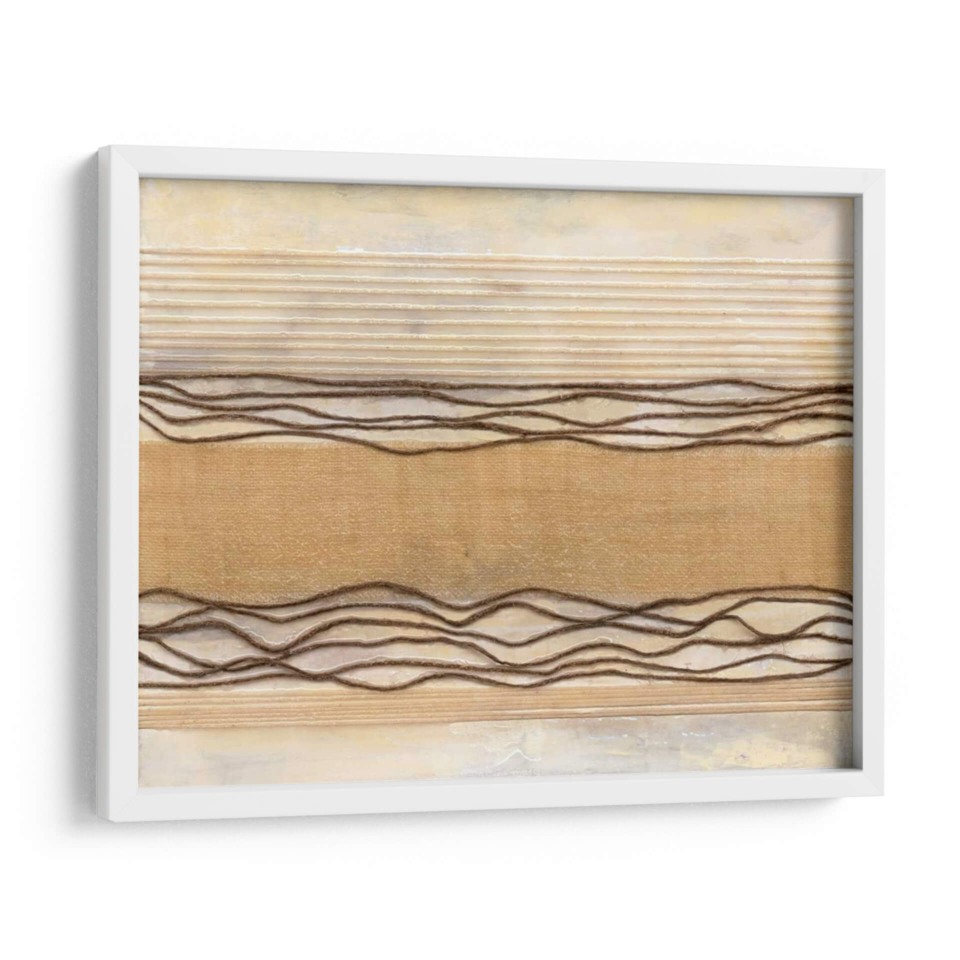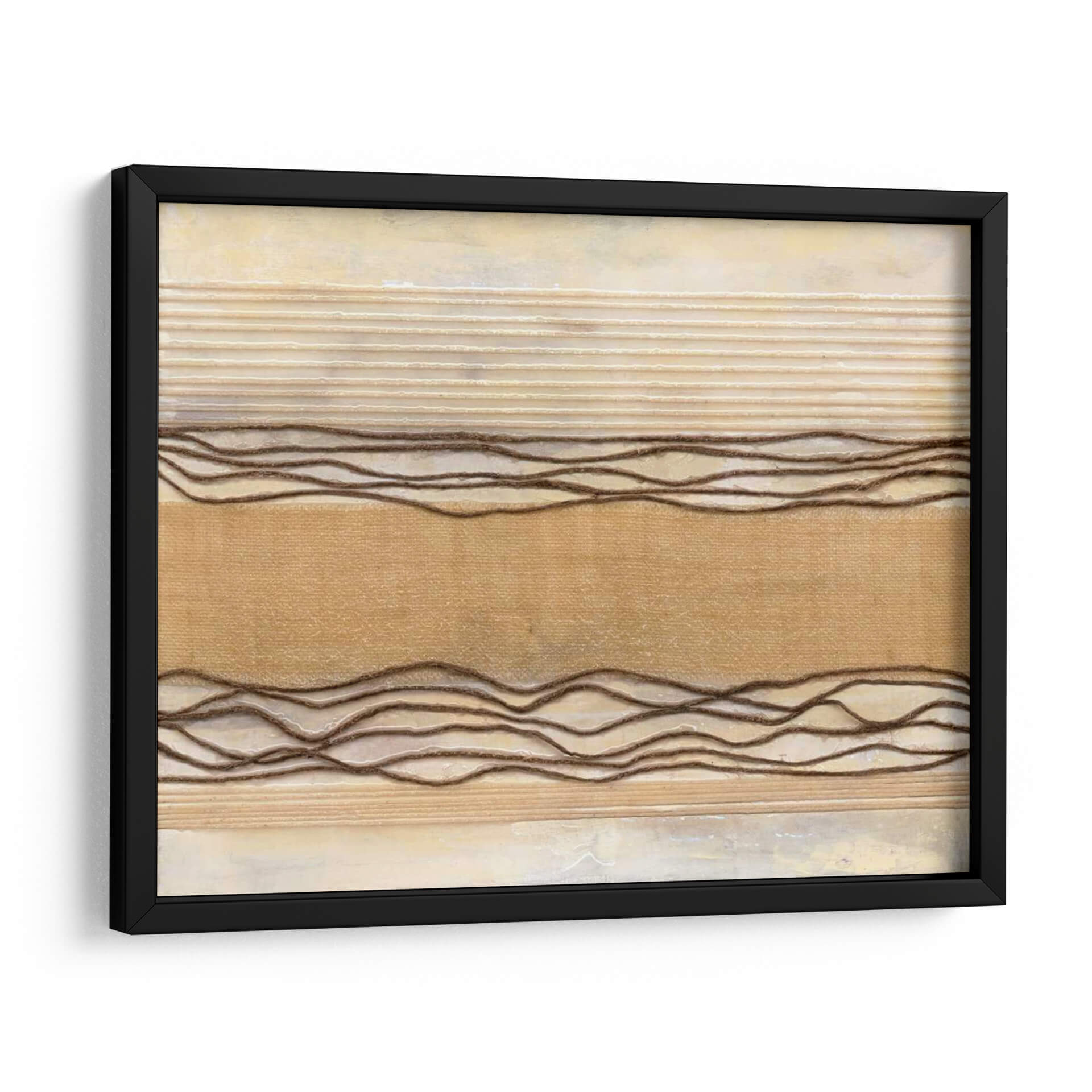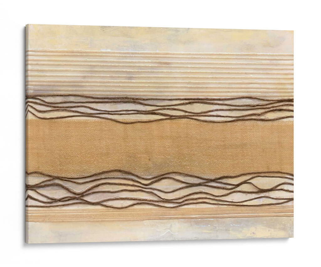 Sumérgete en la serenidad de 'Powder Springs I', una obra de arte abstracto que evoca la calma y la textura natural. Natalie Avondet crea un paisaje visual sutil, dominado por tonos tierra y una paleta de colores cálidos que incluyen beiges cremosos, ocres suaves y acentos de marrón terroso. Las líneas horizontales en relieve, algunas finas y otras más gruesas y onduladas, aportan una dimensión táctil y un ritmo visual que recuerda a la naturaleza: las capas de tierra, las texturas de la tela o incluso las ondas suaves en el agua. El fondo, con su acabado texturizado y ligeramente desgastado, añade profundidad y un aire de sofisticación rústica. Esta pieza es ideal para espacios que buscan un toque de calidez y tranquilidad, como dormitorios, salas de estar o estudios. Su diseño abstracto y orgánico la convierte en un complemento perfecto para decoraciones contemporáneas, minimalistas o bohemias, aportando un punto de interés visual sin abrumar. 'Powder Springs I' invita a la contemplación y a la conexión con lo esencial, transformando cualquier pared en un refugio de paz.