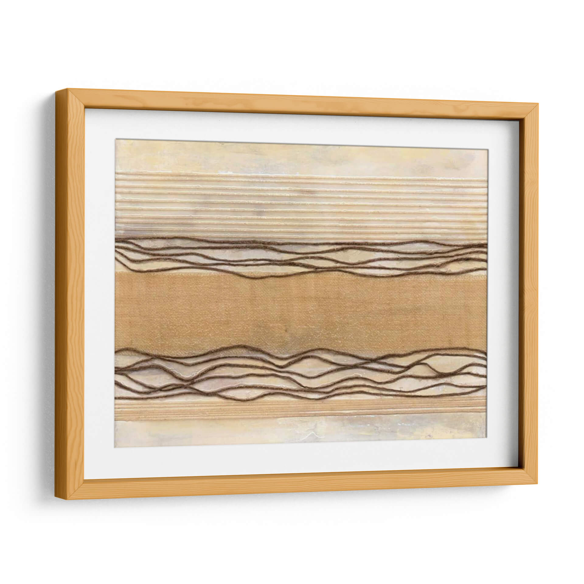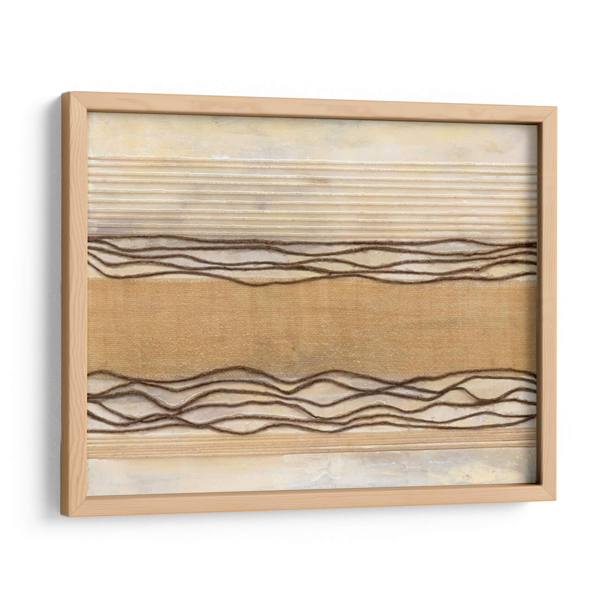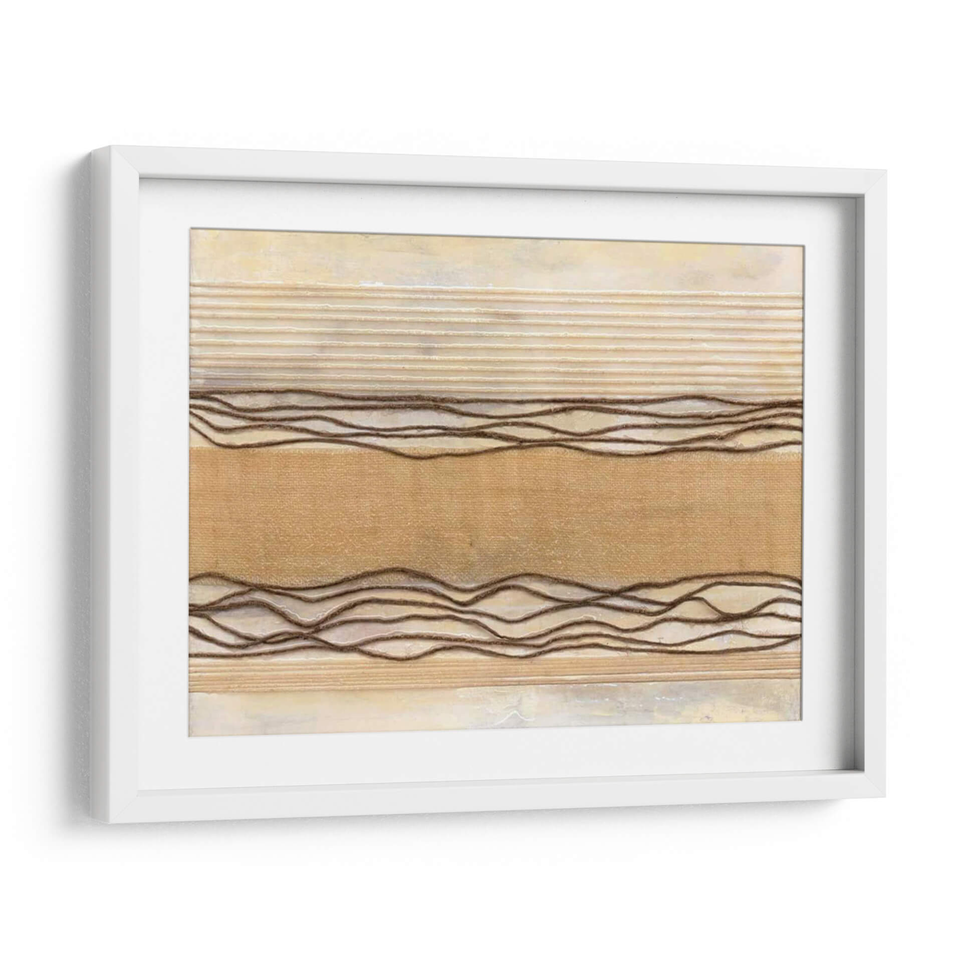 Sumérgete en la serenidad de 'Powder Springs I', una obra de arte abstracto que evoca la calma y la textura natural. Natalie Avondet crea un paisaje visual sutil, dominado por tonos tierra y una paleta de colores cálidos que incluyen beiges cremosos, ocres suaves y acentos de marrón terroso. Las líneas horizontales en relieve, algunas finas y otras más gruesas y onduladas, aportan una dimensión táctil y un ritmo visual que recuerda a la naturaleza: las capas de tierra, las texturas de la tela o incluso las ondas suaves en el agua. El fondo, con su acabado texturizado y ligeramente desgastado, añade profundidad y un aire de sofisticación rústica. Esta pieza es ideal para espacios que buscan un toque de calidez y tranquilidad, como dormitorios, salas de estar o estudios. Su diseño abstracto y orgánico la convierte en un complemento perfecto para decoraciones contemporáneas, minimalistas o bohemias, aportando un punto de interés visual sin abrumar. 'Powder Springs I' invita a la contemplación y a la conexión con lo esencial, transformando cualquier pared en un refugio de paz.