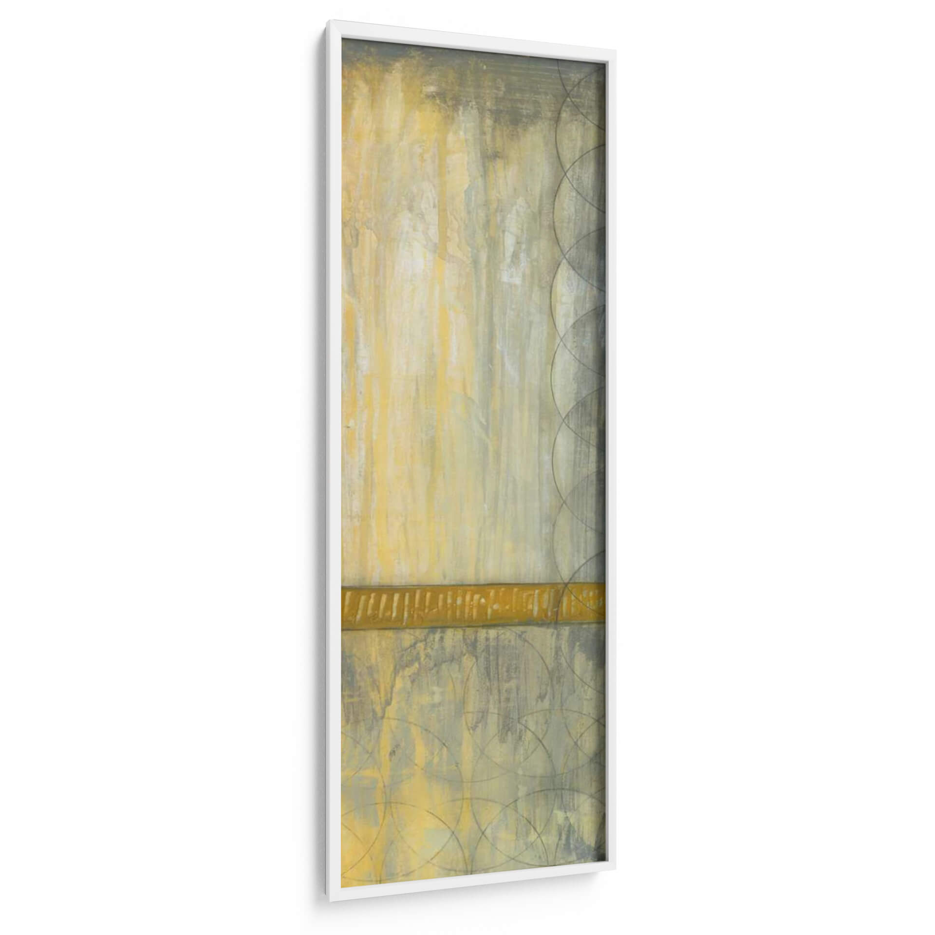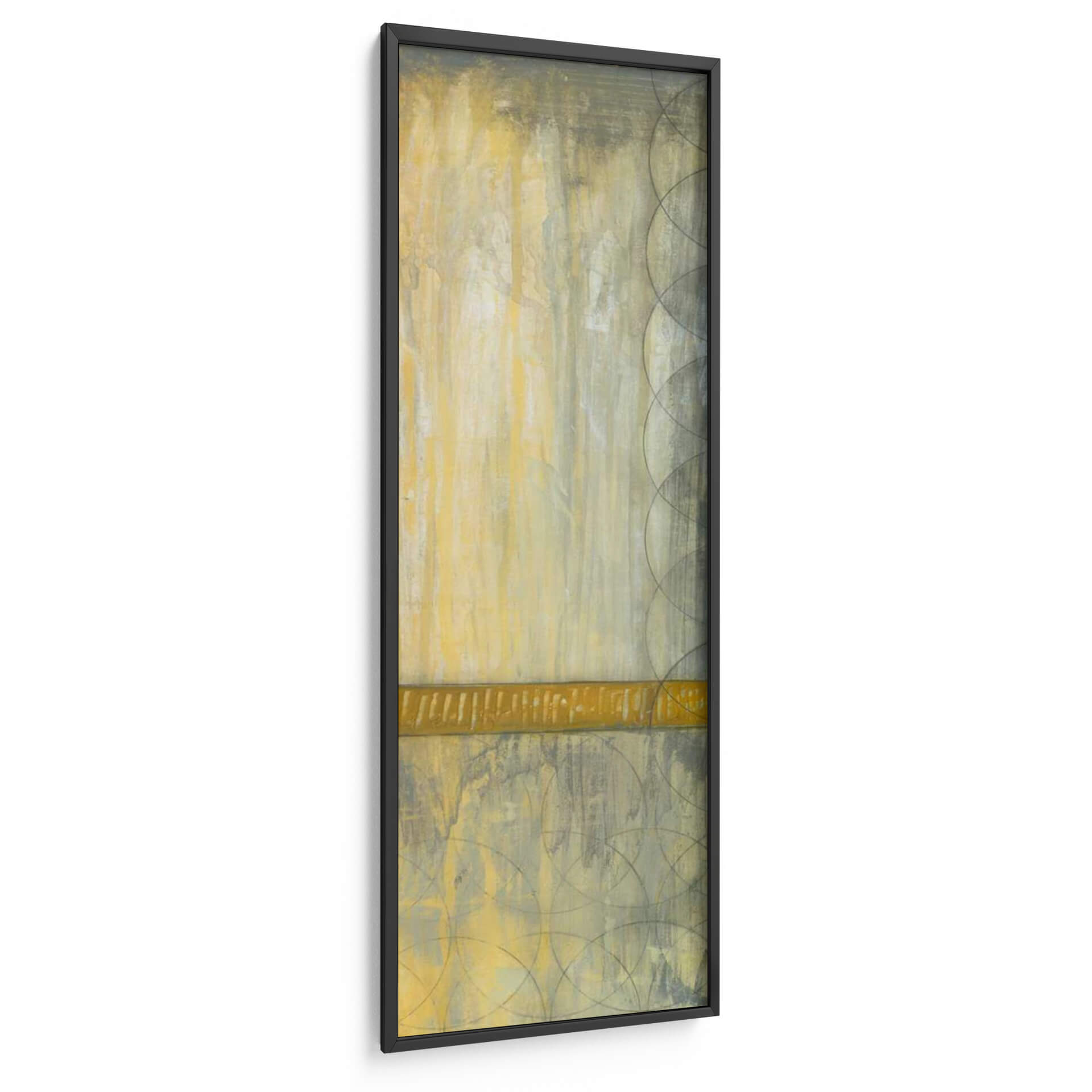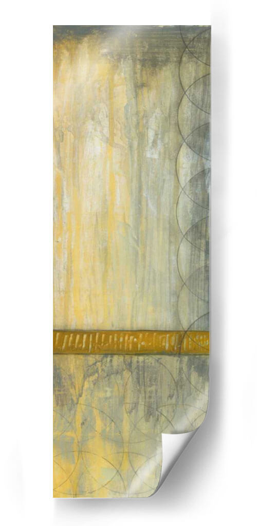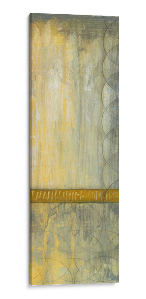Sumérgete en la serena elegancia de "Repita Los Círculos I", una cautivadora obra de arte abstracto de Jennifer Goldberger. Esta pieza vertical se despliega en una paleta de tonos tierra, dominada por cálidos ocres y amarillos, contrastados con sutiles grises y un toque de verde oliva, creando una atmósfera de tranquilidad y sofisticación. Las texturas ricas y las pinceladas evocan una sensación de profundidad y movimiento, como si la luz se filtrara a través de una bruma sutil o el tiempo se desdibujara en formas circulares superpuestas. Una banda horizontal de un vibrante color dorado cruza la composición, actuando como un punto focal que ancla la pieza y añade un toque de calidez. Los patrones de círculos superpuestos, delicadamente trazados en tonos más oscuros, introducen un elemento geométrico y rítmico que equilibra la expresividad del fondo. "Repita Los Círculos I" es ideal para añadir un toque de arte contemporáneo y sereno a cualquier espacio, ya sea una sala de estar, un dormitorio o una oficina, transformando tu entorno en un refugio de calma y estilo. Este cuadro decorativo invita a la contemplación y añade una dimensión visual única, resonando con aquellos que buscan arte que combine la abstracción moderna con una sensación de paz interior.