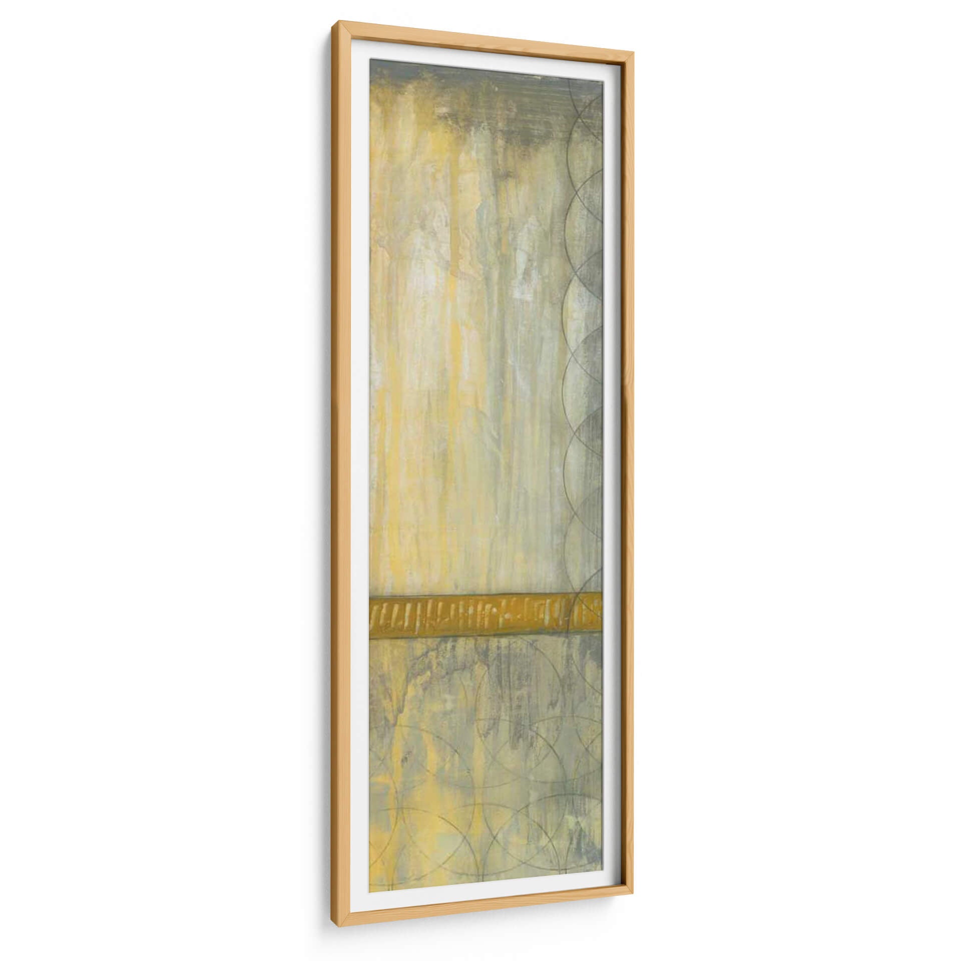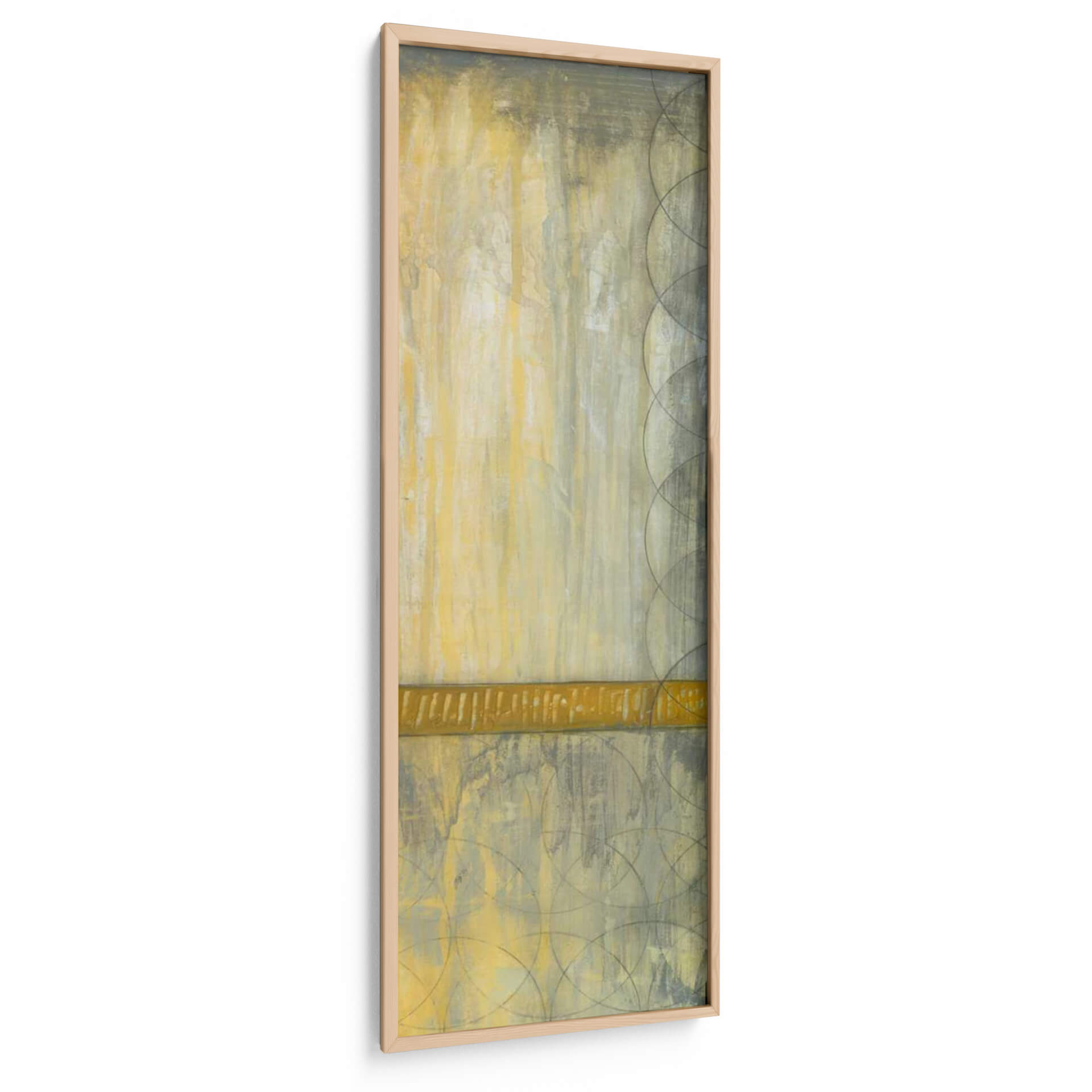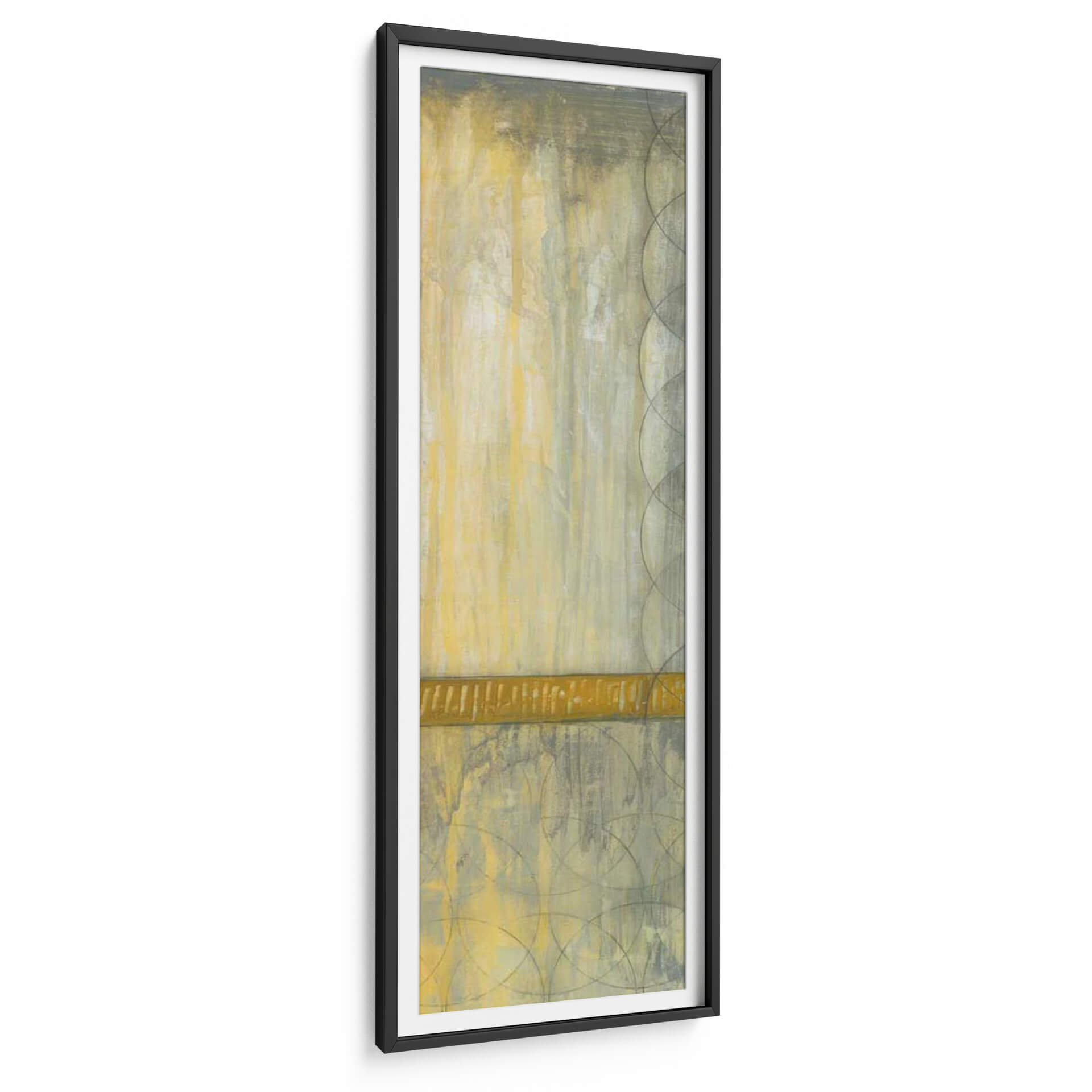 Sumérgete en la serena elegancia de "Repita Los Círculos I", una cautivadora obra de arte abstracto de Jennifer Goldberger. Esta pieza vertical se despliega en una paleta de tonos tierra, dominada por cálidos ocres y amarillos, contrastados con sutiles grises y un toque de verde oliva, creando una atmósfera de tranquilidad y sofisticación. Las texturas ricas y las pinceladas evocan una sensación de profundidad y movimiento, como si la luz se filtrara a través de una bruma sutil o el tiempo se desdibujara en formas circulares superpuestas. Una banda horizontal de un vibrante color dorado cruza la composición, actuando como un punto focal que ancla la pieza y añade un toque de calidez. Los patrones de círculos superpuestos, delicadamente trazados en tonos más oscuros, introducen un elemento geométrico y rítmico que equilibra la expresividad del fondo. "Repita Los Círculos I" es ideal para añadir un toque de arte contemporáneo y sereno a cualquier espacio, ya sea una sala de estar, un dormitorio o una oficina, transformando tu entorno en un refugio de calma y estilo. Este cuadro decorativo invita a la contemplación y añade una dimensión visual única, resonando con aquellos que buscan arte que combine la abstracción moderna con una sensación de paz interior.