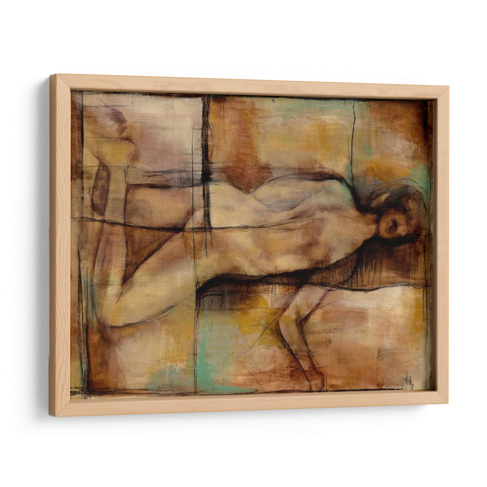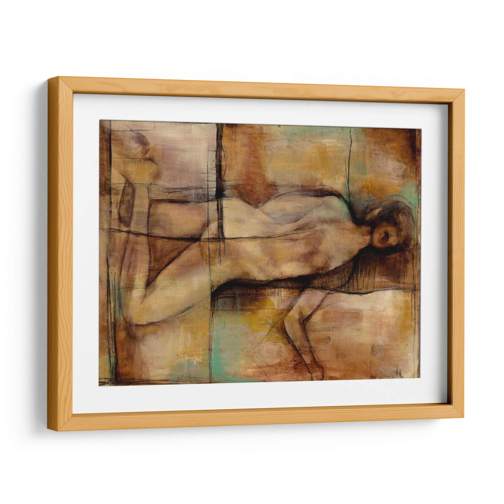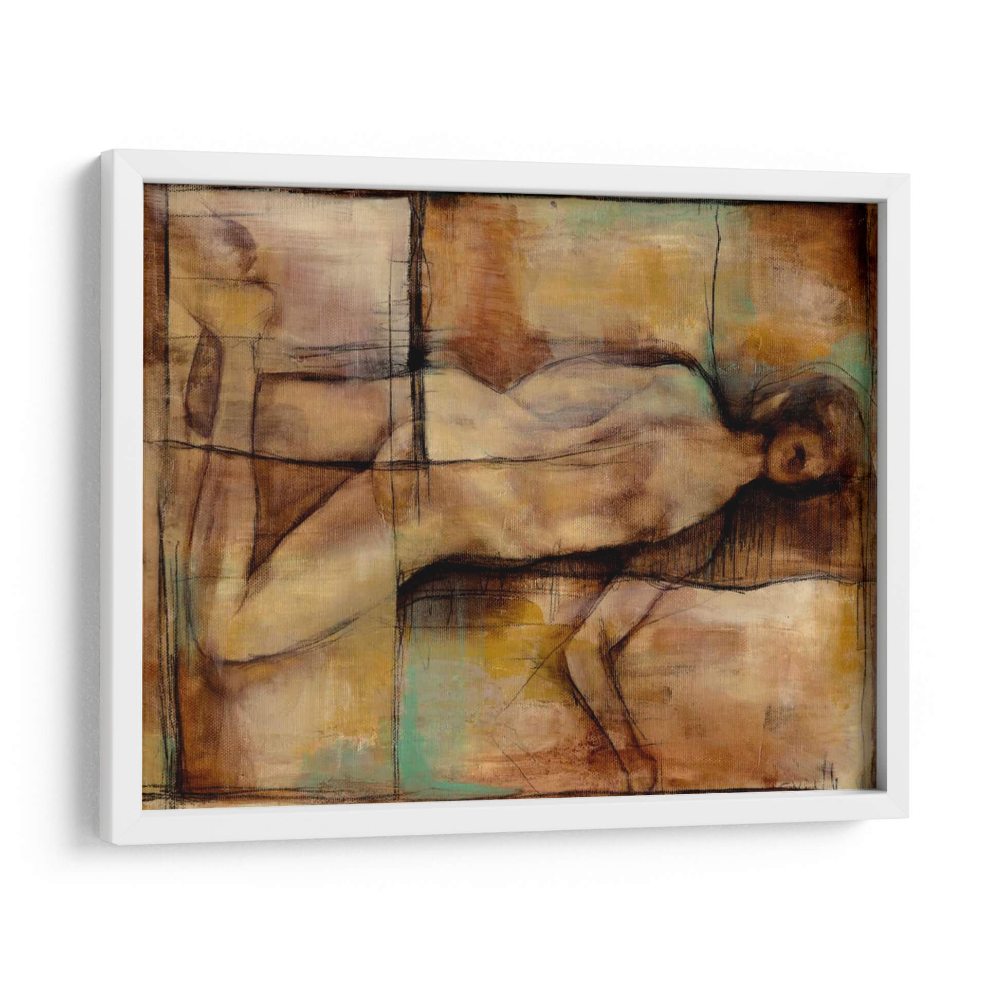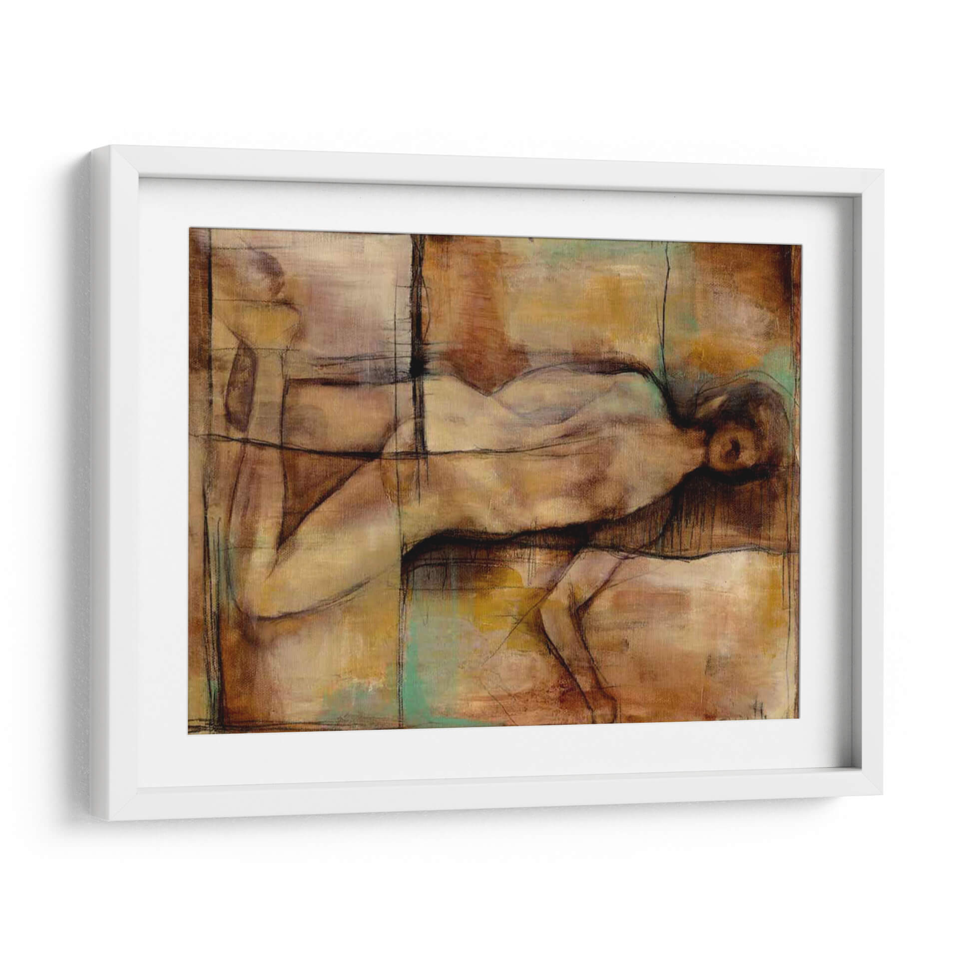 Sumérgete en la atmósfera introspectiva y artística de "Resumen Proporciones II" de Jennifer Goldberger. Esta cautivadora obra de arte contemporáneo presenta una figura humana estilizada, representada con trazos audaces y una paleta de colores cálidos y terrosos que evocan profundidad y emoción. Los tonos ocres, marrones y los sutiles toques de verde turquesa se entrelazan en una composición abstracta que invita a la contemplación. La técnica mixta, con líneas de carboncillo que delinean suavemente las formas, añade una dimensión textural y un aire de estudio a la pieza. Ideal para quienes buscan añadir un toque de sofisticación y reflexión a su hogar u oficina, este cuadro decorativo funciona como un punto focal sereno pero intrigante. Su estilo abstracto y su representación de la figura humana lo convierten en una elección versátil para salones modernos, dormitorios tranquilos o estudios creativos, aportando una sensación de calma y profundidad intelectual. Descubre la belleza de las proporciones y la expresión humana a través de la visión única de Goldberger.
